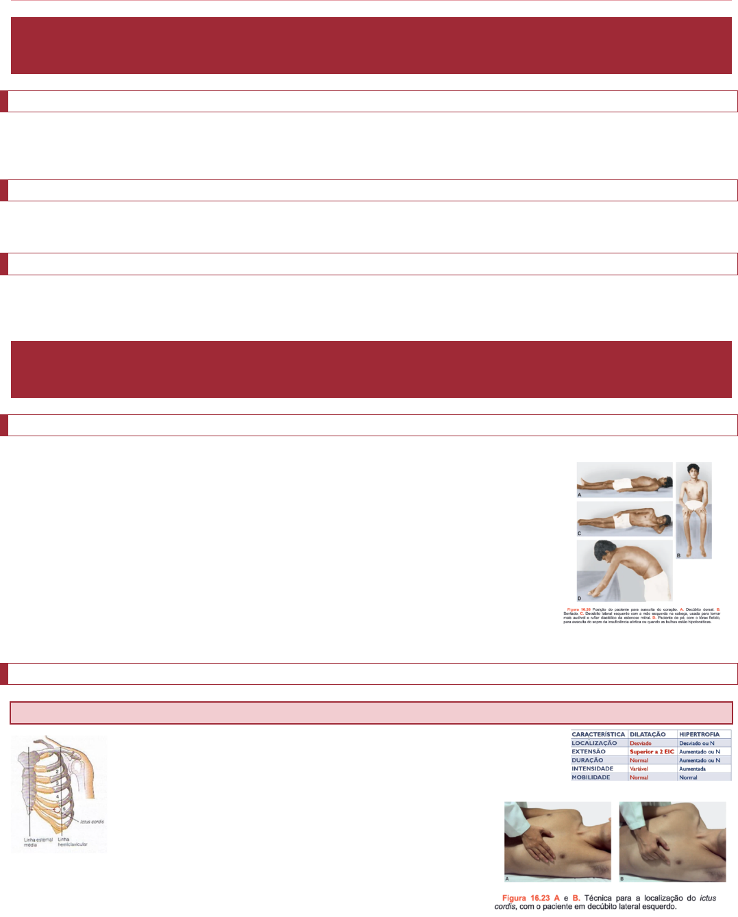 Daniella Machado TURMA XXVI Habilidades Clínicas IV: Módulo 1 Exame Físico do Coração – Interação do Organismo Humano e Drogas Geral do Sistema Cardiovascular Anatomia Circulação sistêmica. Sendo o grande ator: Ventrículo esquerdo. Artérias coronárias ramos da aorta, sendo a aorta ramificando em carótida comum esquerda. Tronco celíaco - celíaco comum - ilíaca comum – ilíaca interna e externa. Fisiologia Sístole: abertura da aórtica e pulmonar e fechamento a mitral e tricúspide. Diástole: abertura da mitral e tricúspide e fechamento a aórtica e pulmonar Pulso e pressão arterial As grandes artérias transformam o fluxo pulsátil em um fluxo mais constante, expandindo-se durante a sístole para amortecer a ejeção do sangue e recuando passivamente durante a diástole para impelir o sangue para a circulação periférica. Exame Físico Inspeção Paciente em decúbito dorsal. Olhar o Precórdio! Olhar Tangencial: examinador de pé do lado direito do paciente. Olhar Frontal: examinador junto aos pés do paciente que permanece deitado. Abaulamentos Lesões cutâneas Cicatriz Ictus Cordis Estase jugular (insuficiência cardíaca direita) Cianose Hipocratismo digital: unhas - vidro de relógio e dedo em baqueta de tambor Tórax: batimento do ventrículo direito e ictus cordis Edemas: MMII Palpação Ictus Cordis o Frequência o Ritmo o Extensão o Localização: 4-5º EICE LHC, com 1-2 espaços intercostais com mobilidade de 1 cm, pode estar alterado no derrame pleural, depressão do esterno e elevação do diafragma (ascite ou obesidade). Em 30% da população mundial, o ictus cordis não é palpável. o Intensidade e forma de impulsão o Mobilidade (choque de ponta) Exame Físico do Coração – Módulo 1 Daniella Machado Habilidades Clínicas – 4º período UniEVANGÉLICA TURMA XXVI 2 Batimento do Ventrículo Direito Localização: 3º-5º EIC. Técnica: mão em garra, suave, com apneia pós inspiratória. Objetivo: estimar aumento da cavidade (por causa da hipertensão pulmonar). Diferencial: retração do ventrículo esquerdo. Impulsões sistólicas do oco esternal Pessoas sem anormalidades. Estados hipercinéticos. Usa-se as polpas digitais de maneira suave no local Causas: Coarctação da aorta, dilatação da aorta, doença valvar aórtica, hipertensão arterial sistêmica Bulhas São mais bem avaliadas na ausculta. Se forem perceptíveis à palpação traduzem alteração do aparelho valvar correspondente (exceções fisiológicas). Frêmito Cardiovascular ou Catário Percepção tátil do conjunto de vibrações (coração e vasos) que formam o sopro. o Localização (usa-se como referência as áreas de ausculta) o Fase do ciclo cardíaco o Intensidade (com cruzes + até ++++) o Irradiação o Duração *Não é realizado a percussão: pelo baixo valor clínico. Ausculta Ausculta do Precórdio com Estetoscópio Técnica: ambiente silencioso. Sequência lógica. Posição confortável, deitado, sentado ou em decúbito lateral esquerdo, ou manobra de Pachon: paciente em decúbito lateral esquerdo com a mão sobre a cabeça. Sons de baixa frequência (30-150 Hz): cânula aplicada suavemente sobre o tórax. Sons de alta frequência: diafragma firmemente sobre o tórax. Focos da Ausculta Cardíaca Aórtico: 2º EICD junto ao esterno Pulmonar: 2º EICE Acessório aórtico: 3º EICE, junto ao esterno. Tricúspide: base do apêndice xifoide, ligeiramente para a esquerda. Mitral ou Bicúspide: é o ictus cordis, no 5º EICE. Devem ser avaliadas também: o Região paraesternal direita e esquerda o Pescoço e Axila o Região infraclavicular o Região interescapular B1 (TUM) Uma série de vibrações e intensidade variada originadas do fechamento das valvas mitral e tricúspide (atrioventriculares). Coincide com o pulso arterial. Mais grave e com maior duração que a segunda bulha. Maior intensidade no foco mitral. Exame Físico do Coração – Módulo 1 Daniella Machado Habilidades Clínicas – 4º período UniEVANGÉLICA TURMA XXVI 3 Intensidade Anatomia torácica: hiperfonese (diâmetro diminuído do tórax) e hipofonese (obesidade, enfisema pulmonar). Velocidade de elevação da pressão ventricular: hiperfonese (estados hiperdinâmicos como febre, anemia e exercício) e hipofonese (baixo DC, como choque, cardiomiopatia e bloqueio do ramo esquerdo) Amplitude da incursão dos folhetos: hiperfonese (estenose mitral, mixoma atrial e P-R curto) e hipofonese (P- R longo, insuficiência aórtica grave). Rigidez dos folhetos: hiperfonese (valva mitral com degeneração mixomatosa e folhetos amplos) e hipofonese (estenose mitral calcificada). Desdobramento da Primeira Bulha Mínimo desdobramento pode ser percebido em indivíduos normais, na porção inferior da borda esternal esquerda. Desdobramento amplo ocorre em razão do retardo do componente tricúspide – foco tricúspide. B2 (TÁ) É formada pelos componentes aórticos (fecha primeiro) e pulmonar pela tensão e desaceleração do sangue e do movimento valvar quando do seu fechamento. Melhor auscultada no foco aórtico com timbre agudo. Ela é mais aguda e seca. Intensidade Anatomia torácica: hiperfonese (espessura diminuída) e hipofonese (obesidade e enfisema pulmonar). Velocidade de elevação da pressão ventricular: hiperfonese ou hipofonese. Pressão arterial sistêmica/pulmonar: hiperfonese (HAS ou pulmonar) e hipofonese (hipofluxo pulmonar). Relação espacial grandes vasos/parede torácica: hiperfonese (dilatação da aorta ou pulmonar) ou hipofonese. Rigidez dos folhetos: hipofonese ou hiperfonese. Desdobramento Inspiratório ou Fisiológico da segunda bulha Auscultadas no foco pulmonar (TLÁ). Avaliação utilizando as fases da respiração, apnéia pós inspiratória e apnéia pós expiratória. Avaliação das bulhas Regularidade: arritmias são perturbações do ritmo do coração (extrassístoles, taquicardias, bradicardias, ritmo de FA etc.), 60-100 bpm. 2T (binário), 3T (tríplice) Intensi