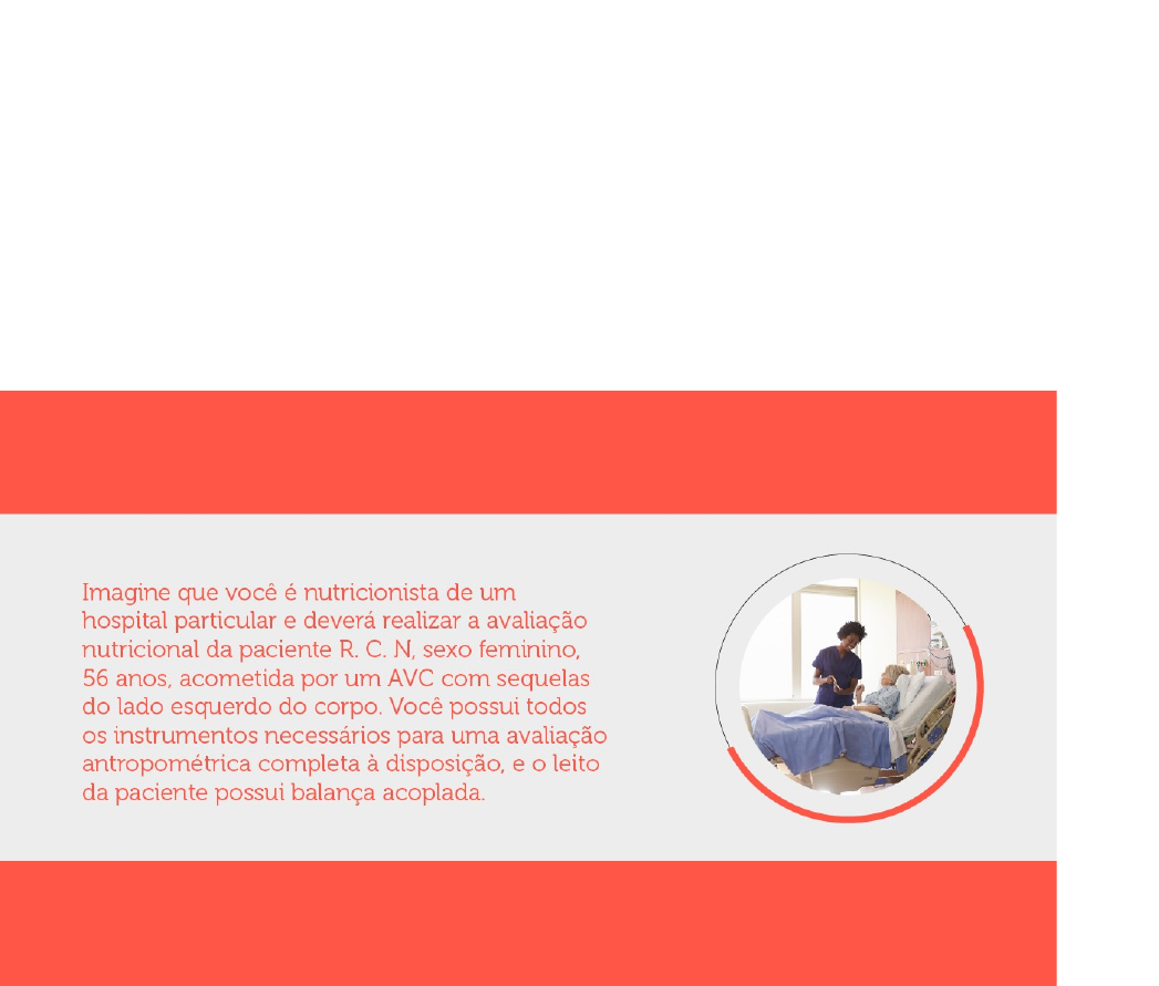 Avaliação Antropométrica Desafio O Acidente Vascular Encefálico (AVE) é uma patologia cardiovascular caracterizada pela súbita diminuição das funções neurológicas, causada pelo entupimento ou rompimento de um ou mais vasos sanguíneos cerebrais, podendo levar à morte. Seus principais sintomas são: fraqueza, paralisia ou adormecimento, geralmente, de um lado do corpo, além de dores na cabeça, tontura, confusão mental e perda de visão. Por essas razões, o paciente é pouco colaborativo, dificultando o trabalho da equipe de saúde e, principalmente, do nutricionista, no que se refere à avaliação antropométrica e nutricional. Diante das informações apresentadas, descreva como você procederia para avaliar o estado nutricional da paciente, com base no seu Índice de Massa Corporal (IMC). Explique, de forma detalhada, o motivo de suas escolhas com relação às outras opções disponíveis nesse caso. Padrão de resposta esperado Para traçar o perfil nutricional da paciente, é indicado que o nutricionista realize a avaliação antropométrica, com base nas possibilidades oferecidas de acordo com seu estado clínico, mesmo que todos os instrumentos de avaliação antropométrica estejam disponíveis. Para estabelecer o estado nutricional da paciente segundo o cálculo do IMC, deve-se levar em consideração as variáveis presentes; são elas: o peso e a estatura. Como a paciente se encontra em um leito com balança, a variável peso não precisará ser medida ou estimada, já que ela não seria capaz de levantar para ter seu peso aferido em uma balança tradicional. Com relação à estatura, essa variável não poderá ser diretamente mensurada, pois a paciente encontra-se acamada, portanto, precisará ser estimada de maneira indireta. Nesse caso, em que ela apresenta sequelas do AVE, que levaram à paralisia de um lado do corpo, gerando, assim, fraqueza e rigidez muscular, é preciso pensar nas técnicas existentes para a realização de medidas alternativas. Geralmente, para estimar a estatura de um paciente, pode-se optar pela medida da altura do joelho, a envergadura ou meia envergadura e, até mesmo, realizar a medida da altura recumbente. No caso da paciente em questão, seria mais indicado realizar a medida da meia envergadura e multiplicá-la por dois, para poder estimativa sua altura, já que a medição da envergadura (extensão total dos braços) poderia se tornar difícil e imprecisa, visto que ela apresenta paralisia e provável rigidez muscular no lado esquerdo do corpo. Poderia, ainda, ser medida a altura recumbente, ou seja, com o leito em posição deitada. Entretanto, é importante verificar se a paciente encontra-se em condições de ter seu leito completamente deitado. Em último caso, existiria a possibilidade de estimar a altura do paciente a partir da aferição da altura do joelho e a aplicação de equações com base no sexo e na idade da paciente. Tal medida poderia ser realizada na perna direita (e muitos pesquisadores indicam padronizar a mensuração neste lado do corpo). Contudo, para uma avaliação com maior acurácia dessa medida, outros autores indicam analisar o lado esquerdo do corpo, com a perna em um ângulo de 90°, o que poderia, nesse caso, gerar certa dificuldade na avaliação.
