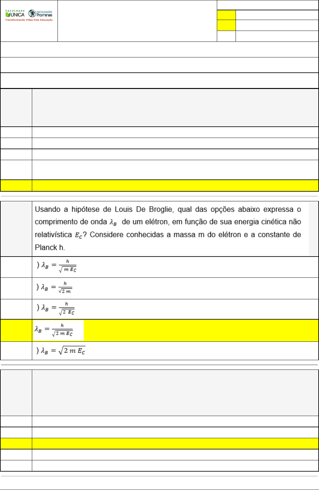 Pincel Atômico - 27/07/2023 10:55:55 1/4 RÔMULO FREIRE SPINELLI Avaliação Online (SALA EAD) Atividade finalizada em 05/06/2022 14:10:26 (369233 / 1) LEGENDA Resposta correta na questão # Resposta correta - Questão Anulada X Resposta selecionada pelo Aluno Disciplina: INTRODUÇÃO À FÍSICA MODERNA [231191] - Avaliação com 10 questões, com o peso total de 50,00 pontos [capítulos - 1,2,3,4,5,6] Turma: Segunda Graduação: Física para Licenciados - Grupo: JULHO/2021 - SGFISLIC/JUL/21 [23201] Aluno(a): 91230075 - RÔMULO FREIRE SPINELLI - Respondeu 8 questões corretas, obtendo um total de 40,00 pontos como nota [359309_1554 20] Questão 001 (AOCP – 2019) Um elétron está com velocidade constante no vácuo quando penetra na região central entre duas placas condutoras paralelas separadas pela distância de 20cm. Se a diferença de potencial elétrico entre as placas for 200V, é correto afirmar que (Considere a carga elementar e = 1,6.10-19 C.) o campo elétrico não realiza trabalho sobre o elétron. Todas as alternativas acima estão corretas. o movimento da partícula continuará sendo retilíneo e uniforme. a trajetória do elétron poderá ser retilínea em algum instante, na região entre as placas. X a força elétrica ao qual o elétron estará submetido é 1,6.10-16 N. [359309_1554 27] Questão 002 X [359309_1553 98] Questão 003 (IBFC) Em 1924, o físico francês Louis De Broglie (1892- 1987) propôs que uma partícula poderia apresentar propriedades ondulatórias e corpusculares. Este modelo, chamado de dualidade partícula-onda, não foi amplamente aceito na ocasião, mas atualmente é empregado em diversos equipamentos, incluindo em microscopia. Assinale a alternativa que apresente um equipamento que não faça uso deste modelo. nenhuma das alternativas. Microscópio eletrônico de transmissão. X Microscópio de força atômica. Microscópio eletrônico de tunelamento. Microscópio eletrônico de varredura. Pincel Atômico - 27/07/2023 10:55:55 2/4 [359309_1322 84] Questão 004 Em uma prova de Física Moderna, um aluno precisa verificar a validade do princípio da incerteza de Heisenberg. Nesse contexto, é preciso que, dado a função de onda solução da equação de Schröedinger, ele calcule o valor esperado do operador momento. Sabe-se que o valor esperado de um determinado operador qualquer é matematicamente dado por, Baseado nessas afirmações, marque a alternativa correta em relação ao valor esperado do operador momento. X [359309_1554 04] Questão 005 (UDESC 2010) Analise as afirmativas abaixo, relativas à explicação do efeito fotoelétrico, tendo como base o modelo corpuscular da luz. I – A energia dos fótons da luz incidente é transferida para os elétrons no metal de forma quantizada. II – A energia cinética máxima dos elétrons emitidos de uma superfície metálica depende apenas da frequência da luz incidente e da função trabalho do metal. III – Em uma superfície metálica, elétrons devem ser ejetados independentemente da frequência da luz incidente, desde que a intensidade seja alta o suficiente, pois está sendo transferida energia ao metal. Assinale a alternativa correta. Todas as afirmativas são verdadeiras. Somente a afirmativa II é verdadeira. Somente a afirmativa III é verdadeira. X Somente as afirmativas I e II são verdadeiras. Somente as afirmativas I e III são verdadeiras. [359310_1322 27] Questão 006 Quanta é o nome dado ao que ficou, posteriormente conhecido, como, fóton. Esse conceito nada mais é do que partículas carregadas pelas ondas eletromagnéticas. Em termos de energia, foi descoberto que a energia dos fótons só poderia assumir valores bem definidos e discretos dados por: E= mgh. E= iħx. E= mv2/2. X E=hf. E= kx. Pincel Atômico - 27/07/2023 10:55:55 3/4 [359310_1322 80] Questão 007 X F, V, F, V. F, F, V, V. F, V, V, V. V, F, V, F. F, V, V, F. [359310_1322 29] Questão 008 Durante a fase de construção de uma nova teoria quântica, existia uma diferença muito grande entre gráficos experimentais e os construídos pelas teorias até então desenvolvidas. Nesse contexto, foi necessário que Planck assumisse um postulado, até então improvável, mas que se mostrou extremamente eficiente. De acordo com as informações acima, marque a alternativa correta em relação a energia dos elétrons e a ideia utilizada por Planck. Os sistemas de elétrons carregados se assemelha bastante com os sistemas formados por buracos negros. A segunda lei de Newton, para partículas subatômicas, no mundo quântico era violada. Planck imaginou que cada elétrons com energia suficiente, era capaz de criar uma outra partícula que o aniquilava. X Planck teve a ideia de considerar os elétrons como um sistema de oscilador massa- mola. Pincel Atômico - 27/07/2023 10:55:55 4/4 Nesse caso, Planck assumiu a violação do princípio da conservação da energia. [359311_1322 38] Questão 009 O sistema de oscilador massa-mola é um dos mais eficientes em toda a física. Esse sucesso está no fato de que muitos sistemas físicos, inclusive os quânticos, podem ser, sob boa aproximação, descritos por tal sistema. Em termos de energia, os elétrons emissores de radiação são caracterizados por violarem o princípio da conservação da energia. X a energia dos elétrons se assemelha a energia de um sistema de oscilador harmônico em que a energia potencial é dada por, E= kx2/2. o excesso de energia é utilizado para que o elétron choque com outros dentro do mesmo material, quando incidido luz. Não faz sentido comparar o oscilador harmônico, que é um sistema clássico, com partículas subatômicas, que são sistemas quânticos. transformarem sua massa em energia luminosa. [359311_1322 82] Questão 010 A asserção I é uma proposição verdadeira, e a II é uma proposição falsa. As asserções I e II são proposições falsas. As asserções I e II são proposições verdadeiras, mas a II não é uma justificativa co