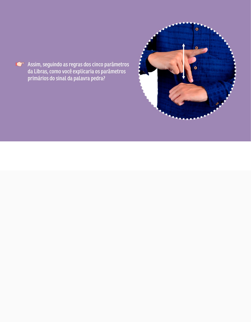Desafio A composição das palavras na Língua Brasileira de Sinais está regida por uma estrutura gramatical particular, visto que apresenta características lexicais específicas. Os parâmetros são as partes menores que compõem os sinais da Libras. Se um falante da língua de sinais articular um sinal de forma inadequada, é possível dizer que ele se equivocou quanto ao uso da configuração de mão. Imagine que você está em um seminário sobre as características fonológicas da Libras e precisa passar um exemplo aos presentes no evento. Explique: a) A configuração de mão. b) O ponto de articulação. c) O movimento. Sua resposta a) Configuração de mão: A configuração de mão é um dos parâmetros da Língua Brasileira de Sinais (Libras) e se refere à forma como as mãos são posicionadas e moldadas para produzir os sinais. Na imagem apresentada, a configuração de mão mostra os dedos da mão direita estendidos, enquanto os dedos da mão esquerda estão dobrados. Essa configuração específica é utilizada para representar o sinal de "irmão" na Libras. b) Ponto de articulação: O ponto de articulação é outro parâmetro da Libras e diz respeito ao local em que as mãos são posicionadas em relação ao corpo ou ao espaço ao redor. Na imagem, o sinal "irmão" é articulado próximo ao lado esquerdo do peito. Esse ponto específico de articulação é importante para diferenciar o sinal "irmão" de outros sinais com configurações de mão semelhantes. c) Movimento: O movimento é o terceiro parâmetro da Libras e se refere ao movimento das mãos durante a produção do sinal. Na imagem, o sinal "irmão" é produzido com um movimento de báscula, que consiste em um movimento para frente e para trás, com as mãos mantendo a mesma configuração ao longo do movimento. Esses três parâmetros combinados - configuração de mão, ponto de articulação e movimento - são cruciais na formação dos sinais da Libras e na diferenciação de palavras e conceitos dentro dessa língua. O uso adequado desses parâmetros é fundamental para a comunicação clara e efetiva na Língua Brasileira de Sinais. Enviado em: 27/07/2023 19:37 Padrão de resposta esperado a) De acordo com os cinco parâmetros em Libras, o sinal da palavra pedra tem como configuração de mão as letras P, K ou H. b) O ponto de articulação do sinal é “mão”. c) De acordo com a seta apresentada na imagem, o sinal tem movimento para cima e para baixo. 1. A gramática da Libras apresenta algumas características lexicais específicas. Os parâmetros são as partes mínimas que compõem os sinais da Libras. Se um falante da língua articular um sinal em local diferente do descrito na gramática, é possível dizer que ele se equivocou quanto ao ponto de articulação (PA). Tendo como base o contexto apresentado, quando o falante não faz o desenho (formato) da mão de forma correta, é possível dizer que ele: A. equivocou-se quanto ao direcionamento, uma vez que este é responsável por apontar os sujeitos da oração. B. equivocou-se quanto ao movimento, pois a mão do sinalizador representa o objeto, enquanto o espaço é a área de articulação. C. equivocou-se quanto à configuração de mão, pois esta indica o verdadeiro formato que a mão deverá tomar no momento de idealizar o sinal. D. equivocou-se quanto à orientação, pois esta é responsável por concordar com os significantes da oração ou do período. E. equivocou-se quanto às expressões corporais e faciais, pois estas funcionam como meio visual de reforçar uma ideia que está sendo transmitida. C. equivocou-se quanto à configuração de mão, pois esta indica o verdadeiro formato que a mão deverá tomar no momento de idealizar o sinal. Na Língua Brasileira de Sinais (Libras), a configuração de mão é um dos parâmetros que compõem os sinais. Refere-se ao formato específico que a mão assume durante a produção do sinal. Se o sinalizador não fizer a configuração de mão correta, isso pode resultar em um sinal diferente ou em dificuldade de compreensão do que está sendo comunicado. Portanto, o equívoco no formato da mão é referente à configuração de mão. Parte superior do formulário 2. Em uma conversa informal entre um frentista que não conhece Libras e um surdo sinalizador, foram utilizados diversos sinais. Sabe-se que o ideal seria o frentista, assim como qualquer outro profissional, atender ou se comunicar com o surdo utilizando a língua de sinais. Tendo como base o pouco conhecimento do frentista e o amplo entendimento da informação, é possível afirmar que o surdo utilizou um grupo de vocabulário de sinais que facilitou a comunicação. Qual é esse tipo de sinal? Qual é a justificativa? A. Sinal numérico, pois esses sinais simulam a realidade dos fatos, são de fácil entendimento, sendo simples de identificar as informações passadas por eles. B. Sinal icônico, pois esse tipo de sinal representa a realidade, sendo de fácil entendimento. Pessoas que desconhecem a Libras podem entender as informações passadas por esse tipo de sinal. C. Sinal soletrado, pois cada sinal soletrado representa amplamente a realidade. Qualquer pessoa pode identificar as informações passadas por esse tipo de sinal, mesmo que não conheça a Libras. D. Sinal arbitrário, pois esses sinais representam a realidade, sendo de fácil entendimento. Qualquer pessoa pode identificar as informações passadas por esse tipo de sinal, mesmo que não conheça a Libras. E. Sinal imitado, pois esse tipo de sinal representa a realidade como ela é. É de fácil entendimento; mesmo não tendo experiência diária com os surdos, é possível entender as informações passadas por esta via. B. Sinal icônico, pois esse tipo de sinal representa a realidade, sendo de fácil entendimento. Pessoas que desconhecem a Libras podem entender as informações passadas por esse tipo de sinal. Os sinais icônicos na Língua Brasileira de Sina