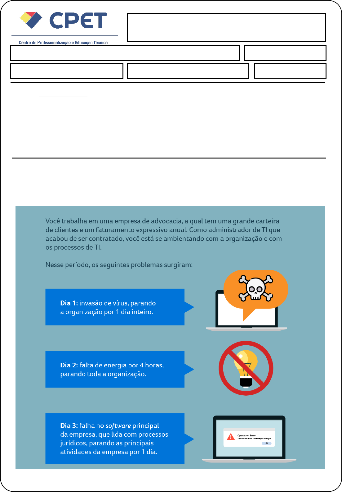 Atividade Prática Por mais que uma organização trabalhe arduamente para minimizar o risco, este sempre estará presente. Nesse sentido, preparar a empresa para que continue a operar em meio ao desastre é o objetivo de um PCN ou plano de contingência. Gestão de Projetos e prevenções Aluno (a): Cinthia Dejanini Moura Góes Data: 06/06/2023 Atividade Prática Final NOTA: INSTRUÇÕES: Esta Avaliação contém 1 (uma) questão, totalizando 10 (dez) pontos. Você deve preencher dos dados no Cabeçalho para sua identificação o Nome / Data de entrega As respostas devem ser digitadas abaixo de cada pergunta. Ao terminar, grave o arquivo com o nome Avaliação Pesquisa/Prática. Envio o arquivo pelo sistema. Atividade Prática Como administrador de TI, quais saídas você poderia propor visando a garantir que a empresa continue a funcionar e a evitar a ocorrência desses desastres? Primeiro precisamos deixar de focar no que ocorreu e seguir com visão a frente, focar nas principais estratégias para que não ocorra falhas como essas novamente. Precisamos reunir todo os possiveis riscos futuros e obter soluções a todas elas, assim construindo um plano de contingencia. Primeiro passo é conferir como está a estrutura do T.I , se necessário realizar mudanças na mesma de forma a focar nas estratégias, inibir ao máximo quaisquer possíveis falhas. Para iniciar a listagem devemos verificar a falha e principalmente o que será feito para evitar que aconteça novamente. 1- Falta de Energia: A solução é simples, um gerador resolve , pois há necessidade de uma fonte energia extra para evitar a falha.; 2- Invasão de Virus: Instalação de Anti vírus capaz de bloquear qualquer entrada de ameaça e instalação de backup; 3- Risco no Software: Além de necessidade de software de atualização recente, deve instalar backup e atualizações constantes, fazendo com que se houver qualquer problema em um software ,haja outro atualizado de reserva como outra opção. Sendo assim o T.I será a peça chave de nutrição de informação para as demais áreas. A inovação vai tomar a frente , com sugestões e implementações de Software cada vez mais novos, aumentando assim a proteção e segurança evitando falhas e possíveis invasões, facilitando e aprimorando os interesses na parte de gestão da empresa e fazendo com que isso surta efeito principalmente no resultado final.