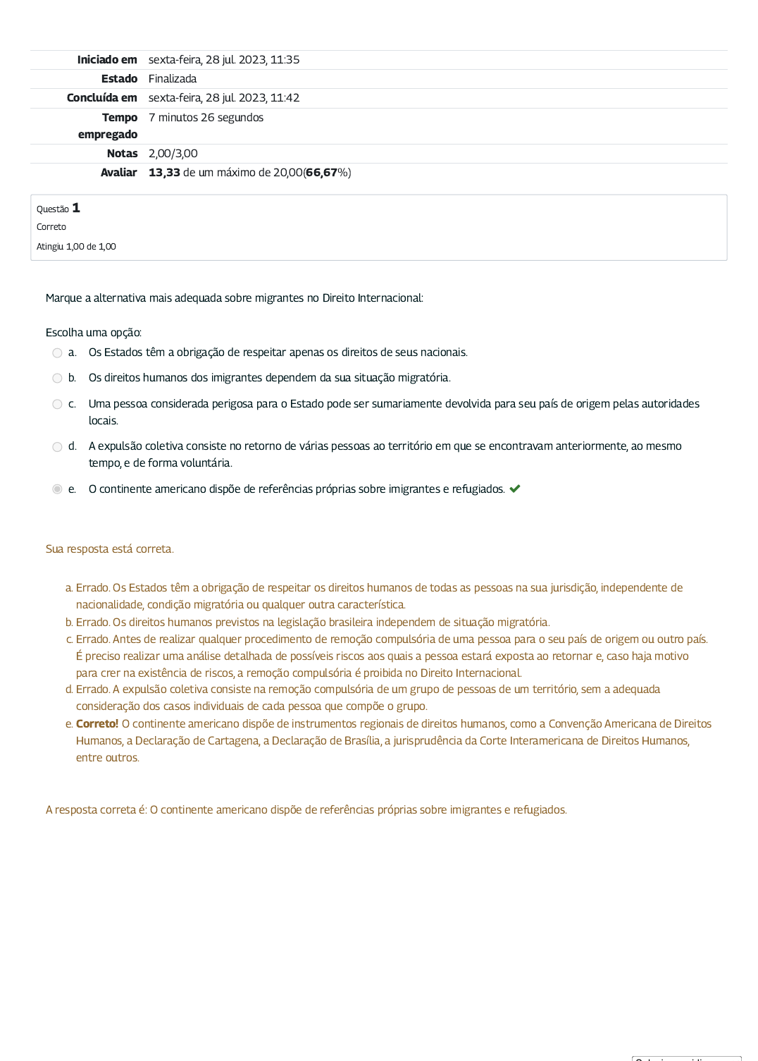 Iniciado em sexta-feira, 28 jul. 2023, 11:35 Estado Finalizada Concluída em sexta-feira, 28 jul. 2023, 11:42 Tempo empregado 7 minutos 26 segundos Notas 2,00/3,00 Avaliar 13,33 de um máximo de 20,00(66,67%) Questão 1 Correto Atingiu 1,00 de 1,00 Marque a alternativa mais adequada sobre migrantes no Direito Internacional: Escolha uma opção: a. Os Estados têm a obrigação de respeitar apenas os direitos de seus nacionais. b. Os direitos humanos dos imigrantes dependem da sua situação migratória. c. Uma pessoa considerada perigosa para o Estado pode ser sumariamente devolvida para seu país de origem pelas autoridades locais. d. A expulsão coletiva consiste no retorno de várias pessoas ao território em que se encontravam anteriormente, ao mesmo tempo, e de forma voluntária. e. O continente americano dispõe de referências próprias sobre imigrantes e refugiados. Sua resposta está correta. a. Errado. Os Estados têm a obrigação de respeitar os direitos humanos de todas as pessoas na sua jurisdição, independente de nacionalidade, condição migratória ou qualquer outra característica. b. Errado. Os direitos humanos previstos na legislação brasileira independem de situação migratória. c. Errado. Antes de realizar qualquer procedimento de remoção compulsória de uma pessoa para o seu país de origem ou outro país. É preciso realizar uma análise detalhada de possíveis riscos aos quais a pessoa estará exposta ao retornar e, caso haja motivo para crer na existência de riscos, a remoção compulsória é proibida no Direito Internacional. d. Errado. A expulsão coletiva consiste na remoção compulsória de um grupo de pessoas de um território, sem a adequada consideração dos casos individuais de cada pessoa que compõe o grupo. e. Correto! O continente americano dispõe de instrumentos regionais de direitos humanos, como a Convenção Americana de Direitos Humanos, a Declaração de Cartagena, a Declaração de Brasília, a jurisprudência da Corte Interamericana de Direitos Humanos, entre outros. A resposta correta é: O continente americano dispõe de referências próprias sobre imigrantes e refugiados. S l i idi Questão 2 Incorreto Atingiu 0,00 de 1,00 O princípio de não devolução é considerado essencial para a proteção dos direitos humanos, mas não pode ser invocado para proteger as pessoas migrantes de ameaças: Escolha uma opção: a. À sua vida. b. De sofrer tortura no país de origem. c. De serem submetidas a trabalho forçado no país de origem. d. De dano irreparável à criança migrante. e. De responder a uma ação judicial no país de origem, desde que respeitado o devido processo legal. Sua resposta está incorreta. a. Errado. O princípio de não devolução se aplica para proteger em caso de ameaça à vida. b. Errado. O princípio de não devolução se aplica para proteger em caso de tortura no país de origem. c. Errado. O princípio de não devolução se aplica para proteger em caso de submissão ao trabalho forçado no país de origem. d. Errado. O princípio de não devolução se aplica para proteger em caso de dano irreparável à criança migrante. e. Correto! Responder a uma ação judicial no país de origem, desde que respeitado o devido processo legal, não é caso em que se aplica o princípio da não devolução. A resposta correta é: De responder a uma ação judicial no país de origem, desde que respeitado o devido processo legal. Selecione o idioma Powered by Tradutor https://translate.google.com/ Questão 3 Correto Atingiu 1,00 de 1,00 Embora os Estados possam decidir sobre a entrada de não nacionais no seu território, o Direito Internacional dos Direitos Humanos proíbe: Escolha uma opção: a. A análise individual dos pedidos de regularização migratória. b. A expulsão coletiva de migrantes. c. O direito a buscar refúgio. d. A expulsão de várias pessoas ao mesmo tempo após análise e decisão individual em cada caso. e. O respeito ao princípio de não devolução. Sua resposta está correta. a. Errado. O Direito Internacional dos Direitos Humanos não proíbe a análise individual dos pedidos de regularização migratória. b. Correto! A expulsão coletiva de migrantes, sem a análise individual dos casos, é proibida pelo Direito Internacional dos Direitos Humanos. c. Errado. O Direito Internacional dos Direitos Humanos protege o direito a buscar refúgio. d. Errado. O Direito Internacional dos Direitos Humanos não proíbe a expulsão de várias pessoas ao mesmo tempo após análise e decisão individual em cada caso. e. Errado. O Direito Internacional dos Direitos Humanos protege o respeito ao princípio de não devolução. A resposta correta é: A expulsão coletiva de migrantes.