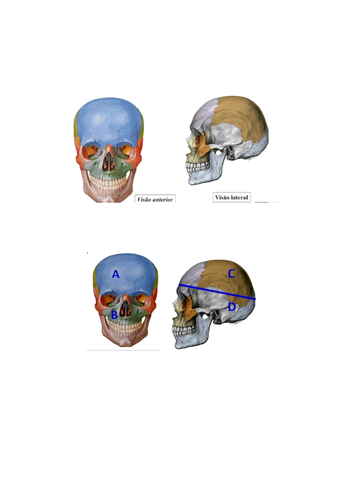 Ossos da cabeça ● Parte do esqueleto axial ● Estudo da cabeça óssea Crânio (A) Neurocrânio (B) Calota craniana (C) Base do crânio (D) Base do crânio - Tem parte mais alta e parte mais baixa - As elevações são chamadas de fossas cranianas - 3 fossas ➔ Anterior → Sentido ântero-posterior. Limite anterior é a crista frontal e o limite posterior é a asa menor do esfenóide. ➔ Média → Limite anterior é a asa menor do esfenóide e o limite posterior é a porção petrosa do osso temporal ➔ Posterior → Limite anterior é a porção petrosa do osso temporal e o limite posterior é o osso occipital Fossa anterior 1. Lâmina crivosa do etmóide (ou lâmina cribiforme) → tem perfurações 2. Buraco óptico (ou forame óptico) OBS: Neles passam nervos cranianos Fossa média 3. Fissura orbitária superior (ou fenda esfenoidal) 4. Forame grande redondo 5. Forame oval (posteriormente tem forame espinhoso e mais centralmente tem canal carotídeo) Fossa posterior 6. Meato acústico interno 7. Forame jugular (grande abertura onde passa medula espinal) 8. Canal hipoglosso Osso da base do crânio - Frontal ➔ Forma terço superior do crânio ➔ Região média e anterior da calota craniana ➔ Forma a fronte o teto da órbita ocular ➔ Maior parte da fossa craniana anterior - Parietal ➔ São um par de ossos retangulares, curvos e achatados ➔ Ocupam parte lateral e superior da calota craniana ➔ Protege o lobo parietal do cérebro ➔ Fazem parte do neurocrânio - Temporal ➔ Osso par que forma laterais do crânio ou temporais ➔ É irregular ➔ Situa-se infero-lateralmente a caixa craniana ➔ Se articula com o côndilo da mandíbula - Occipital ➔ Osso ímpar mediano, simétrico e plano (chato) ➔ Localizado na região posterior e média do crânio ➔ Forma a base e a parte posterior da calota craniana - Esfenóide ➔ Situado na base do crânio ➔ Formato semelhante a uma borboleta ou morcego de asas abertas ➔ A porção central é constituída por tecido ósseo esponjoso, em que os espaços medulares estão preenchidos basicamente por tecido adiposo ➔ Não é osso da face do crânio, mas faz parte do viscerocrânio - Etmóide ➔ Osso único e mediano ➔ Juntamente com o frontal, parietais, temporais, occipital e esfenóide contribui para formar cavidade craniana e cavidade nasal ➔ Fica no centro do crânio, articulado com 15 ossos - Nasal ➔ Dois pequenos ossos finos que variam significativamente de tamanho e forma conforme a origem da pessoa e sua idade ➔ Eles estão dispostos lado a lado (geminados) na porção média e superior da face - Lacrimal ➔ Menor e mais frágil osso da face ➔ Situado na porção anterior da parede medial da órbita - Zigomático ➔ Osso par do crânio humano ➔ Forma parte da órbita ocular ➔ Conhecido como “osso da bochecha" ou “osso malar” ➔ Se articula com mais ossos do neurocrânio ➔ Único osso da face que ele se articula é o da maxila - Maxila ➔ Estrutura da região frontal do crânio ➔ Suporta dentes superiores ➔ Forma uma parte do palato, da cavidade nasal e da orbita ocular ➔ Únicos ossos do neurocrânio que ele se articula é o etmóide e o frontal - Palatino ➔ Osso par ➔ Situado atrás da cavidade nasal entre maxila e esfenóide ➔ Ele contribui na formação das paredes de três cavidades: a cavidade nasal, fissura labiopalatal e fissura orbital inferior - Osso concha nasal inferior ➔ Também chamado de corneto inferior ➔ Se estende horizontalmente ao longo da parede lateral da cavidade nasal ➔ Lamina de osso esponjoso, curvada em si mesmo ➔ Concha nasal superior e média são acidentes anatômicos do etmóide - Vômer ➔ Osso central do crânio dos cordados ➔ Forma maior parte da cavidade nasal ➔ Maior, proporcionalmente ao corpo, em animais com bom olfato - Mandíbula ➔ Componente móvel (Movimenta em 3 planos: sagital, frontal e transversal) do crânio ➔ Forma parte inferior da cabeça ➔ Se articula com temporal ➔ Único osso móvel da face