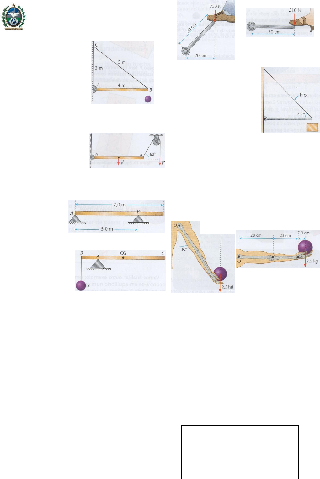 FAETEC - ETE FERREIRA VIANA LISTA EXERCÍCIOS DE FÍSICA ESTÁTICA- Fundamentos da Física 1. Ed. Moderna - 9a edição Prof.: Marcelo Diniz P.475. Uma barra homogênea de peso 100N é articulada em A e mantida em equilíbrio por meio do fio BC. Em B é suspenso um peso de 200N. Determine a intensidade da força que traciona o fio BC e a reação da articulação A (componentes horizontal e vertical). P.476. No sistema da figura abaixo, a barra é homogênea e de peso 20N. A polia e o fio são ideais. Determine: a) a intensidade da força que deve ser aplicada ao cabo para manter a barra horizontal: b) a reação do pino A. P.477. Uma barra homogênea de peso P = 50N é apoiada nos pontos A e B. Determine as reações dos apoios sobre a barra. P.478. A barra homogênea BC da figura tem um peso P de 105N e seu comprimento é de 10m. O centro de gravidade CG e o ponto de apoio A da barra estão, respectivamente, a 5m e 2m da extremidade B. Qual é, em newtons, o peso do corpo X que deve ser suspenso ao ponto B para manter a barra em equilíbrio na posição horizontal? P482. (UFRJ) Um jovem e sua namorada passeiam de carro por uma estrada e são surpreendidos por um furo num dos pneus. O jovem, que pesa 750N, pisa a extremidade de uma chave de roda, inclinada em relação à horizontal, como mostra a figura a, mas só consegue soltar o parafuso quando exerce sobre a chave uma força igual a seu peso. A namorada do jovem, que pesa 510N, encaixa a mesma chave, mas na horizontal, em outro para-fuso, e pisa a extremidade da chave, exercendo sobre ela uma força igual a seu peso, como mostra a figura b. Supondo que este segundo parafuso esteja tão apertado quanto o primeiro, e levando em conta as distâncias indicadas nas figuras, verifique se a moça consegue soltar esse segundo parafuso. Justifique sua resposta. P.483. (UFPE) Uma barra horizontal de massa desprezível possui uma de suas extremidades articulada em uma parede vertical. A outra extremidade está presa à parede por um fio que faz um ângulo de 45° com a horizontal e possui um corpo de 55N pendurado. Qual o módulo da força normal à parede, em newtons, que a articulação exerce sobre a barra? T.382. (Vunesp) As figuras a e b indicam duas posições de um braço humano que tem na palma da mão uma esfera de 2.5kgf. As distancias entre as articulações estão indicadas na figura a. Nas condições das figuras a e b é possível afirmar que os torques (ou momentos das forças) em relação ao ponto O são respectivamente: Figura a Figura b a) 1,5 kgf . rn 7,3 . 10-1 kgf . m b) 1,5 kgf . m 3,7 . 10-1 kgf . m c) 5,1 kgf . m 3,7 . 10-1 kgf . m d) 5,1 kgf . m 7,3 . 10-1 kgf . m e) 7,3 . 10-1 kgf . m 5,1 kgf . m Figura a Figura b Figura a Figura b Respostas: P.475. T = 1.250/3N; XA =1.000/3N; YA = 50N P.476. a) F = 20 3 / 3 ; b) XA = 10 3 / 3 N ; YA = 10N P.477 YA = 15N; YB = 35N P.482. A moça consegue soltar o parafuso. P.483. 55N T.382 a