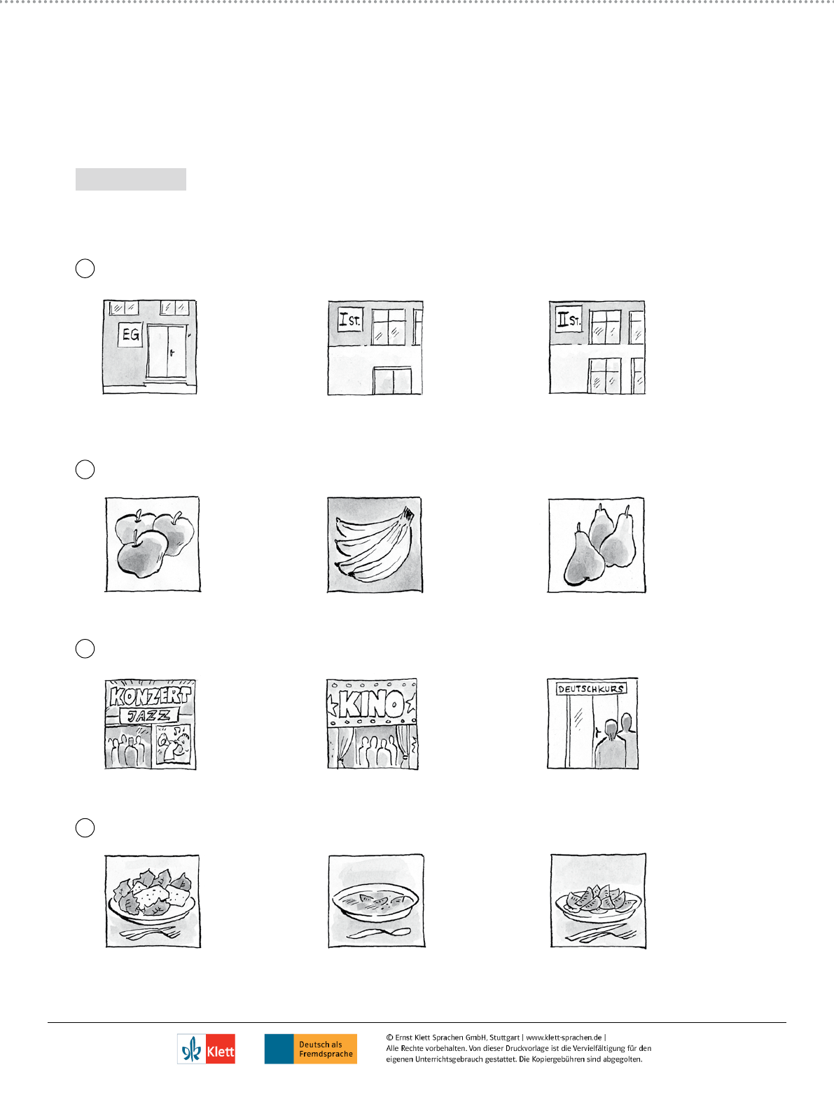 Start Deutsch 1 – Modelltest Hören Dieser Test hat drei Teile. Sie hören kurze Gespräche und Ansagen. Zu jedem Text gibt es eine Aufgabe. Lesen Sie zuerst die Aufgabe, hören Sie dann den Text dazu. Kreuzen Sie die richtige Lösung an. Schreiben Sie zum Schluss Ihre Lösungen auf den Antwortbogen. Hören – Teil 1 Kreuzen Sie an: a , b oder c . Sie hören jeden Text zweimal. Beispiel 0 Wo ist das Lehrerzimmer? a Im Erdgeschoss. b Im ersten Stock. c Im zweiten Stock. 1 Was ist heute im Sonderangebot? a Äpfel. b Bananen. c Birnen. 2 Wohin gehen Rosa und Antonio morgen Abend? a In ein Konzert. b Ins Kino. c In den Deutschkurs. 3 Was bestellt die Frau? a Salat mit Käse. b Tomatensuppe. c Tomatensalat. 74 75 X 76 77 78 Seite 4 Start Deutsch 1 – Modelltest Hören 4 Was hat Herr Bollack morgen? a Einen Termin mit der Chefi n. b Ein Familienfest. c Urlaub. 5 Wann fährt die Kundin in die Türkei? a Im Juli. b Im August. c Im September. 6 Wie hoch ist die Miete? a 460 . b 640 . c 614 . 79 80 81 Seite 5 Start Deutsch 1 – Modelltest Hören Hören – Teil 2 Kreuzen Sie die richtige Lösung an. Sie hören jeden Text einmal. Beispiel 0 Reisende nach Stuttgart sollen zu Gleis 4 gehen. richtig falsch 7 Herr Kurz soll schnell seinen Sohn abholen. richtig falsch 8 Die Fluggäste nach Brüssel müssen ihren Pass zeigen. richtig falsch 9 Die Fahrgäste sollen im Bus bleiben. richtig falsch 10 Die Kunden können noch eine halbe Stunde einkaufen. richtig falsch 82 83 84 85 86 Seite 6 Start Deutsch 1 – Modelltest Hören Hören – Teil 3 Kreuzen Sie an: a , b oder c . Sie hören jeden Text zweimal. 11 Was kostet die Reise? a 69 . b 96 . c 99 . 12 Wie viele Minuten hat Beate Verspätung? a 20 Minuten. b 30 Minuten. c 17 Minuten. 13 Wann soll die Frau in die Praxis gehen? a Am Freitag. b Am Donnerstag. c Am Mittwoch. 14 Was ist kaputt? a Der Computer. b Das Handy. c Der Fernseher. 15 Wo will der Mann die Frau treffen? a Am Bus. b Am Ausgang. c An der Information. Übertragen Sie Ihre Lösungen nun auf den Antwortbogen. 87 88 89 90 91 Seite 7