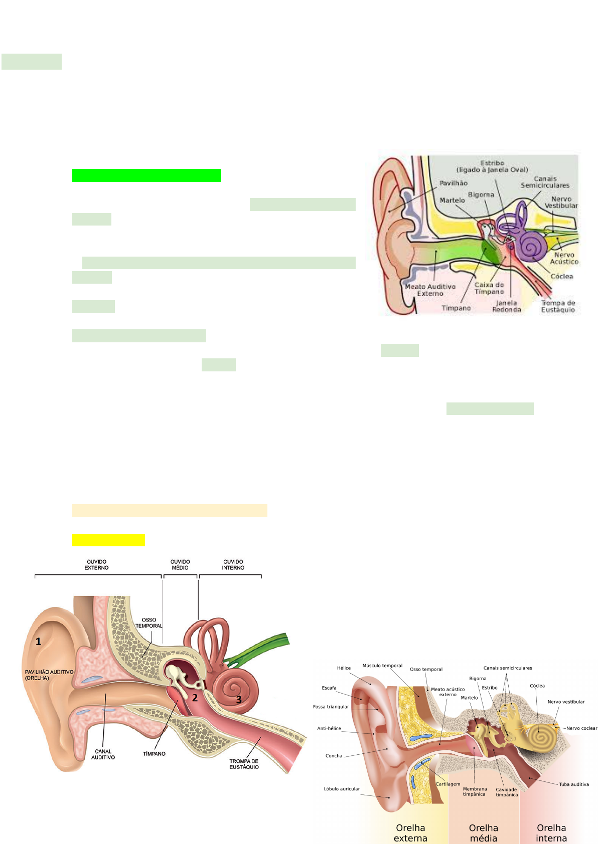 Carolina Pithon Rocha | Medicina | 5o semestre 1 Audiçã� Percepção sensorial: Orelha para ouvirmos, precisamos de um órgão sensorial que aqui é o ouvido com o pavilhão da orelha externa. O pavilhão auditivo que serve para captar o som que está propagando no ambiente, às dobras direcionam o som para o canal auditivo. o canal auditivo ou meato auditivo externo ou ouvido externo -> conduzir o som até a membrana timpânica. Som passa dentro do canal até alcançar o tímpano. tímpano - membrana fina que ao tocar o som, ela vibra. Essa vibração é provocada pela onda sonora. Martelo, bigorna, estribo - ossículos que empurram os ossos transmitindo a vibração de um pro outro. O Estribo está pela janela oval conectado à entrada da cóclea que tem uma série de canais dentro dela e está cheia de líquido (órgão receptor em formato de caracol). Quando vibração chega ao estribo, ele está tampando a entrada da cóclea, quando ele vibra, a sua vibração é transmitida no líquido dentro da cóclea que vai passear dentro da espiral acionando órgãos de cortis (células ciliadas dentro) -> que são sensores de vibração, amplificadores mecânicos, detecção sonora, transduzem o sinal em sinal nervoso -> nervo vestibular VIII (sendo equilíbrio,orientação) e acústico -> encéfalo, córtex -> córtex auditivo. A forma que as células ciliadas são pressionadas -> estímulos diferentes do som, grave, agudo... A deterioração das células ciliadas é a principal responsável pela perda auditiva. deficiência auditiva -> presbioacusia. Nosso ouvido Do ouvido externo até o fim do médio, é canal, trafegando informação. Diferença de intensidade do estímulo, frequência e timbre a partir do aparato. Isso tudo ocorre no ouvido interno (detecção propriamente dita na cóclea, ossos de corti). Carolina Pithon Rocha | Medicina | 5o semestre 2 ORELHA EXTERNA (captura energia mecânica) Pavilhão auricular - amplificador do som, colecta ondas sonoras do ambiente e direciona ao canal auditivo melhorando a potência e a condução da vibração. É um pré-amplificador natural e quanto maior a sua área, maior energia mecânica captada. Idosos: deficiência auditiva -> mão em forma de concha -> aumento da área efetiva do pavilhão auricular -> otimização captação do som e direciona para o pavilhão auditivo Meato acústico - tubo ressonador para sons da fala humana (2 a 5 KHz - nossa frequência de audição). Chegada da onda sonora na membrana timpânica -> ressonância -> transferência da energia mecânica -> orelha média -> cinética para movimento dos ossículos -> cóclea. ORELHA MÉDIA (transmite para o órgão receptor -> cóclea) se localiza entre orelha externa através da membrana timpânica e cóclea onde se encontra os 3 ossículos. Amplifica sinal acústico que chega de fora (ar) para dentro da cóclea (cheio de líquido) -> ponto principal da orelha média. Evita dissipação do som que não é mais pelo ar -> perdemos menos informação através dos ossos -> diminuindo a perda de energia -> impulso mais eficiente. A função da orelha média é igualar a impedância do ar fora da orelha com aquela da partição coclear, garantindo assim a transferência eficiente da energia do som do primeiro meio (o ar externo) para o segundo (o líquido coclear). É uma cavidade preenchida com ar, conectada à faringe pela tuba de Eustáquio. >> O comprometimento da estrutura normal da orelha média pode levar à perda auditiva por condução. Na primeira, os tecidos cicatriciais remanescentes de uma infecção da orelha média (otite média) podem imobilizar o tímpano ou os ossículos. Na segunda forma, uma proliferação do osso nos anexos ligamentares dos ossículos pode privá-los de sua liberdade normal de movimento. Essa condição crônica e de origem desconhecida é chamada de otosclerose, que pode levar à surdez grave. ORELHA INTERNA (transduz sinais elétricos adequados para análise pelo sistema nervoso) labirinto de membranas que fica dentro do osso temporal, forma a cóclea (cheia de líquido e com presença de células sensoriais auditivas que estão associadas aos órgãos de corti permitindo ser o órgão receptor) e o sistema vestibular. canais semi circulares acima da cóclea órgãos de corti - onde escutamos de fato, dispersos ao longo da membrana basilar. Microfones dá orelha (cada um reage com impulso elétrico em função de altura "frequência" e volume "intensidade" do som). Feixe de estereocílios (feixes de filamentos de actina interligados pelas proteínas plastina fimbrina) inicia a transdução mecanoelétrica ao ativas às células ciliadas. Um estímulo que desloca o feixe de cílios em direção à sua borda mais elevada abre canais adicionais, causando despolarização celular. Ao contrário, um estímulo que desloca o feixe em direção à sua borda mais baixa fecha aqueles canais que estão abertos em repouso, hiperpolarizando a célula. Carolina Pithon Rocha | Medicina | 5o semestre 3 RESUMO Captação do som pela orelha externa >> vibração do tímpano para dentro e para fora >> movimentação dos ossículos da orelha média >> movimento tipo pistão do estribo >> movimentação do líquido para cima e para baixo nas escalas cocleares >> movimentação não uniforme da membrana basilar >> transmissão da energia sonora até as células transdutoras >> gânglios cocleares >> nervo vestibulococlear! Carolina Pithon Rocha | Medicina | 5o semestre 4 SISTEMA DE AMPLIFICAÇÃO ACÚSTICA Cóclea martelo, bigorna e estribo são empurrados pelo tímpano -> ondas transitam dentro do órgão da cóclea entrando pela janela oval e dissipado pela janela redonda (têm outra membrana, timpano). Canal de entrada - escala vestibular, no meio temos a escala média e canal de saída - escala timpânica. A membrana de Reissner, ou membrana vestibular, separa a escala média da escala vestibular. Já a membrana basilar separa a escala média da es