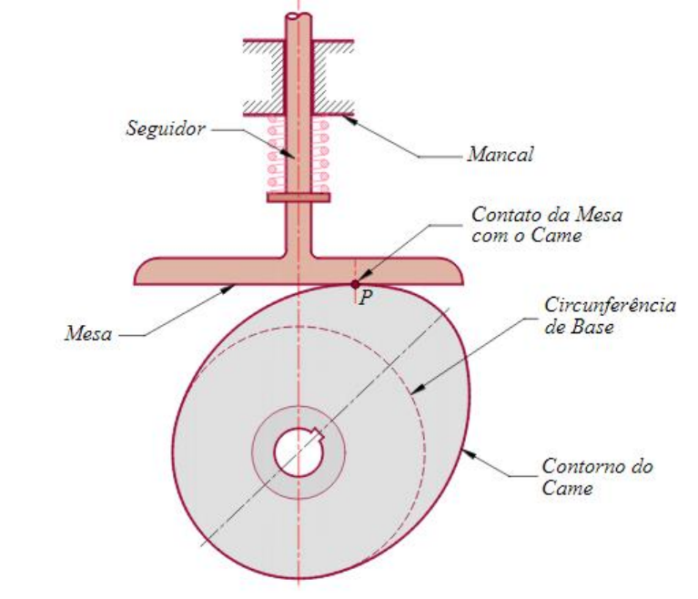Came Um came é uma peça giratória ou deslizante em uma ligação mecânica usada especialmente para transformar o movimento rotativo em movimento linear. Frequentemente, é uma parte de uma roda giratória (por exemplo, uma roda excêntrica) ou eixo (por exemplo, um cilindro com formato irregular) que atinge uma alavanca em um ou mais pontos em seu caminho circular. Figura 1: Came e seus elementos O came pode ser um dente simples, como é usado para fornecer pulsos de energia a um martelo a vapor, por exemplo, ou um disco excêntrico ou outra forma que produz um movimento alternativo suave (para frente e para trás) no seguidor, que é uma alavanca fazendo contato com a came. Um temporizador de came é semelhante e foi amplamente utilizado para controle de máquina elétrica (um temporizador eletromecânico em uma máquina de lavar sendo um exemplo comum) antes do advento de eletrônicos baratos, microcontroladores, circuitos integrados, controladores lógicos programáveis e controle digital. Os cames podem ser caracterizados por seus diagramas de deslocamento, que refletem a mudança de posição que um seguidor faria quando a superfície do came se mover em contato com o seguidor. No exemplo mostrado, o came gira em torno de um eixo. Esses diagramas relacionam a posição angular, geralmente em graus, ao deslocamento radial experimentado nessa posição. Os diagramas de deslocamento são tradicionalmente apresentados como gráficos com valores não negativos. Um diagrama de deslocamento simples ilustra o movimento do seguidor em um aumento de velocidade constante seguido por um retorno semelhante com uma pausa no meio. O aumento é o movimento do seguidor para longe do centro do came, a parada é o movimento onde o seguidor está em repouso e o retorno é o movimento do seguidor em direção ao centro do came. Um tipo comum é nos atuadores de válvula em motores de combustão interna. Aqui, o perfil do came é comumente simétrico e em velocidades rotacionais geralmente encontradas, desenvolvem-se forças de aceleração muito altas. Idealmente, uma curva convexa entre o início e a posição máxima de levantamento reduz a aceleração, mas isso requer diâmetros de eixo impraticáveis em relação ao levantamento. Assim, na prática, os pontos em que a sustentação começa e termina significam que uma tangente ao círculo de base aparece no perfil. Isso é contínuo com uma tangente ao círculo da ponta. Ao projetar o came, a elevação e o ângulo de contato θ são dados. Se o perfil for tratado como um grande círculo de base e um pequeno círculo de ponta, unidos por uma tangente comum, dando sustentação L, a relação pode ser calculada, dado o ângulo φ entre uma tangente e o eixo de simetria 2 2 − , enquanto C é a distância entre os centros dos círculos (obrigatório) e R é o raio da base (fornecido) e r aquele do círculo da ponta (obrigatório): 1 sin 1 sin eu C r R L = − = − − Disco ou prato de ressalto O came mais comumente usado é a placa de came (também conhecida como came de disco ou came radial), que é cortada de um pedaço de metal ou placa plana. Aqui, o seguidor se move em um plano perpendicular ao eixo de rotação do eixo de comando. Vários termos-chave são relevantes em tal construção de cames de placa: círculo de base , círculo principal (com raio igual à soma do raio do seguidor e do raio do círculo de base), curva de passo que é a curva radial traçada pela aplicação os deslocamentos radiais para longe do círculo principal em todos os ângulos e o ângulo de separação do lóbulo ( LSA - o ângulo entre dois lóbulos de came de admissão e exaustão adjacentes).O círculo base é o menor círculo que pode ser desenhado no perfil do came. Uma aplicação outrora comum, mas agora desatualizada, desse tipo de came era os cames de programação automática de máquina-ferramenta. Cada movimento ou operação da ferramenta era controlado diretamente por um ou mais cames. As instruções para a produção de cames de programação e dados de geração de cames para as marcas de máquinas mais comuns foram incluídas em referências de engenharia na era moderna do CNC. Este tipo de came é usado em muitos controladores de aparelhos eletromecânicos simples, como máquinas de lavar louça e máquinas de lavar roupa, para acionar interruptores mecânicos que controlam as várias partes. Came Cilíndrico Um came cilíndrico ou tambor de came é uma came em que os passeios de seguidor sobre a superfície de um cilindro. No tipo mais comum, o seguidor passa por uma ranhura cortada na superfície de um cilindro. Esses cames são usados principalmente para converter o movimento rotacional em movimento linear paralelo ao eixo de rotação do cilindro. Um cilindro pode ter várias ranhuras cortadas na superfície e impulsionar vários seguidores. Cames cilíndricos podem fornecer movimentos que envolvem mais do que uma única rotação do cilindro e geralmente fornecem posicionamento positivo, removendo a necessidade de uma mola ou outro dispositivo para manter o seguidor em contato com a superfície de controle. As aplicações incluem acionamentos de máquinas-ferramenta, como serras alternativas e tambores de controle de mudança em transmissões sequenciais, como na maioria das motocicletas modernas. Um caso especial deste came é o avanço constante, onde a posição do seguidor é linear com a rotação, como em um parafuso de avanço. O propósito e os detalhes da implementação influenciam se esta aplicação é chamada de came ou rosca de parafuso, mas em alguns casos, a nomenclatura pode ser ambígua. Os cames cilíndricos também podem ser usados para fazer referência a uma saída para duas entradas, onde uma entrada é a rotação do cilindro e a outra é a posição do seguidor ao longo do came. A saída é radial ao cilindro. Eles já foram comuns para funções especiais em sistemas de controle, como mecanismos de controle