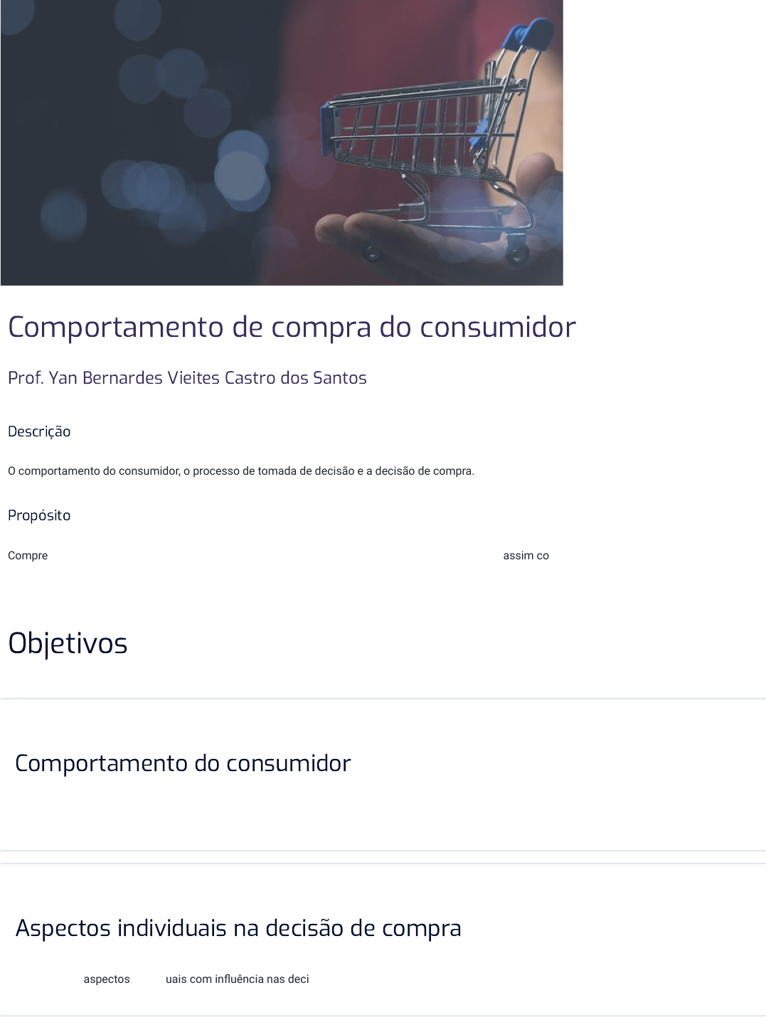 Comportamento de compra do consumidor Prof. Yan Bernardes Vieites Castro dos Santos Descrição O comportamento do consumidor, o processo de tomada de decisão e a decisão de compra. Propósito Compreender os principais conceitos e aplicações vinculados ao comportamento do consumidor, assim como a relação do processo decisório de compra em seus aspectos individuais e coletivos. Objetivos Módulo 1 Comportamento do consumidor Descrever os conceitos gerais do comportamento de compra do consumidor. Módulo 2 Aspectos individuais na decisão de compra Identificar os aspectos individuais com influência nas decisões de consumo. Módulo 3 Aspectos sociais na decisão de compra Relacionar as decisões de consumo individuais com a vida em sociedade. Introdução Entender o comportamento dos consumidores é um elemento essencial do marketing; afinal, seu estudo apresenta conceitos fundamentais em relação às decisões tomadas por eles. Baseadas em fatores internos e externos, elas são a causa direta das estratégias de marketing de firmas e agências. Em apenas um dia, é possível observar muitas decisões sobre a compra de produtos e serviços. Surgem então as seguintes perguntas: quais são os conceitos fundamentais para que o comportamento desse consumidor possa ser compreendido? Como funciona esse processo de decisão de consumo na nossa mente? E, por fim, como o contexto social no qual estamos inseridos influencia esse processo? Abordaremos esses assuntos de forma detalhada neste material. Do ponto de vista profissional, uma boa base de conhecimento sobre o comportamento do consumidor pode lhe proporcionar ferramentas a serem aplicadas em equipes que busquem entendê-lo melhor e utilizar o marketing de maneira mais efetiva. 1 - Comportamento do consumidor Ao �nal deste módulo, você será capaz de descrever os conceitos gerais do comportamento de compra do consumidor. Fundamentos do comportamento do consumidor Embora o conceito do comportamento do consumidor possa não soar familiar a princípio, ele está presente em boa parte das nossas vidas; afinal, somos todos consumidores. As decisões de consumo são tão rotineiras em nossas vidas que, muitas vezes, sequer nos damos conta delas. Por isso, vamos relembrar algumas em um dia comum. Ao acordarmos, escolhemos não só os tipos de alimento a serem consumidos no café da manhã, mas também a quantidade de cada um. Quando nos deslocamos para o trabalho ou faculdade, decidimos qual meio de transporte vamos utilizar. A relevância das decisões de consumo em nossas vidas é uma realidade. Com isso em mente, definiremos alguns conceitos fundamentais relativos ao comportamento do consumidor e apontaremos a importância desse estudo para as empresas. De�nição No passado, o comportamento do consumidor envolvia basicamente o estudo sobre as decisões que motivavam a compra de produtos. Embora ele ainda continue sendo o foco de boa parte de seu espectro analítico, o estudo desse comportamento ampliou profundamente o seu escopo ao longo dos últimos anos. Em uma abordagem mais moderna, Solomon estabelece que o comportamento do consumidor representa: No trajeto, checamos as mensagens no e-mail e conversamos com amigos e familiares pelo celular, um aparelho que, aliás, também foi escolhido entre diversos tipos e opções de modelo. De fato, até mesmo a escolha da operadora do plano contratado reflete uma decisão de compra que nos acompanha durante boa parte do dia. Ao longo do dia, tomamos mais uma série de decisões até chegarmos a casa e nos prepararmos para dormir. Nas oito horas seguintes, descansaremos em uma cama (também fruto de uma decisão de consumo no passado) até que, no dia seguinte, possamos repetir essa imensa variedade de decisões de compra normalmente despercebidas. O estudo dos processos envolvidos quando indivíduos ou grupos selecionam, compram, usam ou dispõem de produtos, serviços, ideias ou experiências para satisfazer necessidades e desejos. (SOLOMON, 2016) Ao compararmos, no estudo do consumo de produtos, algumas definições recentes com outras mais antigas, dois pontos ficam bastante evidentes. O primeiro deles é que, atualmente, o comportamento do consumidor também enfatiza a importância do estudo dos serviços. Em larga escala, essa mudança reflete o crescimento das vendas de serviços ao longo dos últimos anos. A evolução do consumo audiovisual Entenda como o consumo de produtos audiovisuais evoluiu ao longo do tempo graças à chegada de novas tecnologias que revolucionaram a forma de acesso a esse tipo de conteúdo. O streaming é apenas um dos inúmeros exemplos que retratam a importância dos serviços frente aos produtos para o consumidor moderno. O segundo ponto de divergência em relação ao comportamento dele é o seguinte: hoje em dia, não se estuda apenas a compra de determinado serviço ou produto, e sim o processo do consumo como um todo. Sob uma ótica mais moderna, o comportamento do consumidor envolve não apenas a compra de um produto ou serviço, mas também a sua experiência com ambos. Além disso, avaliam-se as consequências desse consumo para ele, como, por exemplo, o nível de satisfação final. Mesmo tendo sido negligenciados no passado, os dois aspectos citados são fundamentais para explicar se alguém pode voltar a consumir um produto ou serviço. Agora que falamos das diferenças de visão sobre esse tópico, vamos abordar a principal similaridade entre as definições apresentadas: o foco no consumidor. Embora pareça um conceito muito simples, o termo consumidor pode tomar diferentes formas dependendo do contexto utilizado. Afinal, o consumidor final de um produto/serviço pode ser tanto uma pessoa quanto uma empresa. Exemplo Assim como as pessoas compram computadores para uso pessoal, empresas adquirem os mesmos produtos para fins corporativos. Tanto pessoas quanto empresas podem ser caracterizadas como consumidores, mas as estratégias de marketing 