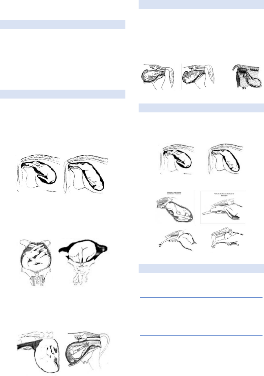 ESTÁTICA FETAL DEFINIÇÃO - É a “apresentação”, “posição” e “atitude” do feto, nas proximidades do parto; - Descrevem as relações entre as várias partes do feto e entre este e a mãe; - Seu estudo permite conhecer algumas condições eutócicas ou distócicas de origem fetal durante o parto, e familiarizar com a terminologia obstétrica. APRESENTAÇÃO - Relação existente entre os eixos longitudinais (coluna vertebral) da mãe e do feto. LONGITUDINAL: - Coluna da mãe está paralela à coluna do feto; - Anterior; - Posterior. Anterior x Posterior. TRANSVERSAL: - Coluna da mãe está transversal à coluna do feto. - Dorsal; - Ventral. Dorsal x Ventral. VERTICAL: - Coluna do feto está perpendicular à coluna da mãe; - Dorsal; - Ventral. Dorsal x Ventral. POSIÇÃO - Relação existente entre o dorso fetal e as várias porções maternas; - Superior (dorso-dorsal) > quando a coluna do feto se relaciona com o dorso da mãe; - Inferior (dorso-ventral) > dorso do feto em relação ao ventre da mãe; - Lateral (dorso-lateral) direita ou esquerda > coluna do feto se relacionando com as laterais da mãe. Superior x inferior x lateral. ATITUDE - Relação existente entre as partes móveis do feto; - Estendida > porções que se insinuam na via fetal estão estendidas - Flexionada. Estendida. Flexionada. ESTÁTICA FETAL EUTÓCICA E DESEJÁVEL - Eutócica = permite o parto normal; - Nem todas as posições eutócicas são desejadas. BOVINOS E EQUINOS - Longitudinal anterior; - Posição superior > é eutócica, porém, não desejável; - Atitude estendida. PEQUENOS RUMINANTES - Longitudinal anterior ou posterior (posterior apresenta menos problemas quando comparado a outras espécies); - Posição superior; - Atitude estendida. SUÍNOS - Apresentação não interfere; - Não é necessária a posição superior ou a atitude estendida. CARNÍVOROS - Apresentação longitudinal anterior; - Posição superior > eutócica, porém, não desejável; - Atitude estendida.
