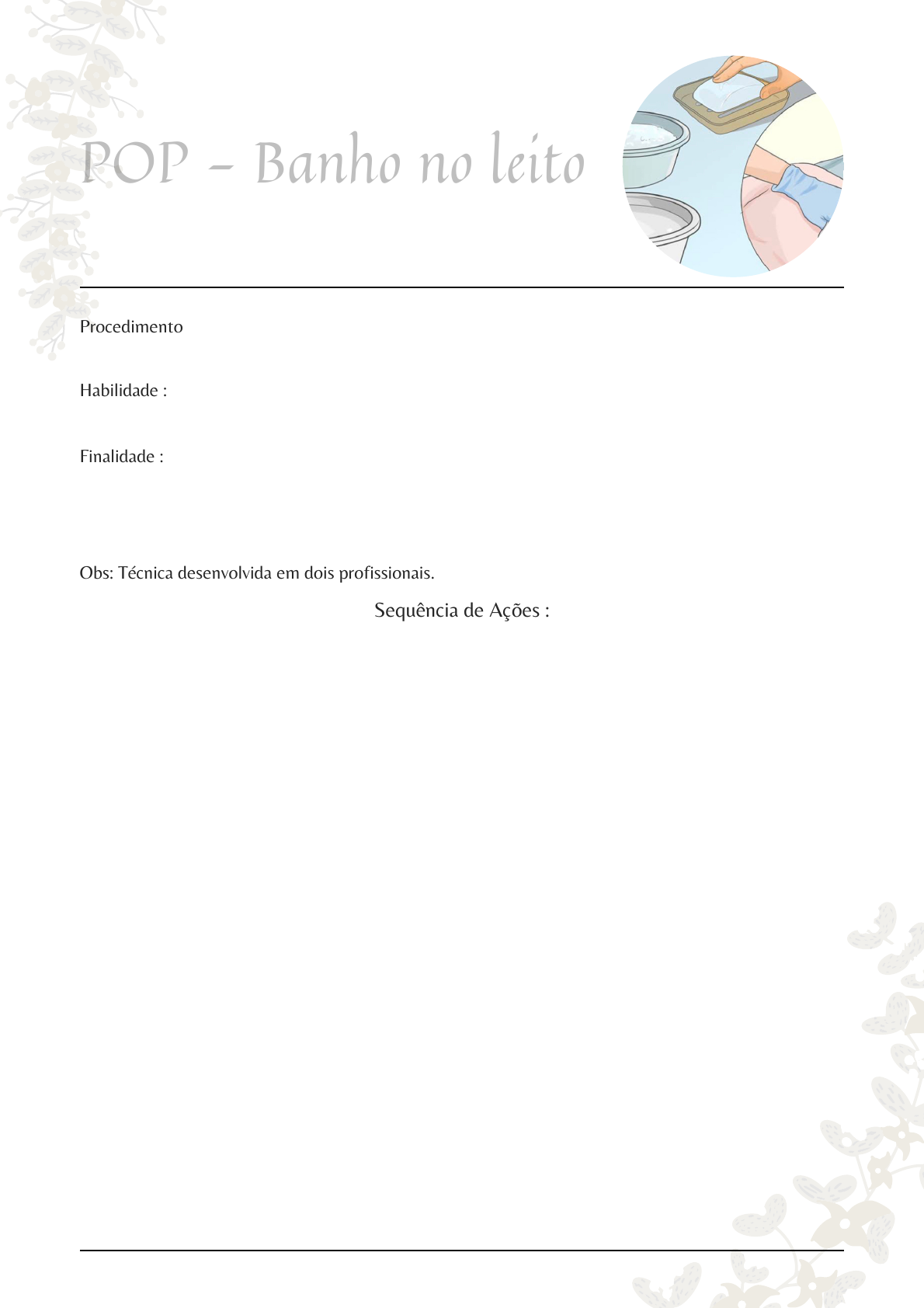 POP - Banho no leitoPOP - Banho no leito Sequência de Ações :Sequência de Ações : 1- Reunir o material em mesa propria de inox ou carro de banho. 2- Orientar o paciente sobre o procedimento. 3- Preparar o ambiente, colocar o biombo S/N e fechar corrente de ar (portas e janelas). 4- Desocupar a mesa de cabeceira e utiliza-la como apoio para execução da técnica. 5- Higienizar as mãos e calçar as luvas de procedimento. 6- Se possível oferecer comadre ou papagaio antes de iniciar o banho 7- Desprender a roupa de cama , retirar a colcha, o cobertor (troca-lo conforme rotina do serviço , caso esteja adequado dobrar para reutilizar). 8- Mantenha a elevação da cabeceira em 30º a 45º, ofereça material para higiene oral com cuba rim, copo com água. Obs: caso o cliente seja dependente realize com escova ou com espatula e gaze 9- Coloque água morna na jarra (esta deve ser preenchida qtas X forem necessária). 10- Teste a Tº da água da jarra ou solicite que o cliente o faça se possível; 11- Coloque a toalha de rosto abaixo da cabeça; o travesseiro abaixo dos ombros; mantenha a cabeça suspensa com uma das mãos, faça higiene do couro cabeludo. Habilidade :Habilidade : ProcedimentoProcedimento Finalidade :Finalidade : Limpeza da pele, estimular a circulação , propiciar a observação do estado da pele ,proporcionar conforto físico e mental, promover o relaxamento muscular , aliviar a sensação de fadiga e desconforto fisico. Desenvolver a habilidade para realizar higiene corporal Obs: Técnica desenvolvida em dois profissionais.Obs: Técnica desenvolvida em dois profissionais. Técnica banho no leito POP - Banho no leitoPOP - Banho no leito Sequência de Ações :Sequência de Ações : 12- Dividir a água em 1 bacia e 1 jarro: a água deverá ser colocada progressivamente do jarro para bácia permitindo que o pano seja lavado, ensaboado e enxagoado. Este jarro deve ser preenchdo quantas vezes forem necessárias, amntendo a temperatura da água, dando conforto ao cliente. 13- Cada profissional deve manter-se de um lado da cama, o profissional do lado da mesa com água, sabão e panos é responsável por lavar os panos, assim passa os panos na sequencia de ensaboar , enxagoar e secar. Lava os panos e realiza o mesmo processo do lado que esta ensaboando, enxagoando e secando 14- Lavar o paciente na cseguinte sequencia: face : ensaboar, enxagoar e secar até a raiz do pescoço; lavar os olhos do ângulo interno externo, rosto e ouvidos e secar, observar se é necessário aparar os pelos das narinas, se sim realizar no final do banho, caso o cliente queira a higiene oral pode ser realizada nesse momento. 15- A seguir coloque a toalha de banho sobre o torax, e abaixo dos MMSS, lave o membro superior do lado oposto ao profissional responsável a lavar os panos de banho e repor a água morna, laveo no sentido do punho para as axilas em movimentos longos e suaves, ao término secar, e realizar a lavagem do outro membro superior no mesmo sentido, observe se é necessário aparar as unhas e realize este procedimento no final do banho. Ofereça que realize a higiene das suas mãos, caso não consiga, faça por ele, molhe as mãos com a água do jarro, ensaboando, enxagoando e secando com massagem. 16- Colocar a toalha de banho sobre o tórax do paciente, cobrindo-o até a região púbica, com uma das mãos , suspender a toalha , com a outra , lavar o tórax e o abdome superior e inferior (ensaboar, enxagoar e secar), nos casos femininos atentar-se para secar bem abaixo das mamas. Após cobrir o paciente com o lençol limpo 17- Colocar a toalha de banho sob os MMII, e lave o membro inferior do lado oposto ao profissional responsável a lavar os panos de banho e repor a água morna, laveo no sentido do tornozelo para a região inguinal em movimentos longos e suaves, ao término secar, e realizar a lavagem do outro membro inferior no meso sentido, observe se é necessário aparar as unhas e realize este procedimento no final do banho. A higiene dos pés devem ser avaliados, para paciente acamados pode ser feita nesse momento, coloque a bacia abaixo dos pés do cliente, molhe os pés com a água do jarro, ensaboe, massageie, enxagoando e secando POP - Banho no leitoPOP - Banho no leito Sequência de Ações :Sequência de Ações : 18- Colocar o paciente em decúbito lateral , ficando de frente para as costas do paciente , protegendo-as com toalha ; ensaboar o dorso, massageando, a seguir enxagoar, e secar em movimentos circulares 19- Volte o cliente, para o decubito DDH, agora colocando a comadre apoioada na região sacro coccigena (forre a comadre para dar conforto), coloque algodão, ou gaze, ou um pano na região inguinal, a seguir com o jarro de água morna, irrigue a região genital, ensaboe do monte pubiano para a região perianal, se for mulher abra os grandes lábios, se homem tracione o prepucio e remova o esmegma, a seguir enxagoe, após realize a secagem com toalha e pequenos toques de forma delicada 20- Colocar o paciente em decúbito lateral , oposto ao primeiro decubito lateral, remova a comadre, ficando de frente para as costas do paciente , protegendo-as com toalha ;ensaboar novamente o dorso, massageando, a seguir enxagoar, e secar em movimentos circulares, finalize com aplicação de hidratante 21- Realizar limpeza concorrente, com pano úmido, no colchão, a seguir troque a luva de procedimento, após realize a arrumação de cama deste lado, colocando lençol de baixo e o lençol, móvel. 22- Volte o paciente para o lado dos lenções limpos, coberto com lençol limpo, o profissional do lado oposto da cama, deve remover as roupas sujas de cama, realizar a limpeza concorrente do colchão, trocar as luvas e a seguir puxar os lenções limpos, voltando o paciente para o DDH, cloque a camisola ou pijama do cliente 23- Recomponha oc paciente e o deixe confortável, caso seja necessário o aparo de unhas, coloque as mãos ou pés do cliente sore uma toalha e realize o cor