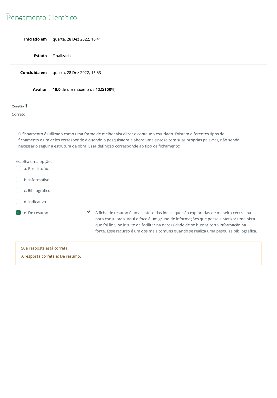 Pensamento Cientí�co Iniciado em quarta, 28 Dez 2022, 16:41 Estado Finalizada Concluída em quarta, 28 Dez 2022, 16:53 Avaliar 10,0 de um máximo de 10,0(100%) Questão 1 Correto O �chamento é utilizado como uma forma de melhor visualizar o conteúdo estudado. Existem diferentes tipos de �chamento e um deles corresponde a quando o pesquisador elabora uma síntese com suas próprias palavras, não sendo necessário seguir a estrutura da obra. Essa de�nição corresponde ao tipo de �chamento: Escolha uma opção: a. Por citação. b. Informativo. c. Bibliográ�co. d. Indicativo. e. De resumo. A �cha de resumo é uma síntese das ideias que são exploradas de maneira central na obra consultada. Aqui o foco é um grupo de informações que possa sintetizar uma obra que foi lida, no intuito de facilitar na necessidade de se buscar certa informação na fonte. Esse recurso é um dos mais comuns quando se realiza uma pesquisa bibliográ�ca. Sua resposta está correta. A resposta correta é: De resumo. https://aula.fael.edu.br/ Questão 2 Correto Questão 3 Correto Os resumos podem ser classi�cados em tipos diferentes. Um desses tipos possui a característica de informar �nalidades, metodologia, resultados e conclusões do documento original. De que tipo de resumo são essas características? Escolha uma opção: a. Indicativo. b. Analítico. c. Descritivo. d. Crítico. e. Informativo. Resumo informativo é normalmente o tipo de documento que seria isento de opinião, apenas representando o texto que foi lido em uma forma curta e direta. Apresenta as ideias principais do autor, respeita a posição dele e, se for necessária alguma citação integral, deve ser colocada entre aspas. Sua resposta está correta. A resposta correta é: Informativo. Na resenha existe mais liberdade por parte do escritor. No entanto, devem-se observar alguns passos. Sabendo disso, analise as seguintes assertivas: I – Deve abordar de forma geral o autor da obra. II – Deve realizar uma síntese do conteúdo sobre o tema e os pontos principais. III – Deve expor o que o autor original concluiu ou tirou como lição. Está(ão) correto(s) a(s) assertiva(s): Escolha uma opção: a. I e III, somente. b. II e III, somente. c. I, somente. d. Todas. Na construção de uma resenha, é necessário que sejam observados alguns passos: referência à obra original (NBR 6023:2002); abordar de maneira geral o autor da obra; sintetizar o conteúdo sobre o tema e os pontos principais; o que o autor original concluiu ou tirou de lição; realizar a crítica sobre o que foi exposto. e. I e II, somente. Sua resposta está correta. A resposta correta é: Todas. https://aula.fael.edu.br/ Questão 4 Correto Questão 5 Correto Ao se elaborar um �chamento, temos a opção de fazê-lo no computador, onde é possível armazená-lo também na “nuvem”, isto é, no servidor on-line. Sendo o �chamento feito manualmente ou no computador, que composição padrão ele terá? Escolha uma opção: a. Cabeçalho; disposição textual; bibliogra�a. b. Cabeçalho; referência; autoria. c. Índice; corpo do texto; bibliogra�a. d. Índice; referência; corpo do texto. e. Cabeçalho; referência; corpo do texto. A composição padrão de um �chamento é: a) O cabeçalho pode ser dividido em título geral e título especí�co do trabalho; b) Logo em seguida vem a referência, que contém o autor, o título, o local em que foi publicado, a editora e o ano de publicação; c) Depois, tem-se o corpo ou texto de �chamento/�cha, que também pode ser traduzido como o conteúdo do que está sendo arquivado. Isso pode se constituir de um resumo geral ou até mesmo uma citação. Esse corpo pode mudar de maneira especí�ca, dependendo do tipo de �chamento que estiver sendo realizado. Sua resposta está correta. A resposta correta é: Cabeçalho; referência; corpo do texto. Sabendo que existem diversos tipos de conhecimento, analise os seguintes exemplos: I – Chá de boldo é bom para regular o intestino. II – No princípio, Deus fez Adão e Eva. III – A Terra gira em torno do Sol. Com relação a esses exemplos, assinale a alternativa correta: Escolha uma opção: a. O item I é um exemplo de conhecimento cientí�co. b. O item III é um exemplo de conhecimento �losó�co. c. O item II é um exemplo de conhecimento �losó�co. d. O item I é um exemplo de conhecimento teológico. e. O item III é um exemplo de conhecimento cientí�co. O conhecimento empírico é o conhecimento popular, por exemplo: “Chá de boldo é bom para regular o intestino”. O conhecimento teológico, ou religioso, é baseado na fé religiosa, por exemplo: “No princípio, Deus fez Adão e Eva”. O conhecimento cientí�co está relacionado com a lógica e o pensamento crítico e analítico. É o conhecimento que temos sobre fatos analisados e comprovados cienti�camente, por exemplo: “A Terra gira em torno do Sol”. Sua resposta está correta. A resposta correta é: O item III é um exemplo de conhecimento cientí�co. https://aula.fael.edu.br/ Questão 6 Correto Questão 7 Correto O desenvolvimento cientí�co sempre teve in�uência dos aspectos econômicos, políticos e religiosos. Ao resgatarmos aspectos históricos podemos ver que, durante a Idade Média, o desenvolvimento do conhecimento cientí�co avançou de forma lenta, sendo predominante o dogmatismo religioso. Desta forma, podemos concluir que: Escolha uma opção: a. O conhecimento cientí�co preocupa-se com o rigor que a experiência cientí�ca exige, sem questionar os problemas colocados pelo cotidiano. b. Os conceitos cientí�cos são representações mentais objetivas de objetos e fenômenos caracterizados pela singularidade do conhecimento cientí�co. c. O conhecimento cientí�co não é o resultado somente da prática investigativa e experimental. O conhecimento cientí�co não é resultante da prática investigativa e experimental por 