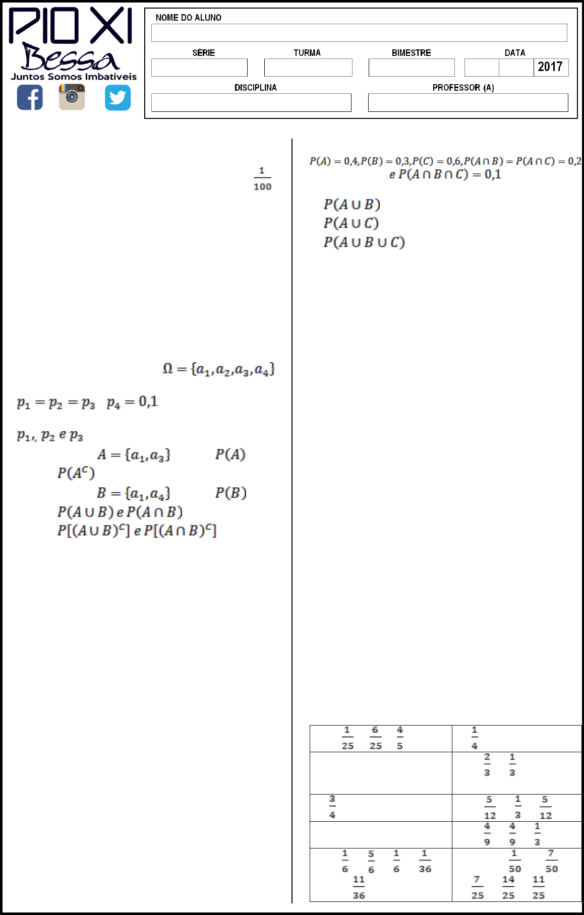 1- Uma urna contém 100 bolinhas numeradas, de 1 a 100. Uma bolinha é escolhida e observado seu número. Admitindo probabilidades iguais a , para todos os eventos elementares, qual a probabilidade de: a) Observarmos um múltiplo de 6 e de 8 simultaneamente? b) Observarmos um múltiplo de 6 ou de 8? c) Observarmos um número não múltiplo de 5? 2- Numa urna existem duas bolas vermelhas e seis brancas. Sorteando-se uma bola, qual a probabilidade de ela ver vermelha? 3- Considere o espaço amostral e a distribuição de probabilidades, tal que: e . Calcule: a) b) Seja A o evento . Calcule . c) Calcule . d) Seja B o evento . Calcule . e) Calcule . f) Calcule . 4- Uma moeda é viciada de tal modo que sair cara é duas vezes mais provável do que sair coroa. Calcule a probabilidade de: a) Ocorrer cara no lançamento dessa moeda. b) Ocorrer coroa no lançamento dessa moeda. 5- Temos duas moedas, das quais uma é perfeita e a outra tem duas caras. Uma das moedas, tomada ao acaso, é lançada. Qual é a probabilidade de se obter cara? 6- Um dado é viciado de modo que a probabilidade de observarmos qualquer número par é a mesma, e a de observarmos qualquer número ímpar é também a mesma. Porém um número par é três vezes mais provável de ocorrer do que um número ímpar. Lançando-se esse dado, qual a probabilidade de: a) Ocorrer um número primo? b) Ocorrer um múltiplo de 3? c) Ocorrer um número menor ou igual a 3? 7- Se A, B e C são eventos tais que: Calcule: a) b) c) 8- Uma urna contém 6 bolas pretas, 2 bolas brancas e 10 amarelas. Uma bola é escolhida ao acaso. Qual a probabilidade de: a) A bola não ser amarela? b) A bola ser branca ou preta? c) A bola não ser branca nem amarela? 9- Dois dados, um verde e um vermelho, são lançados e observados os números das faces de cima. a) Qual a probabilidade de ocorrerem números iguais? b) Qual a probabilidade de ocorrerem números diferentes? c) Qual a probabilidade de a soma dos números ser 7? d) Qual a probabilidade de a soma dos números ser 12? e) Qual a probabilidade de a soma dos números ser menor ou igual a 12? f) Qual a probabilidade de aparecer número 3 em ao menos um dado? 10- Em um grupo de 500 estudantes, 80 estudam Engenharia, 150 estudam Economia e 10 estudam Engenharia e Economia. Se um aluno e escolhido ao acaso, qual a probabilidade de que: a) Ele estude Economia e Engenharia? b) Ele estude somente Engenharia? c) Ele estude somente Economia? d) Ele não estude Engenharia nem Economia? e) Ele estude Engenharia ou Economia? GABARITO 1- a) ; b) ; c) 2- 3- a) 0,3; b)0,6; c) 0,4; d) 0,4; e) 0,7; 0,3; f) 0,3; 0,7 4- a) ; b) 5- 6- a) ; b) ; c) 7- a) 0,5; b) 0,8; c) 0,8 8- a) ; b) ; c) 9- a) ; b) ; c) ; d) ; e) 1; f) 10- a) ; b) ; c) ; d) ; e) 2º Matemática – Lista 1 www.pioxi.com.br Marcelle 3ª