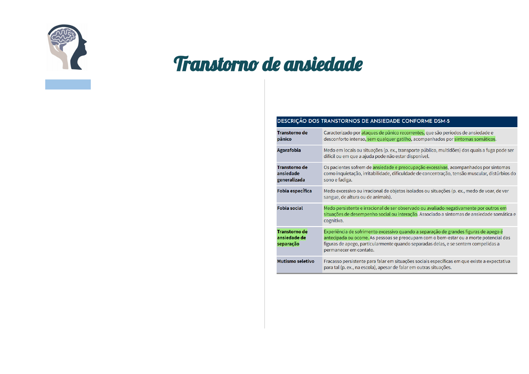 Transtorn� d� ansiedad� Introdução Os transtornos de ansiedade constituem uma das principais causas de incapacidade ao redor do mundo. Como características essenciais desses transtornos, podemos citar o medo excessivo e persistente. Embora a neurobiologia dos transtornos de ansiedade individuais não seja totalmente conhecida, algumas generalizações foram identificadas para a maioria deles, como alterações no sistema límbico, fatores genéticos e disfunção do eixo hipotálamo-hipófise-adrenal. Quando não tratados, esses transtornos tendem a evoluir para cronicidade. Comprometimentos associados a transtornos de ansiedade variam de limitações no funcionamento social a prejuízos graves, como a incapacidade do paciente de sair de casa. A ansiedade ocasional, ou adaptativa, é parte normal da experiência humana,quando persistente, disruptiva ou desproporcional ao perigo real, ela pode ser debilitante e considerada patológica. Atualmente, os critérios diagnósticos para transtornos de ansiedade são muito semelhantes nos dois principais sistemas de classificação de saúde mental – o Manual diagnóstico e estatístico de transtornos mentais (DSM-5) e a Classificação internacional de doenças e problemas relacionados à saúde (CID-11, em sua versão beta). O DSM-55 divide a ansiedade patológica nos seguintes transtornos: transtorno de ansiedade de separação (TAS), mutismo seletivo, fobia específica, transtorno de pânico (TP), agorafobia, transtorno de ansiedade generalizada (TAG), transtorno de ansiedade devido a outra condição médica, outro transtorno de ansiedade não especificado. Os transtornos de ansiedade podem ser conceituados não apenas de modo categorial, mas também de modo dimensional, variando, dentro do espectro, de formas subclínicas a apresentações muito graves. Epidemiologia Segundo a Organização Mundial da Saúde (OMS), um em cada quatro indivíduos apresenta ou já apresentou um transtorno de ansiedade. Mais da metade dos pacientes com um transtorno de ansiedade apresenta múltiplos transtornos de ansiedade comórbidos. Grande parte dos transtornos de ansiedade se manifesta já na infância, sendo que sua prevalência de 12 meses na infância e na adolescência é semelhante à observada em adultos.Fobias e TAS têm início particularmente precoce, com maior risco de incidência entre os 6 e os 17 anos de idade. No entanto, para alguns transtornos de ansiedade, como o TAG, os sintomas podem surgir na idade adulta e no final da vida. A idade de início média estimada para os transtornos de ansiedade, de modo geral, foi de 21,3 anos. Tal estimativa é menor para o TAS (10,6 anos), seguido por fobia específica (11,0 anos).9 Por sua vez, as idades de início médias estimadas foram maiores para o TP (30,3 anos) e o TAG (34,9 anos). Fatores de risco Diversos fatores de risco podem favorecer a modificação do curso da ansiedade normal para a patológica, incluindo ser do sexo feminino, utilizar drogas e apresentar histórico familiar de transtornos de ansiedade ou depressão. Ser do sexo feminino duplica o risco de desenvolver transtornos de ansiedade. Ter pais com ansiedade e depressão aumenta o risco de desenvolver um transtorno de ansiedade, particularmente TP e TAG. Os filhos de indivíduos que apresentam pelo menos um transtorno de ansiedade têm risco aumentado em duas a quatro vezes para esses transtornos. Outros fatores de risco incluem alterações tempera mentais específicas, como temperamento inibido, inte rações entre pais e filhos caracterizadas por controle e negatividade, além de sociabilidade reduzida. Em adultos jovens, fatores estressores da vida, como estresse financeiro, doença familiar e divórcio, podem prever sintomas e diagnósticos de transtornos de ansiedade subsequentes. O tabagismo e o abuso de álcool também são fatores de risco para esses transtornos. Fisiopatologia Circuitos neurais Sabe-se que, quando estímulos ambientais são interpretados como ameaçadores, se origina a ansiedade. Para que essa interpretação ocorra, uma pessoa deve primeiro detectar que os estímulos existem por meio de seus sistemas sensoriais, por meio do córtex sensorial, do tálamo e dos folículos superior e inferior. Se os eventos são ou não interpretados como ameaçadores depende do equilíbrio entre os circuitos de apoio e o circuito de comportamentos defensivos. Um mecanismo importante que pode permitir que um sistema se sobreponha ao outro é o recrutamento de determinadas populações definidas pela projeção de neurônios na amígdala basolateral. A valência positiva e a negativa são codificadas por neurônios da amígdala basolateral, sendo interpretadas como situações de recompensa ou medo. 2