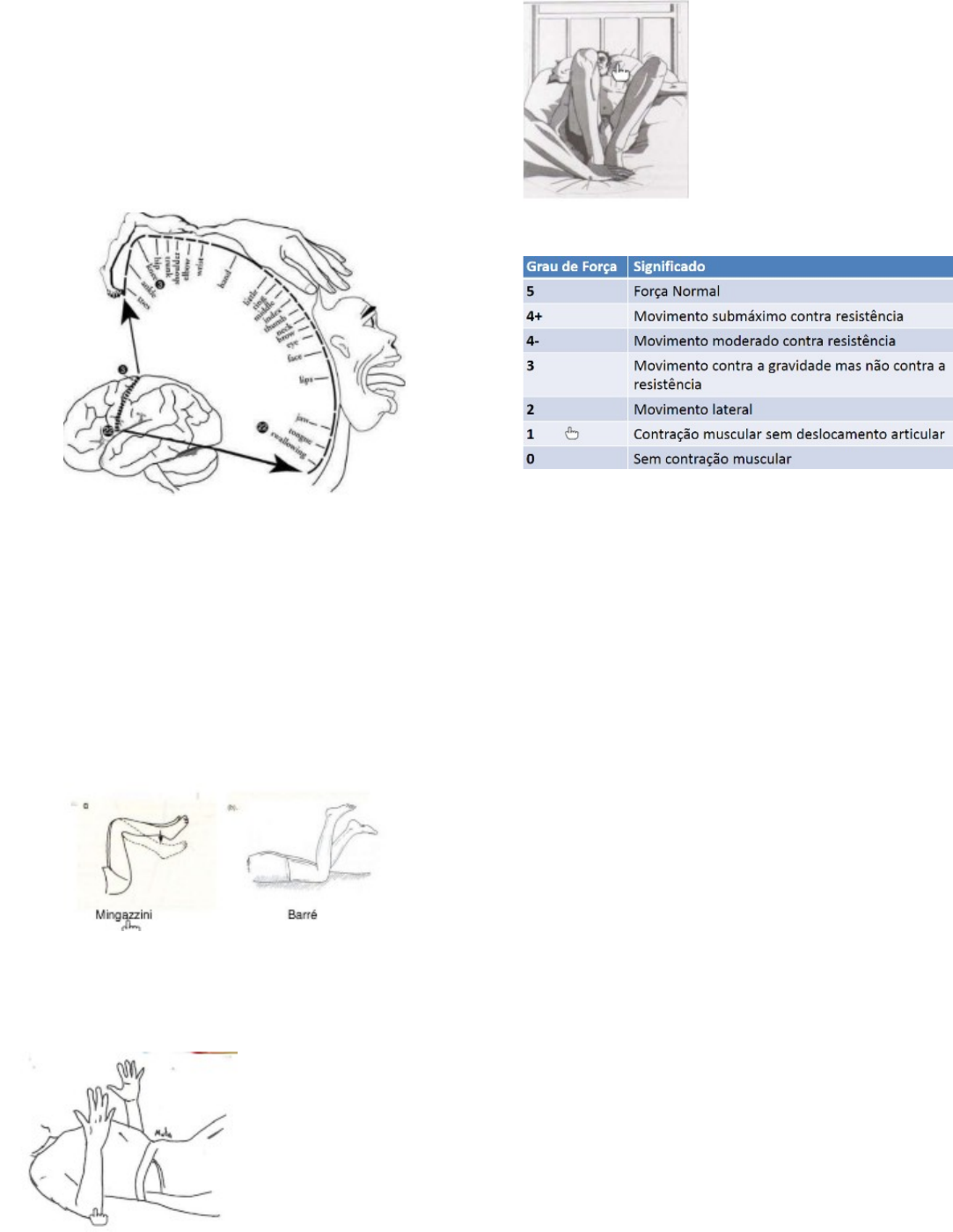 Avaliação da Motricidade Voluntária · Cortex motor envia fibras do trato corticoespinhal · Fibras que controlam o movimento vem do hemisfério contrario. · Omunculo motor representação gráfica Provas Deficitarias: uso da gravidade Examinar sentado · Manobra dos braços estendidos: sensibilizar a prova fechando os olhos O braço pode continuar estendido e a mao cair · Prova de Mingazzini · Prova de Barré: analisar a força da região posterior da coxa. Em pacientes acamados: · Manobra de Raimiste: a mão vai fechando e o braço vai caindo em cima da barriga. · Prova de queda do membro inferior em abdução: seguro os pés com a mão e o joelho com a outra. O membro que cair, é o que esta acometido Graduação da Força Avaliar a força do membro superior: manobras de oposição Avaliar o tônus, ver se há resistência ao movimento, força do braço, antebraço, força do punho, dedos, força. Tônus muscular · Estado de tensão permanente dos músculos (se esta flácido, rígido) · Repouso, postural, cinético · Inspeção, palpação, movimentos passivos Movimentos passivos: · Avalia a extensibilidade: amplitudes movimentos passivos · Avalia a passividade: resistência dos músculos Hipotonia: redução do tônus muscular · Achatamento das massas musculares · Consistência diminuída · Passividade aumentada · Prova do balanço: estender os braços e o examinador da um tapa e o braço precisa voltar. Lesões cerebelares o braço fica oscilando (hipotônico). Hipotonia: síndrome cerebelar · Alteração de coordenação e tônus · Hipotonia (diminuição da consistência das massas musculares, aumento da passividade, reflexos pendulares) · Ipsilaterais · Dismetria, disdiadococinesia, tremor, assinergia do tronco membros, disgrafia, disartria, nistagmo, Disbasia. Hipertonia · Consistência muscular aumentada · Passividade diminuída (quero dobrar a perna e não da) · Prova do balanço com reduzidas oscilações · Cauas: AVC, esclerose múltiplas (aumento da espasticidade). Hipertonia Piramidal – AVC · Espasticidade · Elástica: retorna a posição inicial Hipertonia Extrapiramidal - Parkinson · Rigidez em roda denteada · Acomete toda a musculatura corporal · Plástica: resistência constante a movimentação passiva. Sensibilidade dos reflexos Homúnculo sensitivo: giro pós-central – córtex somestesico Avaliar com roupas adequadas e menos, ambiente adeuqado, olhos fechados, evitar tornar o exame prolongado e cansativo. · Tatil: algodão · Térmica: dois tubos de ensaio alternado · Dolorosa: não utilizar agulha · Avaliar comparativamente os lados e os dermatomos · Vibratoria/Palestesia: diapasão · Pressao: compressai de massas musculares · Cinética Postural: deslocando o halux o paciente deve reconhecer a posição. Reflexos Periodo de latência: tempo entre a aplicação do estimula e a resposta Período refratário: não se obtem resposta a um estimulo adequado logo após a provocação do reflexo. Fadiga: provocação repetida determinando sua diminuição e extinção. *Reflexo inesgotável são patológicos: ex. demências Classificação Proprioceptivos ou Profundos *Guilan barré: não tem reflexos. Semiotécnica Paciente relaxado com região a examinar descoberta Resposta é dada pela contração do músculo estimulado e relaxamento dos antagonistas. Clônus Patelar: reflexo patológico Movimento exaltado Geralmente é uma lesão do trato piramidal *percurte na ulna *Normal reflexo em flexão Babinski: abertura dos dedos em leque – extensão *no bebe é normal pois os neurônios não estão mielinizados (apenas nos primeiros dias de vida)