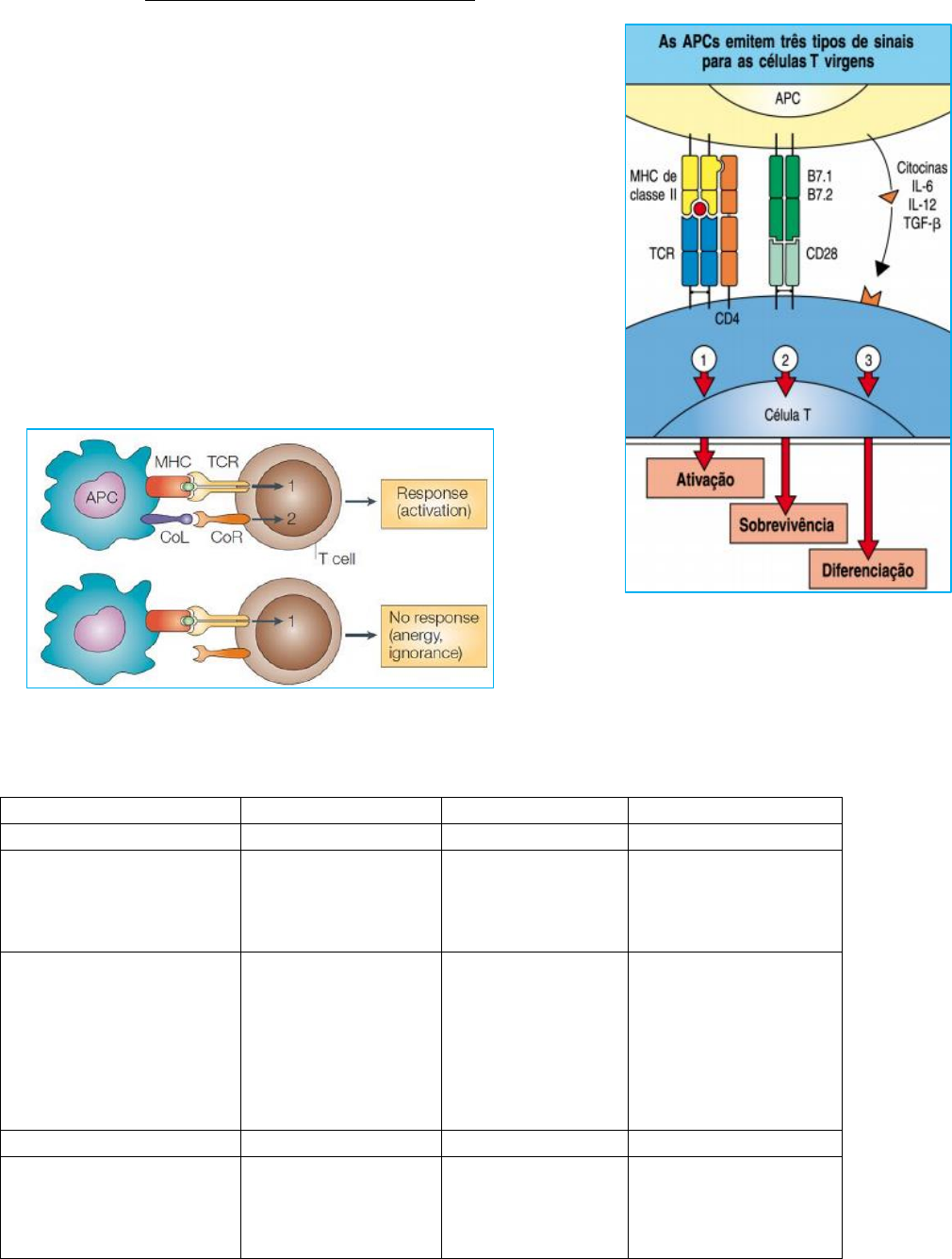 RESPOSTA IMUNE ADAPTATIVA Ativação da célula T • Ao entrar em contato com o antígeno, a APC aumenta a expressão de MHCs em sua superfície e passam a secretar moléculas co-estimulatórias para que a ativação dos linfócitos T seja possível. A mobilização dessas células tem 3 fases: ativação, sobrevivência e diferenciação. - A ativação está relacionada a apresentação do antígeno pela DC por meio da interação do MHCII com o TCR, que é mediada por moléculas de adesão (integrinas) e co-estimulatórias. - Depois, a APC interage por meio da molécula B7, de sua superfície, com a CD28 da célula T e essa última passa a secretar IL-2. - A IL-2 é a responsável por gerar uma resposta autócrina no linfócito, dando origem a células efetoras e de memória, desencadeando o segundo sinal caracterizado pela sobrevivência e distribuição clonal. Esses sinais fazem com que a célula T passe a expressar o CD40L, que interage com a CD40 na superfície da DC. Essa interação também induz a produção de citocinas pela APC, o que é responsável pelo 3° sinal: a diferenciação. Obs.: A ativação só irá acontecer com o MHC + COESTÍMULO, caso contrário a célula T ficará anérgico. - É a variação do terceiro sinal que fará com que possa haver a ativação de diferentes tipos e funções de célula T. Essa variação na ativação da resposta imune dos linfócitos TCD4 está relacionada ao tipo de citocina liberado pela APC. CITOCINA LIBERADA APC DIFERENCIAÇÃO EM CÉLULA QUE ATIVA CITOCINA SECRETADA TGF-beta T reguladora TGF-beta e IL-10 TGF-beta (IL-17) IL-17 + IL-22 TH 17 Neutrófilos Produção de peptídeos antimicrobianos IL-6, IL-22 e IL-17 IL-5 IL-4 IL-4 + IL-13 TH2 Eosinófilos Célula B e Igs Produção de muco e peristaltismo aumentado; ativação alternativa do macrófago IL-4, IL-5, IL-13 IL-6 T folicular IL-21 e ICOS IL-12 + IFN-gama TH1 Macrófagos (aumento da expressão de B7 e MHC) IL-2 e IFN-gama Na ausência de infecção, a célula dentritica secreta TGF-beta e diminui a liberação de IL-6, o que leva a diferenciação em uma célula T reguladora que irá inibir a ativação de outros tipos de célula T desnecessariamente. - Em alguns tipos de infecção, os patógenos induzem a expressão de altos níveis de IL-6 e TGF-beta, o que leva a diferenciação da célula T em TH 17, secretando principalmente IL-6 e IFN-gama e promovendo o recrutamento e infiltração de neutrófilos no local lesado. Obs.: É importante destacar que as citocinas características de cada tipo de célula TCD4 inibem a diferenciação de outro subtipo celular ao mesmo tempo. Essa situação é o que ocorre na terapia de dessensibilização, comum em casos de hipersensibilidade do tipo I. Essa terapia consiste na exposição frequente do alérgeno ao organismo para tentar atingir o perfil de resposta TH1 e, assim, inibir a resposta TH2. Com a crescente secreção de IFN-gama por TH1, há o bloqueio da síntese de IgE para o alérgeno em questão. • Ativação TCD8 - A maioria das respostas TCD8 exige células TCD4. As células T auxiliares participam dessa resposta pois a CD, ao ativar os TCD4, passam a expressar outras moléculas co-estimulatórias (se tornam “células dentríticas licenciada”) são capazes de promover uma atividade coestimulatória mais intensa, o que é exigido por células TCD8. Ao contrário das TCD4, o coestímulo das TCD8 não visa a diferenciação em linfócitos com funções distintas. Ainda no segundo sinal, quando há a proliferação induzida por IL-2, todas elas se diferenciam em células citotóxicas. A resposta citotóxica é, então, altamente controlada e ocorre com uma liberação polarizada dos grânulos tóxicos dos linfócitos T – que é feita através de uma interação antígeno-específica, onde as moléculas estão direcionadas apenas para a célula alvo. A interação antígeno-específica é feita por moléculas de adesão para que, após o 1 sinal de ativação, passe a acontecer a liberação dos grânulos. Esses grânulos citotóxicos compreendem um complexo formado por perforinas, granzinas e uma serglicina. As perforinas são as primeiras a agir na célula lesada/infectada, formando poros na membrana e permitindo que o complexo adentre. Uma vez na célula, a granzina ativa a pro-caspase 3 em caspase 3 e a BID, ambas são pró-apoptóticas. A BID, por sua vez, libera o citocromo C da mitocôndria, ao passo que a caspase 3 cliva ICAD liberando a DNAse (CAD). Por fim, o citocromo C ativa a apoptose e a CAD fragmenta o DNA. (esquema da resposta TCD8 na próxima página ☺) ESTUDO DIRIGIDO Após estudar a ativação dos linfócitos T, tente responder a essas perguntas com as suas próprias palavras. 1. Quais são as fases de ativação dos linfócitos T e as principais moléculas e receptores envolvidos em cada uma delas? 2. Qual o papel das citocinas produzidas pelas APCs com relação a ativação dessas células? 3. O que são e para que servem as perforinas granzinas e a serglicina? 4. Cite e explique as diferenças existentes nas etapas de ativação de células TCD4 e TCD8. 5. Descreva como se dá a ativação de linfócitos em um organismo que não apresenta infecção. 6. Qual reposta é desencadeada quando o organismo apresenta células cronicamente infectadas? Descreva o mecanismo e cite quais as possíveis consequências desse tipo de resposta quando ela for exacerbada. 7. Por que, ao serem infectados pelo mesmo antígeno, na mesma proporção e da mesma maneira, os indivíduos desenvolvem respostas diferentes? 8. Quais são os diferentes fenótipos de células TCD4? Evidencie suas respectivas funções, as citocinas que produzem e quais patógenos são os principais alvos de cada fenótipo.