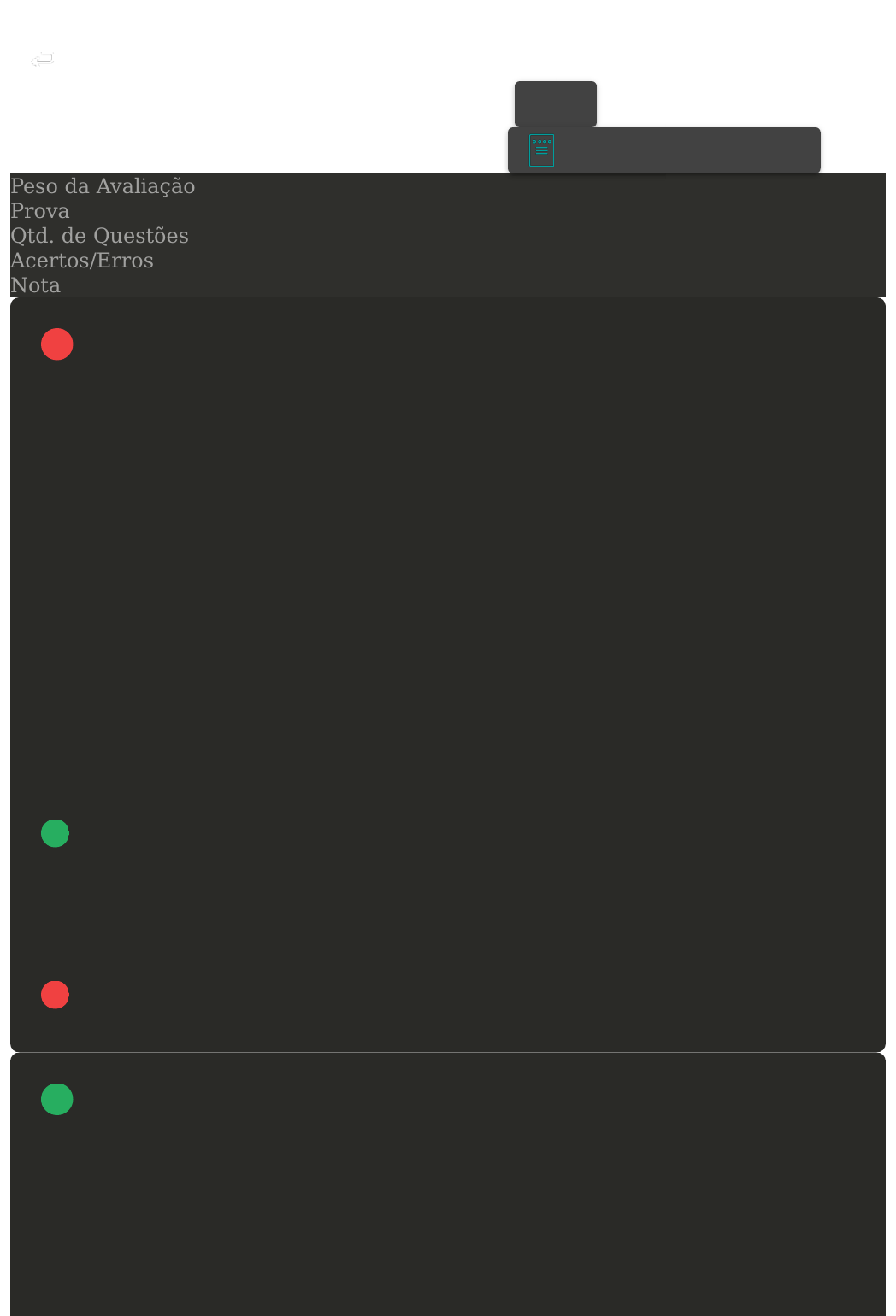 Prova Impressa GABARITO | Avaliação II - Individual (Cod.:826927) Peso da Avaliação 1,50 Prova 60912456 Qtd. de Questões 10 Acertos/Erros 9/1 Nota 9,00 Nos sistemas para a web, os dados são armazenados em um banco de dados, como o MySQL, e não inserido no HTML. Os bancos de dados são como planilhas de texto que possuem várias tabelas. Cada tabela possui colunas e linhas com os dados cadastrados. A manipulação dos dados dessa tabela é efetuada com uma linguagem conhecida como SQL, ela permite que faça buscas nas tabelas por certos tipos de dados e inserir, remover e atualizar os dados. Com o PHP e o HTML são apresentados os dados ao usuário. Sobre o uso do MySQL com PHP, classifique V para as sentenças verdadeiras e F para as falsas: ( ) O comando "INSERT INTO habito" é responsável por atualizar um registro na tabela habito. ( ) A expressão " $conexao->query($sql) === TRUE " analisa as estatísticas de acesso ao banco. ( ) O comando "new mysqli" inicia uma conexão com o banco de dados. ( ) O comando "$conexao->connect_error" verifica se houve erro ao abrir uma conexão. Assinale a alternativa que apresenta a sequência CORRETA: A F - F - V - V. B V - F - F - V. C F - V - V - F. D F - V - V - V. Os comandos DDL executados para criar o banco de dados, a tabela e a chave primária são descritos abaixo e são executados automaticamente pela ferramenta phpMyAdmin. VOLTAR A+ Alterar modo de visualização 1 2 Avaliação II - Individual https://ava2.uniasselvi.com.br/subject/grades-and-test... 1 of 6 14/05/2023, 22:04 Assinale a alternativa com o comando INCORRETO: A ALTER TABLE ADD CONSTRAINTPRIMARY. B TABLE SHIFT. C CREATE DATABASE. D CREATE TABLE. Os comandos INSERT, SELECT, UPDATE e DELETE estão entre os comandos DML (Data Manipulation Language) mais utilizados dentro do SQL. Com relação aos comandos DML, assinale a alternativa CORRETA: A O comando update, além de poder ser aplicado aos dados dentro de uma tabela, pode ser também aplicado à estrutura da mesa, alterando colunas, chaves primárias etc. B O comando delete permite a exclusão de dados de uma tabela e, através da cláusula where, pode ser utilizado para excluir somente dados de determinadas colunas de um registro. C Caso não se aplique nenhuma cláusula where em uma query SQL, todos os registros da(s) tabela(s) serão retornados. D O comando insert permite a criação de novas colunas dentro de uma tabela. O Javascript é uma linguagem, cujos comandos são executados no lado do cliente, isto é, dentro do navegador de internet e não no servidor da aplicação web. O Javascript nasceu do antigo navegador de internet Netscape, e inicialmente recebeu outros nomes. A Sun Microsystems, que era na época a empresa desenvolvedora do Java, forneceu o nome "Java" para esta linguagem de script, por uma questão de marketing. Uma das grandes vantagens do Javascript é o carregamento de páginas e componentes HTML sem precisar realizar requisições ao servidor, tornando a navegação mais rápida. Partindo desse pressuposto, classifique V para as sentenças verdadeiras e F para as falsas: 3 4 Avaliação II - Individual https://ava2.uniasselvi.com.br/subject/grades-and-test... 2 of 6 14/05/2023, 22:04 ( ) Ao declarar uma variável em Javascript, não é necessário definir o tipo de dado. ( ) Para a declaração de uma variável em Javascript, deve-se utilizar a palavra reservada "var" seguida do nome da variável. ( ) O operador lógico da expressão "if (valorProduto == 12500.0)" é um operador de igualdade, o qual testa se dois valores são iguais. ( ) O resultado booleano da expressão "if (1 === '1')" é verdadeiro. Agora, assinale a alternativa que apresenta a sequência CORRETA: A F - V - V - F. B V - F - F - V. C F - V - F - F. D V - V - V - F. O javascript vem assumindo uma importância cada vez maior no desenvolvimento web, passando de uma linguagem de cliente, interpretada no browser, para uma linguagem de servidor, sendo compilada e executada por motores específicos. Considerando as características da linguagem de programação javascript e o código-fonte da figura a seguir, classifique V para as sentenças verdadeiras e F para as falsas: ( ) O literal de função começa na linha 19. ( ) A variável i somente pode ser utilizada dentro do laço for. ( ) A função literal retorna o resto da divisão de numeroAleatorio por 2. ( ) A chamada da função ocorre na linha 26. Agora, assinale a alternativa que apresenta a sequência CORRETA: A V - F - V - F. B F - F - V - V. 5 Avaliação II - Individual https://ava2.uniasselvi.com.br/subject/grades-and-test... 3 of 6 14/05/2023, 22:04 C V - F - F - V. D V - V - F - F. Um banco de dados relacional é constituído por tabelas, e cada tabela é desenvolvida por linhas e colunas que armazenam dados. Tabelas são estruturas que permitem armazenar os dados, e são resultantes de comandos DDL, que as criam. Pode-se imaginar uma tabela, como uma grade de uma planilha, onde cada célula pode armazenar um dado. Com relação às tabelas de banco de dados, analise as afirmativas a seguir: I- Tabela é uma estrutura do banco de dados, em que comandos DML podem inserir dados. II- Chave primária, em banco de dados, é a identificação de um registro em uma tabela, o qual não se repete. III- Chaves primárias servem para evitar que sejam inseridos registros duplicados em uma mesma tabela. IV- Alteração de uma chave primária de uma tabela pode ser realizada através do comando DML CREATE TABLE. Agora, assinale a alternativa CORRETA: A As afirmativas I, II e III estão corretas. B As afirmativas II, III e IV estão corretas. C Somente a afirmativa I está correta. D As afirmativas II e IV estão corretas. Uma função é uma estrutura que possui um nome, opcionalmente uma lista de parâmetros, um bloco de instruções, e opcionalmente um retorno. Em JavaScript, podemos declarar funções de diversas maneiras. Iremos focar na abordagem mais atual, que são os lit
