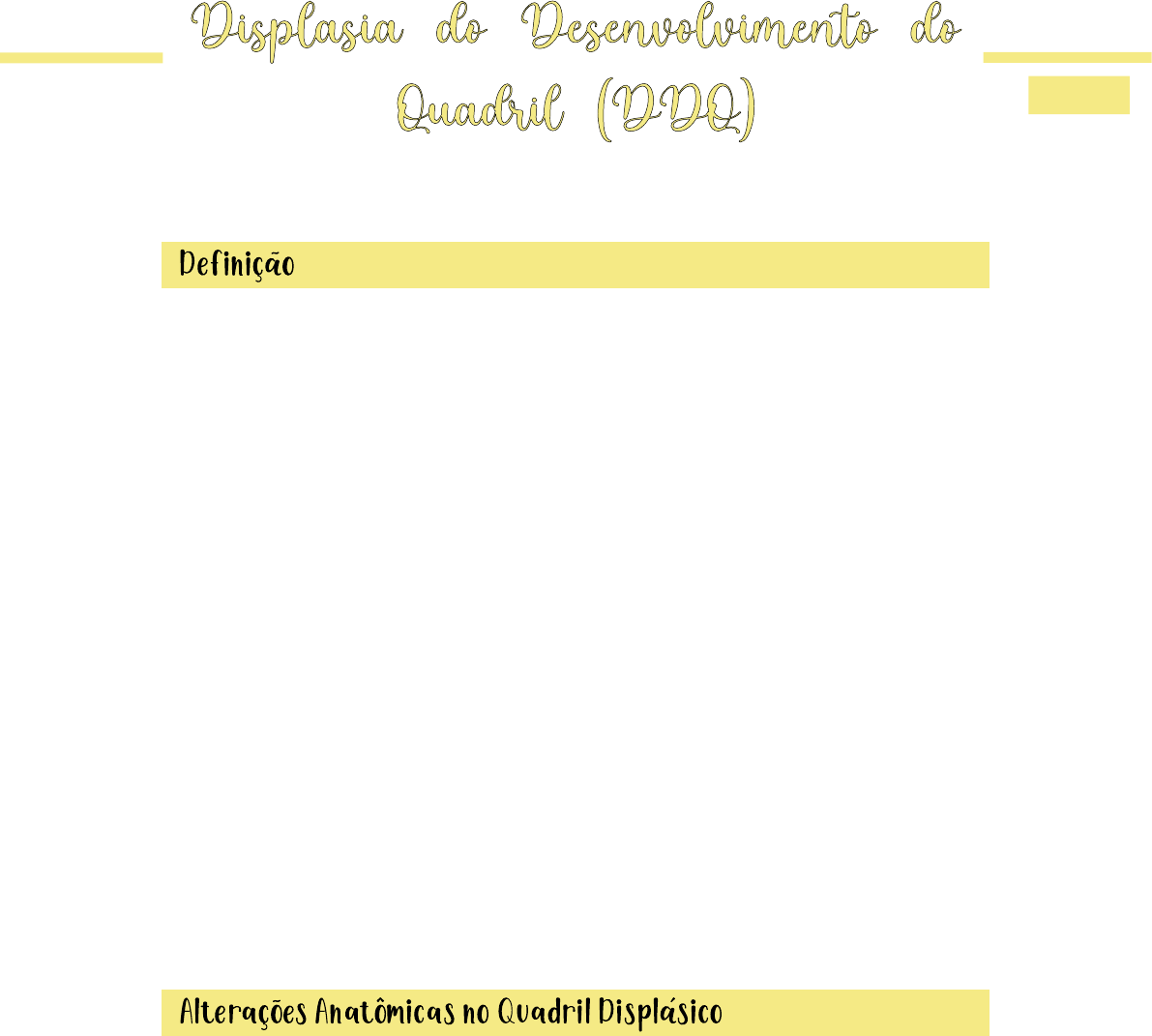 - É uma displasia que acontece durante o desenvolvimento da criança que levará a uma luxação do quadril, por isso era, e ainda é chamada por muitos como luxação congênita do quadril. - “Displasia do desenvolvimento do quadril” (DDQ) é uma expressão genérica que descreve um espectro de anormalidades anatômicas do quadril, as quais podem ser congênitas ou de desenvolvimento após o nascimento. A DDQ manifesta-se de várias formas, dependendo do grau de deslocamento, da idade do paciente no diagnóstico e no tratamento ou, ainda, da condição do quadril, se é instável, displásico, subluxado ou luxado. - A DDQ acontece na relação quadril – cabeça femoral – acetábulo. - A displasia implica uma progressiva deformidade do quadril, em que o fêmur proximal, o acetábulo e a cápsula são defeituosos. A luxação da cabeça do fêmur pode ocorrer no útero (fetal ou pré-natal), no nascimento (perinatal) ou depois dele (pós-natal). - Os achados clínicos e radiográficos, assim como as modificações patológicas, dependem do tempo de deslocamento. - Existem vetores de crescimento que atuam no desenvolvimento do quadril ainda na vida intrauterina. Quando a criança está em vida intrauterina, a cabeça femoral ocupa o fundo do acetábulo, e esses vetores exercem forças que fazem como se forme algo semelhante a uma “forminha” (já que o osso ainda é muito plástico), fazendo com que ocorra um perfeito encaixe da cabeça femoral no acetábulo. Resumindo: é preciso ter uma harmonia no crescimento de todas as estruturas para que o resultado seja um quadril normal. Quando não ocorre essa harmonia, temos um quadril displásico, no qual temos acetábulo plano, reto. Giovanna Lopes - Com o tempo e o crescimento, várias mudanças adaptativas afetam todas as estruturas do quadril. O desenvolvimento da cavidade acetabular requer uma cabeça femoral em contato concêntrico. Se a cabeça femoral não for reduzida, a cavidade do acetábulo achata e a parede óssea se alarga. - A gordura pulvinar, ligamento redondo, lábio, ligamento transverso e cápsula estão hipertrofiados. O lábio hipertrófico é o chamado limbo e pode ser evertido (mais frequentemente) ou invertido (impedindo a redução do quadril). - O limbo deve ser diferenciado do neolimbus. O neolimbus é uma crista de cartilagem acetabular hipertrófica causada pela sobrecarga da cabeça femoral subluxada contra a parte póstero-superior do acetábulo. - O neolimbus desaparece quando o quadril é reduzido. - O fêmur displásico apresenta valgo e anteversão aumentados e colo curto. No entanto, alguns estudos não relatam diferenças na anteversão femoral em comparação com o lado não afetado. A cabeça femoral está deformada e o aparecimento dos núcleos de ossificação é retardado em comparação com o lado contralateral. O canal medular é estreito e reto. - Na DDQ a cápsula articular fica mais frouxa, promovendo uma luxação ou uma subluxação do fêmur, que pode ser redutível ou irredutível. Neonatos com o quadril saudável terão apenas uma pistonagem da articulação no momento do Teste de Barlow (que será negativo nesses casos). - A DDQ acomete mais o quadril esquerdo do bebê (65%) e há uma ocorrência de 20% de displasia bilateral. - Algumas características ósseas podem surgir, como o acetábulo mais raso e a cabeça femoral mais ovoide. - A incidência de quadris de neonatos instáveis é de 1:1000 (um quadro que pode se curar espontaneamente em até 3 semanas de vida). - Os hormônios femininos podem causar essa frouxidão articular no feto na vida intrauterina. - Depois de 6 semanas de nascimento, começa-se a notar as diferenças: joelhos assimétricos, pregas assimétricas, encurtamento de um dos membros, um dos membros com limitação de abdução, posição viciada (quadril acometido sempre em adução, plagiocefalia). - Fatores de risco: sexo feminino, histórico na família de DDH (parentes em 1º grau), apresentação pélvica na hora do parto, acomodações inadequadas intrauterinas... - A luxação do quadril é dividida em três grandes categorias: a teratológica, que ocorre antes do nascimento e envolve graves deformidades do acetábulo, da cápsula e do fêmur proximal, associada a outras malformações, como mielomeningocele, artrogripose múltipla congênita, agenesia lombossacral e anomalias cromossômicas; a neurológica, em decorrência dos desequilíbrios musculares pós-natais, como na paralisia cerebral; e a típica ou idiopática (qualquer pessoa pode ter um filho com DDQ sem motivo nenhum), que ocorre em crianças normais. - As causas da DDQ são multifatoriais, mas as mais importantes são hiperlassidão ligamentar, excessiva anteversão femoral, anteversão e/ou deficiência acetabular e má posição intrauterina (posição sentada, aumenta mais a chance se for menina). - Em recém-nascidos, a suspeita de DDQ costuma ser alta nas seguintes situações: a) existir história familiar; b) ocorrer oligoidrâmnios; c) for o primeiro filho e do sexo feminino (meninas têm incidência maior do que meninos, em proporção de 8:1); d) apresentar torcicolo, plagiocefalia, pé metatarso varo ou calcâneo- valgo, contratura em extensão dos joelhos ou outras deformidades; e) tiver apresentação pélvica (aumenta a probabilidade de luxação em mais de 14 vezes no lactente a termo). - A flexão do quadril, durante os últimos meses de gestação, nas posições pélvica ou cefálica, aliada à frouxidão ligamentar, pode evoluir para displasia residual ou subluxação, mostrando que essa posição é importante como causa de displasia do desenvolvimento do quadril. - Na posição pélvica, o fêmur do feto em flexão e rotação externa pode ser forçado para fora do acetábulo, predispondo a criança a nascer com o quadril instável, subluxado ou luxado. - O quadril do neonato é uma articulação relativamente instável porque a musculatura não está desenvolvida,