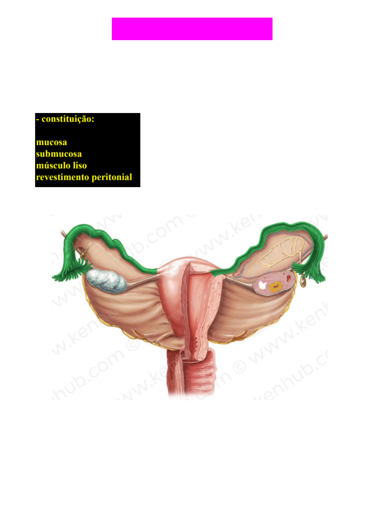 Anatomia das Tubas Uterinas As tubas uterinas (ou trompas de Falópio) são um par de órgãos musculares que se estendem dos cornos uterinos até aos pólos superiores dos ovários. As trompas de Falópio são o onde habitualmente ocorre a fertilização do óvulo. Elas também transportam o zigoto resultante para o útero para implantação. As tubas uterinas são órgãos intraperitoneais, revestidos completamente por uma parte do ligamento largo do útero chamada de mesosalpinge. Elas são constituídas por quatro partes principais: ● Infundíbulo - a parte distal da tuba uterina que se abre para a cavidade peritoneal através do óstio abdominal. O infundíbulo contém projeções em formatos de dedos chamadas de fímbrias, que se estendem sobre a superfície medial dos ovários. ● Ampola - é a parte mais longa e mais larga da tuba uterina. É o local mais comum de fertilização. ● Ístmo - é a parte mais estreita da tuba uterina ● Parte intramural (uterina) - Se comunica diretamente com a cavidade uterina através do óstio uterino. A tuba uterina recebe suprimento arterial das artérias uterina e ovariana. A primeira é um ramo da artéria ilíaca interna e a segunda emerge da aorta abdominal. A drenagem venosa das tubas uterinas é mediada pelas veias tubárias. Estas drenam para os plexos venosos uterino e pampiniforme. ● Analogia SRF e SEM