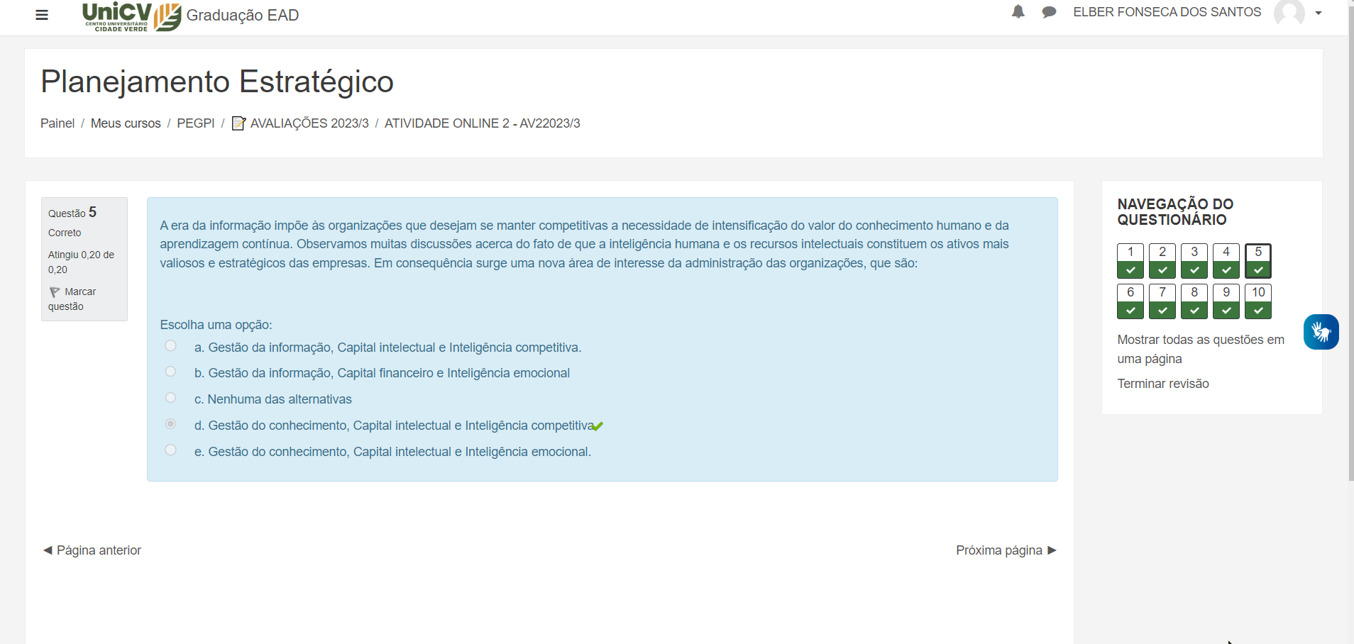 A era da informação impõe às organizações que desejam se manter competitivas a necessidade de intensificação do valor do conhecimento humano e da aprendizagem. Observamos muitas discussões acerca do fato de que a inteligência humana e os recursos intelectuais constituem os ativos mais valiosos e estratégicos das empresas. Em consequência surge uma nova área de interesse da administração das organizações, que são: Marcar questão Escolha uma opção: a. Gestão da informação, Capital intelectual e Inteligência competitiva. b. Gestão da informação, Capital financeiro e Inteligência emocional. c. Nenhuma das alternativas. d. Gestão do conhecimento, Capital intelectual e Inteligência. e. Gestão do conhecimento, Capital intelectual e Inteligência emocional.