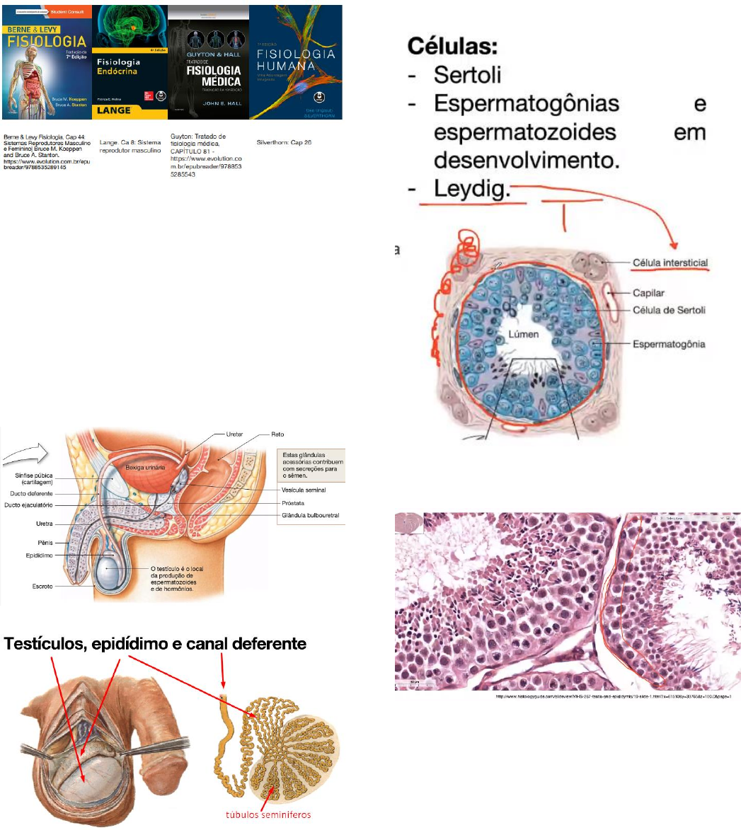 Fisiologia da Gônada Masculina Referências: Estruturas que compõem o sistema reprodutor masculino: - Pênis, uretra, testículos, canal deferente, epidídimo, próstata, glândulas bulbouretrais, ducto ejaculatório, escroto, vesícula seminal. Caminho do espermatozoide da síntese à ejaculação: Túbulos seminíferos → epidídimo → ducto deferente → ducto ejaculatório → uretra Organização do epitélio germinativo Compartimento peritubular Leydig produz testosterona com efeito local e no corpo. Estimulado pela ação do LH Compartimento intratubular Sertoli células de sustentação que irão acompanhar as espermatogônias e os espermatozoides ao longo de todo o desenvolvimento Espermatogônias coladas na lâmina basal Perceba que de periférico ao centro as células vão se diferenciando de espermatogônias à espermatozoides. Lá no interstício temos as células intersticiais ou células de Leydig, essas células produzem testosterona. Esse hormônio pode ir para o capilar (ação endócrina) ou ir se difundindo para o compartimento intratubular. Dentro desse compartimento o hormônio terá uma ação criptócrina estimulando as células de Sertoli. Entre uma célula de Sertoli e outra temos junções de oclusão, formando uma barreira chamada de hematotesticular. Essa barreira serve como proteção para toxinas, bactérias e até mesmo ação do sistema imunológico presentes no sangue. Células de Sertoli: • Circundam as células espermáticas em todos os estágios. • Junção oclusiva: separação do epitélio (barreira hematotesticular). • Receptor para FSH e testosterona. As outras células germinativas não possuem receptores para testosterona. Por ela possuir esses receptores ela irá contribuir para o processo de maturação das espermatogônias. • Converte testosterona em estradiol-17β (↑espermatogênese) pela ação da aromatase • Estimulado pela ação do FSH, produzindo: - ABP (proteína ligadoras de andrógenos, ela se liga a testosterona do espaço intratubular, garantindo uma alta concentração dentro desse espaço) - Inibina. - Líquido - Hormônio antimülleriano (regressão ducto feminino) Espermatogênese - Divisões e transformações celulares • ≅ a partir dos 10 anos até velhice. • Mitose de espermatogônias (células tronco) • Meiose: espermatócitos → espermátides (23 cromossomos) • Espermiogênese: maturação e desenvolvimento → espermatozoide • Espermiação: liberação de espermatozoides maduros. • Não tem receptor de testosterona. Hormônios do eixo hipotálamo-hipófise- testículo que controlam a espermatogênese: GH estimula divisões da espermatogônia Hipotálamo produz GnRH, é liberado no sistema porta-hipotálamo-hipofisário, vai pra adeno- hipófise e estimula as células gonadotróficas a produzir FSH e LH. FSH vai para o sangue, chega na célula de Sertoli e faz com que ela produza ABP e inibina. Essa inibina no sangue vai até a adeno- hipófise e inibe os Gonadotrofos para a liberação de FSH. O LH vai para o sangue, chega até as células intersticiais fazendo com que elas produzam testosterona, que pode ter efeitos no corpo ou dentro do compartimento intratubular (ação criptócrina). Ereção e Ejaculação 1) Epidídimo e canal deferente: - maturação e desenvolvem motilidade. (apenas epidídimo) - estocados inativos 2) Glândulas bulbouretrais secretam muco. 3) Emissão: esvaziamento do canal deferente para uretra prostática. 4) Ao mesmo tempo, as vesículas seminais e a próstata se contraem, misturando os espermatozoides ao sêmen. 5) Ejaculação: propulsão do sêmen para fora da uretra. Ereção: • Diversos estímulos para a ereção. • Inibição do simpático nas arteríolas do pênis. • Parassimpático: acetilcolina induz o relaxamento das arteríolas via óxido nítrico. • Contração de músculos da base do pênis ajudam no aumento da pressão arterial. • Aprisionamento de sangue à ereção. Dilatação das artérias helicinas Eventos neurovasculares que desencadeiam a ereção Oxido nítrico ativa a enzima GTP Ejaculação • Emissão à Ejaculação: próstata e músculos do assoalho pélvico se contraem (reflexo medular, mas há controle cerebral). Orgasmo. • Propulsão do sêmen para a uretra. Funções da Testosterona > Síntese de testosterona a partir do colesterol e mecanismo de ação Funções: >> Efeito anabolizante e androgênico. • Androgênio = hormônio esteroide que tenha efeito masculinizante. • Estimula a síntese proteica e é responsável pelas alterações nos meninos na adolescência. >> Desenvolvimento fetal • Cromossomo Y: gene SRY que codifica um fator de determinação testicular (proteína SRY) e estimula a formação do testículo. • Sertoli: hormônio anti-mülleriano (AMH), que provoca regressão dos ductos que formariam os órgãos femininos. • Leydig: testosterona e di-hidrotestosterona (DHT) [Testosterona testicular] vs. [Testosterona circulante]