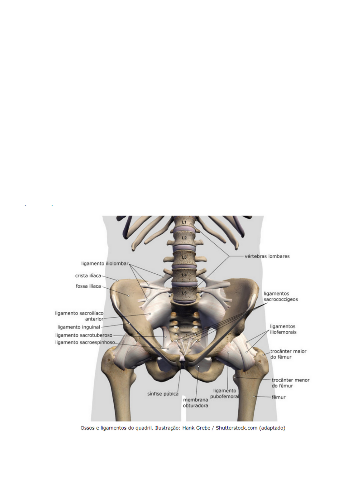 O quadril é uma das estruturas mais complexas da anatomia humana. É a estrutura responsável por sustentar o peso do corpo, estando conectado diretamente aos membros inferiores. Apesar de ser uma articulação classificada como anfiartrose, pois possui a sínfise púbica, acaba tendo uma movimentação muito restrita. Já na articulação que faz conexão com os membros inferiores, a movimentação é muito mais ampla, permitindo maiores ângulos de movimento. Na articulação sacro-ilíaca, também se realizam movimentos de amplitude restrita, caracterizando-se por ser uma articulação sinovial tipo diartrose de “esfera-soquete”, formada basicamente pela cabeça do fêmur encaixada no acetábulo do ilíaco. OSSOS E LIGAMENTOS DO QUADRIL