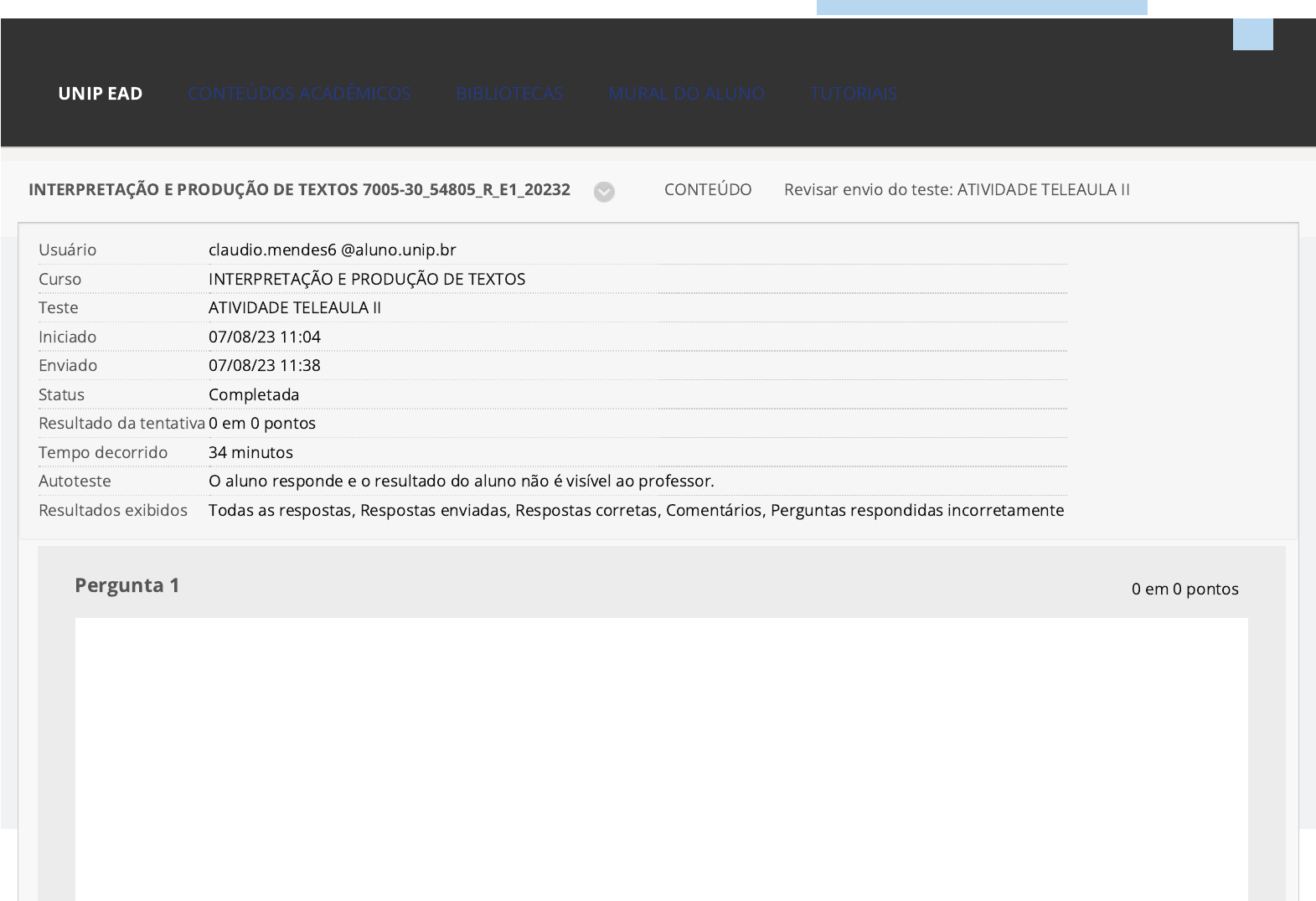 07/08/2023, 11:39 Revisar envio do teste: ATIVIDADE TELEAULA II – ... https://ava.ead.unip.br/webapps/assessment/review/review.jsp?attempt_id=_96290330_1&course_id=_295267_1&content_id=_3449585_1&return_content=1&step= 1/7 Revisar envio do teste: ATIVIDADE TELEAULA IIINTERPRETAÇÃO E PRODUÇÃO DE TEXTOS 7005-30_54805_R_E1_20232 CONTEÚDO Usuário claudio.mendes6 @aluno.unip.br Curso INTERPRETAÇÃO E PRODUÇÃO DE TEXTOS Teste ATIVIDADE TELEAULA II Iniciado 07/08/23 11:04 Enviado 07/08/23 11:38 Status Completada Resultado da tentativa 0 em 0 pontos Tempo decorrido 34 minutos Autoteste O aluno responde e o resultado do aluno não é visível ao professor. Resultados exibidos Todas as respostas, Respostas enviadas, Respostas corretas, Comentários, Perguntas respondidas incorretamente Pergunta 1 CONTEÚDOS ACADÊMICOS BIBLIOTECAS MURAL DO ALUNO TUTORIAISUNIP EAD 0 em 0 pontos http://company.blackboard.com/ https://ava.ead.unip.br/webapps/blackboard/execute/courseMain?course_id=_295267_1 https://ava.ead.unip.br/webapps/blackboard/content/listContent.jsp?course_id=_295267_1&content_id=_3448804_1&mode=reset https://ava.ead.unip.br/webapps/portal/execute/tabs/tabAction?tab_tab_group_id=_25_1 https://ava.ead.unip.br/webapps/portal/execute/tabs/tabAction?tab_tab_group_id=_27_1 https://ava.ead.unip.br/webapps/portal/execute/tabs/tabAction?tab_tab_group_id=_47_1 https://ava.ead.unip.br/webapps/portal/execute/tabs/tabAction?tab_tab_group_id=_29_1 https://ava.ead.unip.br/webapps/portal/execute/tabs/tabAction?tab_tab_group_id=_10_1 https://ava.ead.unip.br/webapps/login/?action=logout Elaine Destacar 07/08/2023, 11:39 Revisar envio do teste: ATIVIDADE TELEAULA II – ... https://ava.ead.unip.br/webapps/assessment/review/review.jsp?attempt_id=_96290330_1&course_id=_295267_1&content_id=_3449585_1&return_content=1&step= 2/7 Resposta Selecionada: d. Respostas: a. b. Fonte: 06_CS_PUBLICIDADE_PROPAGANDA.PDF. 2015, p. 17. Disponível em: http://download.inep.gov.br/educacao_superior/enade/provas/ 2015/06_cs_publicidade_propaganda.pdf. Para cobrar, se você executar uma leitura apenas da mensagem não verbal, sem o texto verbal, conseguirá entender o que é um momento na família, mas não a intenção do autor. Qual é a relação entre o título e a situação representada? A relação estabelecida revela que, apesar do título "tempos modernos" e da proximidade das pessoas no espaço físico, não reflete a união da família. A relação estabelecida revela os benefícios dos relacionamentos a distância, ou seja, a facilidade na comunicação, a facilidade de interação familiar representada na charge. A relação estabelecida revela que as novas tecnologias favorecem as relações familiares, pois os internautas aprendem coisas novas o tempo todo. 07/08/2023, 11:39 Revisar envio do teste: ATIVIDADE TELEAULA II – ... https://ava.ead.unip.br/webapps/assessment/review/review.jsp?attempt_id=_96290330_1&course_id=_295267_1&content_id=_3449585_1&return_content=1&step= 3/7 c. d. e. Comentário da resposta: A relação estabelecida revela que as redes sociais são plataformas sociais virtuais compostas por pessoas conectadas e que dividem valores, objetivos, interesses e ideologias comuns à família. A relação estabelecida revela que, apesar do título "tempos modernos" e da proximidade das pessoas no espaço físico, não reflete a união da família. A relação estabelecida revela que, apesar da falta de proximidade no espaço físico, reflete a união da família. Resposta: D Pergunta 2 Resposta Selecionada: b. Respostas: a. b. De Bar Em Bar, De Mesa Em Mesa (Nome de uma música de banda regional brasileira, Aviões do forró) De bar em bar, de mesa em mesa Bebendo cachaça, tomando cerveja. De bar em bar, de mesa em mesa Bebendo cachaça, tomando cerveja. (...) Ao designar o mundo, utilizamos termos de um mesmo campo de sentido em que se relacionam a uma espécie, como propostas de sentidos. O texto produzido pressupõe uma organização discursivo-textual adequada à situação de comunicação. Desse modo, identifique qual a predominância do tipo de texto que constitui o fragmento da música: Narrativo. Descritivo. Narrativo. 0 em 0 pontos 07/08/2023, 11:39 Revisar envio do teste: ATIVIDADE TELEAULA II – ... https://ava.ead.unip.br/webapps/assessment/review/review.jsp?attempt_id=_96290330_1&course_id=_295267_1&content_id=_3449585_1&return_content=1&step= 4/7 c. d. e. Comentário da resposta: Argumentativo. Enunciativo. Dissertativo. Resposta: B Pergunta 3 Fonte: F12016QZ.PDF. 2016, p. 23. Disponível em: http://www.comvest.unicamp.br/wp-content/ uploads/2017/02/f12016QZ.pdf. Embora a fotografia seja normalmente um texto exclusivamente não verbal, encontramos aquelas em que o registro contempla também algo escrito. Nesses casos, a composição da mensagem depende da leitura conjunta dos elementos verbais e não verbais. Sendo assim, 0 em 0 pontos 07/08/2023, 11:39 Revisar envio do teste: ATIVIDADE TELEAULA II – ... https://ava.ead.unip.br/webapps/assessment/review/review.jsp?attempt_id=_96290330_1&course_id=_295267_1&content_id=_3449585_1&return_content=1&step= 5/7 Resposta Selecionada: c. Respostas: a. b. c. d. e. Comentário da resposta: considerando o outdoor, temos um exemplo de: Metalinguagem. Metáfora. Paráfrase. Metalinguagem. Operação. Causalidade. Resposta: C Pergunta 4 0 em 0 pontos 07/08/2023, 11:39 Revisar envio do teste: ATIVIDADE TELEAULA II – ... https://ava.ead.unip.br/webapps/assessment/review/review.jsp?attempt_id=_96290330_1&course_id=_295267_1&content_id=_3449585_1&return_content=1&step= 6/7 Resposta Selecionada: e. Respostas: a. b. c. d. e. Comentário da resposta: Fonte: http://rizomas.net/images/phocagallery/charges/thumbs/phoca_thumb_l_educacao-charges-aula-virtual.jpg A comunicação mediada pelo computador traz uma nova abordagem no tratamento dos gêneros textuais discursivos, na medida em que repensa a relação entre as pessoas e suas práticas sociais.