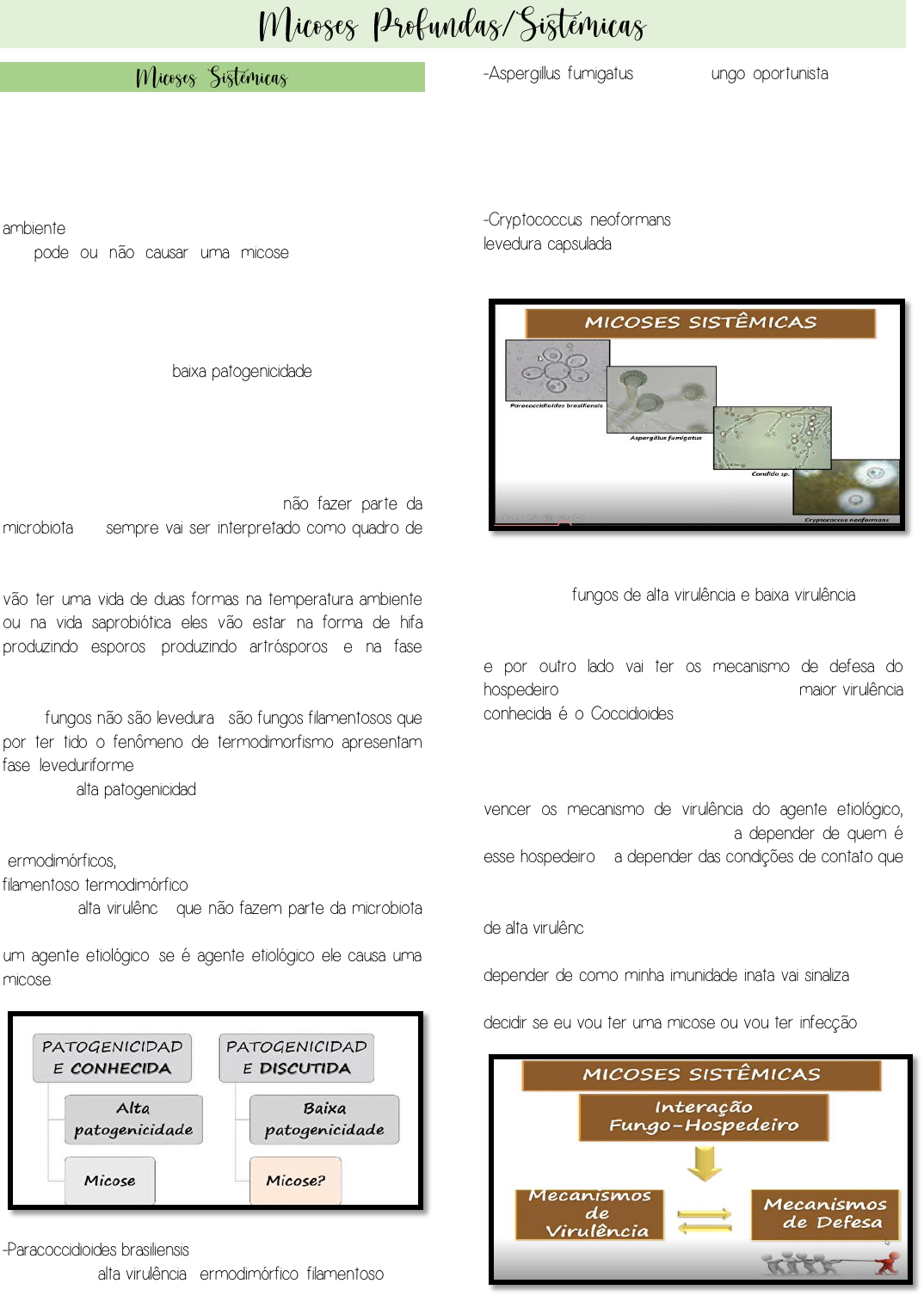 • Fungos Filamentosos: Dimórficos e não dimórficos • Leveduras: Dimórficas e não dimórficas Fungo com patogenicidade discutida: Pode ser um fungo da microbiota, um fungo da vida saprobiótica, quer dizer, no meio ambiente, mas que pela baixa patogenicidade que apresenta ele pode ou não causar uma micose. São fungos que convivemos com eles no dia a dia, por exemplo esporos do gênero Aspergillus, algumas espécies de levedura do gênero Cândida que está na microbiota, espécies do grupo de Zicomicetos. São fungos que podem causar micose, mas são chamados de fungos de baixa patogenicidade Fungo com patogenicidade conhecida: São fungos que apresentam alta patogenicidade, tem alta virulência, portanto, toda vez quando observar a presença da estrutura desses fungos de alta patogenicidade em um material biológico, obter ele em um meio de cultura, por ele não fazer parte da microbiota ele sempre vai ser interpretado como quadro de uma micose, por isso esses fungos de alta virulência, todos são fungos filamentosos termodimórficos, significa que todos vão ter uma vida de duas formas na temperatura ambiente ou na vida saprobiótica eles vão estar na forma de hifa produzindo esporos, produzindo artrósporos, e na fase parasitária ou cultivado a 35-37ºC eles vão converter a uma forma semelhante a levedura, chamada de fase leveduriforme, esses fungos não são leveduras, são fungos filamentosos que por ter tido o fenômeno de termodimorfismo apresentam fase leveduriforme. Nossa aula vai ser direcionada para os fungos de alta patogenicidade, quando eu digo, eu estou com um fungo de patogenicidade conhecida, alta virulência, e tem que entender que está trabalhando com fungos filamentosos termodimórficos, então quando falar que é um fungo filamentoso termodimórfico, ela está falando em um grupo de fungos de alta virulência, que não fazem parte da microbiota e toda vez que observar a estrutura desse fungo ele vai ser um agente etiológico, se é agente etiológico ele causa uma micose. -Paracoccidioides brasiliensis→ é agente etiológico de micoses sistêmicas de alta virulência, termodimórfico, filamentoso. -Aspergillus fumigatus→ é um fungo oportunista que pode causar uma micose sistêmica, mas ele é de baixa virulência. Filamentoso de baixa virulência e não é termodimorfica. -Candida sp.→ Possui dimorfismo. Levedura oportunista com dimorfismo. -Cryptococcus neoformans→ Que é conhecida como uma levedura capsulada Levedura onde algumas espécies podem ser oportunistas e outras não, mas ela não é dimórfica. Importância da interação fungo-hospedeiro, nós temos alguns dados sobre fungos de alta virulência e baixa virulência, então como todo ser vivo esses fungos tem mecanismo de virulência e esse mecanismo para sobrevivência desse agente e por outro lado vai ter os mecanismo de defesa do hospedeiro, então o fungo que nós temos de maior virulência conhecida é o Coccidioides e mesmo assim nós temos um mecanismo de defesa capaz de nos defender do fungo de maior virulência conhecida, (slide)→ Ora vai ter os mecanismos de defesa ora vai vencer os mecanismos de defesa ora vai vencer os mecanismo de virulência do agente etiológico, temos um cabo de guerra. Então, a depender de quem é esse hospedeiro e a depender das condições de contato que eu tinha com aquele propágulo fungo, a depender de quanto de partícula fungica eu entro em contato, se aquela cepa é de alta virulência, mas nem toda cepa tem a mesma virulência, tem cepas de alta virulência, mais virulência do que outras, vai depender de como minha imunidade inata vai sinalizar, como a imunidade inata vai sinalizar a imunidade adaptativa é que vai decidir se eu vou ter uma micose ou vou ter infecção. O gênero Paracoccidioides, tem como principal mecanismo de evadir, ou seja, burlar o sistema imune é essa brotação múltipla, inicialmente é uma única célula de duplo contorno, que tem duas camadas, se for uma célula pequena ela vai ser facilmente fagocitada, então ele faz um processo chamado de reprodução assexuada por brotação múltipla que vai permitir o aumento dessa estrutura fungica, dificultando assim a ação do sistema fagocitário. O Histoplasma capsulatum, a estrutura fúngica é muito pequena, (pontinhos azuis no interior de uma célula do sistema fagocitário), esse fungo não faz brotação múltipla, não filamenta, ele é pequeno. Então esse propágulo fúngico é facilmente fagocitado, para se adaptar a vida parasitária ele tem mecanismo de sobrevivência no interior do fagossomo, esse fungo tem preferência, ele se adaptou a viver no meio intracelular Coccidioides sp., ele vai ter uma estrutura maior que chamamos de esférula, essa esférula é pequena a medida que vai se desenvolvendo ela vai aumentando de tamanho, então esse aumento de tamanho dificulta a ação do sistema imune. Então, cada um desses fungos apresenta um mecanismo para poder sobreviver, e dos três agentes estou destacando o de vida intracelular que é o Histoplasma capsulatum, ele tem essa particularidade, parasitismo e vida intracelular. O ideal do sistema imune é que ele atue através da imunidade inata e sistema imune adaptativo para controlar essas partículas que nós inalamos para poder não causar doença, causar apenas infecção, quer dizer, tive contato com o propágulo fúngico, fui imunocompetente pela imunidade inata e imunidade adaptativa. A imunocompetência para fungo de alta virulência termodimórfico é baseada na imunidade inata, nas nossas células NK, fagócitos, nas barreiras epiteliais e no sistema complemento, mas muitas vezes a imunidade inata não é suficiente, então a imunidade inata vai sinalizar a imunidade adaptativa e no mesmo quem vai conferir imunidade competente é a imunidade celular pelos linfócitos T, a imunidade humoral não é protetora para fungos de alta virulência, então quem nos defende dos propágulos fúngicos que n