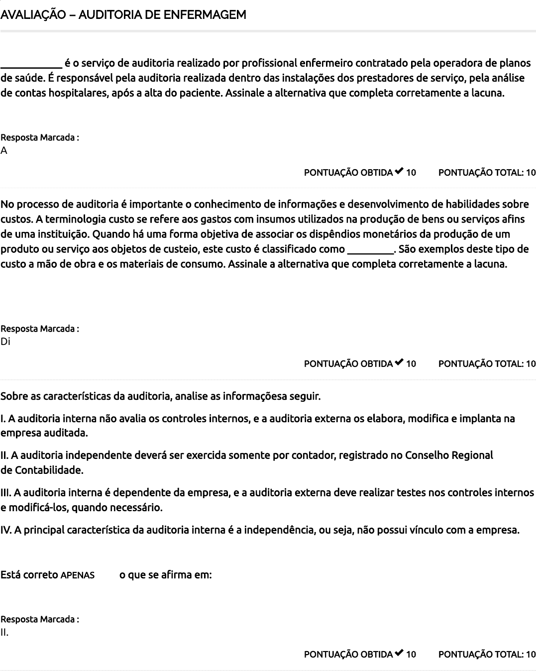 09/08/2023, 15:14 Course Status – Faculdade Facuvale https://ava.faculdadefacuvale.universaeducacional.com.br/course-status/ 1/3 AVALIAÇÃO – AUDITORIA DE ENFERMAGEM PONTUAÇÃO TOTAL: 10PONTUAÇÃO OBTIDA 10 ____________ é o serviço de auditoria realizado por pro�ssional enfermeiro contratado pela operadora de planos de saúde. É responsável pela auditoria realizada dentro das instalações dos prestadores de serviço, pela análise de contas hospitalares, após a alta do paciente. Assinale a alternativa que completa corretamente a lacuna. Resposta Marcada : Auditoria de Enfermagem Externa na Operadora de Planos de Saúde. PONTUAÇÃO TOTAL: 10PONTUAÇÃO OBTIDA 10 No processo de auditoria é importante o conhecimento de informações e desenvolvimento de habilidades sobre custos. A terminologia custo se refere aos gastos com insumos utilizados na produção de bens ou serviços a�ns de uma instituição. Quando há uma forma objetiva de associar os dispêndios monetários da produção de um produto ou serviço aos objetos de custeio, este custo é classi�cado como _________. São exemplos deste tipo de custo a mão de obra e os materiais de consumo. Assinale a alternativa que completa corretamente a lacuna. Resposta Marcada : Direto. PONTUAÇÃO TOTAL: 10PONTUAÇÃO OBTIDA 10 Sobre as características da auditoria, analise as informaçõesa seguir. I. A auditoria interna não avalia os controles internos, e a auditoria externa os elabora, modi�ca e implanta na empresa auditada. II. A auditoria independente deverá ser exercida somente por contador, registrado no Conselho Regional de Contabilidade. III. A auditoria interna é dependente da empresa, e a auditoria externa deve realizar testes nos controles internos e modi�cá-los, quando necessário. IV. A principal característica da auditoria interna é a independência, ou seja, não possui vínculo com a empresa. Está correto APENAS o que se a�rma em: Resposta Marcada : II. 09/08/2023, 15:14 Course Status – Faculdade Facuvale https://ava.faculdadefacuvale.universaeducacional.com.br/course-status/ 2/3 PONTUAÇÃO TOTAL: 10PONTUAÇÃO OBTIDA 10 Considere as a�rmações abaixo, relacionadas às diferenças entre auditoria externa e interna. I. A auditoria externa é eventual, enquanto a auditoria interna é periódica. II. O auditor externo não tem vínculo empregatício com a empresa auditada e dependência hierárquica da administração. III. O trabalho do auditor interno é direcionado para assegurar que o sistema contábil e o de controle interno funcionam e�cientemente. O correto está em: Resposta Marcada : I, II e III. PONTUAÇÃO TOTAL: 10PONTUAÇÃO OBTIDA 10 Considerando a auditoria em enfermagem, analise as a�rmativas abaixo, dê valores Verdadeiro (V) ou Falso (F). ( ) A auditoria de resultados determina quais resultados foram alcançados quanto ao local em que se dá o cuidado ao paciente. ( ) A auditoria em enfermagem realiza análise crítica e sistemática da qualidade da assistência de Enfermagem prestada aos pacientes, ocorrendo a comparação do atendimento prestado com os padrões de atendimento. ( ) As auditorias realizadas no serviço de Enfermagem incluem avaliações de resultado, de processo e de estrutura. ( ) A auditoria de estrutura monitora a consequência de intervenções especí�cas de Enfermagem. Assinale a alternativa que apresenta a sequência correta de cima para baixo. Resposta Marcada : F,V,V,F. PONTUAÇÃO TOTAL: 10PONTUAÇÃO OBTIDA 10 Quanto às diferenças entre auditoria externa e interna, é correto a�rmar: Resposta Marcada : O auditor externo não pode ter vínculo empregatício com a empresa. 09/08/2023, 15:14 Course Status – Faculdade Facuvale https://ava.faculdadefacuvale.universaeducacional.com.br/course-status/ 3/3 90 / 100 PONTUAÇÃO TOTAL: 10PONTUAÇÃO OBTIDA 10 A auditoria de Enfermagem tem uma área de atuação grande, podendo ser realizada nos serviços de educação continuada e de faturamento, nas operadoras de planos de saúde, entre outros. O serviço de auditoria realizado por um Enfermeiro Auditor contratado pela operadora, podendo ser registrado ou consultor, que será responsável pela análise das contas hospitalares após a alta do paciente, sendo realizada dentro das instalações dos prestadores de serviços é denominada como: Resposta Marcada : Auditoria externa. PONTUAÇÃO TOTAL: 10PONTUAÇÃO OBTIDA 10 A equipe de auditoria, após constatar irregularidade em uma conta hospitalar de um paciente X, veri�ca que há um motivo para aplicação de glosa total. De acordo o Sistema Nacional de Auditoria (SNA) – Federal, um dos motivos para glosa total é: Resposta Marcada : Pacientes com registros de internados, porém não encontrados no hospital. PONTUAÇÃO TOTAL: 10PONTUAÇÃO OBTIDA 0 Por que a auditoria no SUS é importante? Resposta Marcada : Favorece o uso de recursos com a �nalidade de diminuir o desperdício e combater a corrupção. PONTUAÇÃO TOTAL: 10PONTUAÇÃO OBTIDA 10 Considerando as auditorias como instrumento de controle de qualidade, na área da enfermagem, o enfermeiro recorre: Resposta Marcada : À auditoria de estrutura para estabelecer a existência de uma relação entre atendimento de qualidade e estrutura adequada, como a análise do aporte de recursos e o ambiente em que é prestado o atendimento. Total