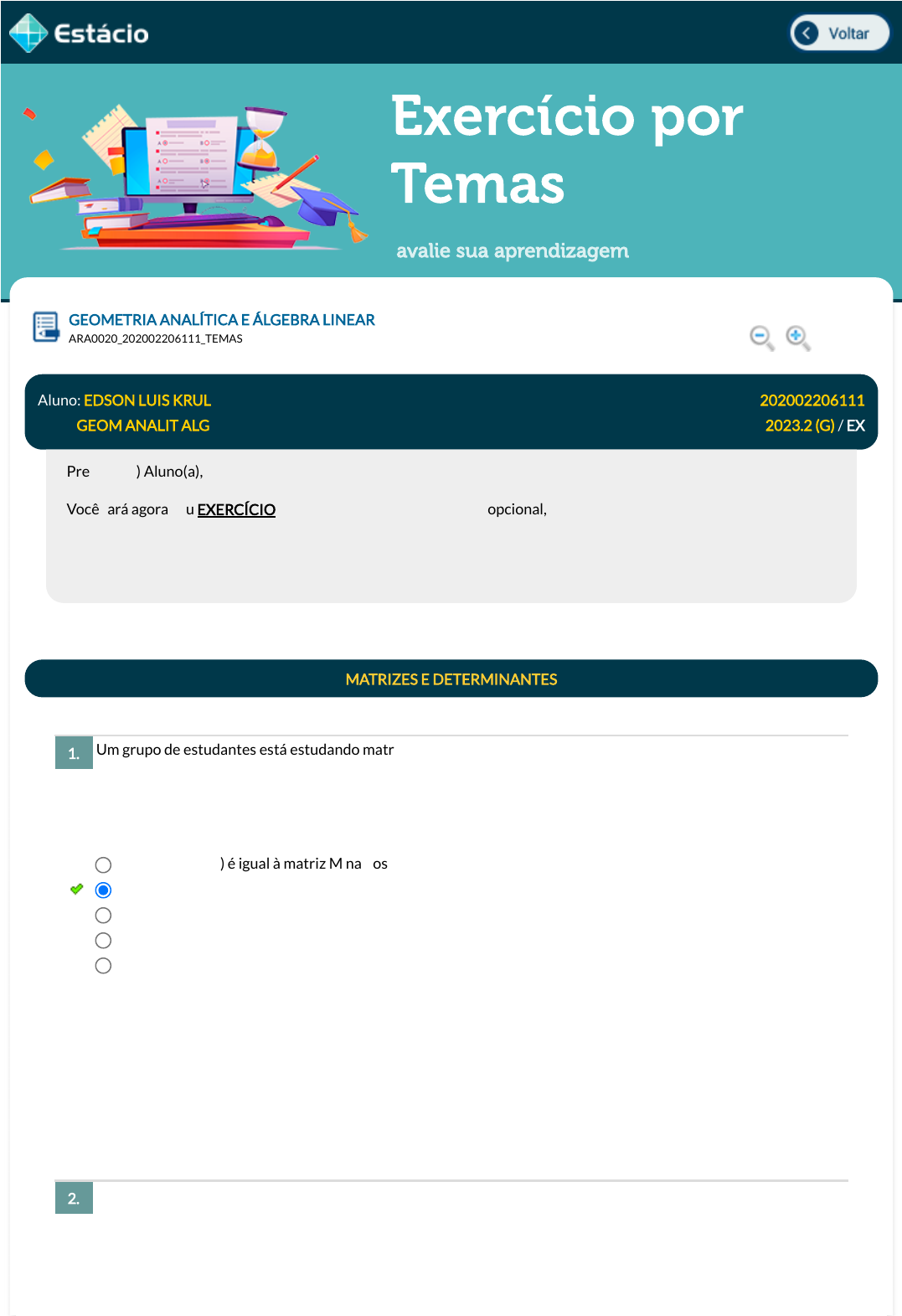 Exercício por Temas avalie sua aprendizagem Um grupo de estudantes está estudando matrizes em um curso de matemática aplicada. Durante uma aula, o professor explica a de�nição de matriz como um agrupamento ordenado de elementos em uma forma retangular com linhas e colunas. Ele também destaca a notação para representar os elementos individuais da matriz. Considerando a de�nição de matriz e sua notação, qual das seguintes alternativas corretamente descreve a representação de um elemento especí�co (aij) da matriz M? Um departamento de engenharia está desenvolvendo um software para realizar cálculos e operações com matrizes. Durante o processo de desenvolvimento, a equipe precisa garantir que as operações de adição e subtração de matrizes sejam realizadas corretamente, levando em consideração o tamanho das matrizes envolvidas. Considerando a de�nição de adição e subtração de matrizes, qual das seguintes alternativas corretamente descreve as condições necessárias para realizar essas operações? GEOMETRIA ANALÍTICA E ÁLGEBRA LINEAR Lupa ARA0020_202002206111_TEMAS Aluno: EDSON LUIS KRUL Matr.: 202002206111 Disc.: GEOM ANALIT ALG 2023.2 (G) / EX Prezado (a) Aluno(a), Você fará agora seu EXERCÍCIO! Lembre-se que este exercício é opcional, mas não valerá ponto para sua avaliação. O mesmo será composto de questões de múltipla escolha. Após responde cada questão, você terá acesso ao gabarito comentado e/ou à explicação da mesma. Aproveite para se familiarizar com este modelo de questões que será usado na sua AV e AVS. MATRIZES E DETERMINANTES 1. O elemento (aij) é igual à matriz M na posição (i+j). O elemento (aij) é o elemento da matriz M na posição i, j representado por (M)ij = aij. O elemento (aij) é o resultado da multiplicação entre a linha i e a coluna j da matriz M. O elemento (aij) é a soma dos elementos das linhas i e j da matriz M. O elemento (aij) é o resultado da divisão entre a linha i e a coluna j da matriz M. Data Resp.: 10/08/2023 18:36:49 Explicação: De acordo com a de�nição apresentada, o elemento (aij) da matriz M é representado por (M)ij = aij. Isso signi�ca que o elemento na posição i, j da matriz M é exatamente igual a aij. 2. javascript:voltar(); javascript:voltar(); javascript:diminui(); javascript:aumenta(); Durante uma aula, o professor destaca que as matrizes podem receber diferentes denominações com base em seu tamanho e/ou valores dos elementos. Ele menciona alguns exemplos comuns, como matriz (ou vetor) linha, matriz (ou vetor) coluna e matriz quadrada. Considerando as denominações das matrizes com base em seu tamanho e/ou valores dos elementos, qual das seguintes alternativas corretamente descreve uma matriz quadrada? Uma aplicação comum para o uso de matrizes é na resolução de sistemas lineares. Os sistemas lineares são utilizados para modelar uma variedade de problemas em diversas áreas, como engenharia, física, economia, entre outras. Considere as matrizes e valor da expressäo é: A adição e subtração de matrizes são de�nidas independentemente do tamanho das matrizes envolvidas. A adição e subtração de matrizes são de�nidas apenas se elas tiverem o mesmo número de linhas e colunas. A adição e subtração de matrizes são de�nidas apenas se elas tiverem o mesmo número de elementos. A adição de matrizes é de�nida apenas se elas tiverem o mesmo número de colunas, mas o número de linhas pode ser diferente. A adição de matrizes é de�nida apenas se elas tiverem o mesmo número de linhas, mas o número de colunas pode ser diferente. Data Resp.: 10/08/2023 18:37:19 Explicação: Para que as operações de adição e subtração sejam realizadas entre duas matrizes, é necessário que elas tenham o mesmo número de linhas e colunas. A adição de matrizes é feita somando os elementos correspondentes de cada matriz para obter a matriz resultante, enquanto a subtração é feita subtraindo os elementos correspondentes. Essas operações requerem que os elementos a serem somados ou subtraídos estejam em posições correspondentes nas matrizes envolvidas. 3. Uma matriz quadrada é aquela em que o número de linhas é igual ao número de colunas. Uma matriz quadrada é aquela em que o número de linhas é sempre maior que o número de colunas. Uma matriz quadrada é aquela que possui mais colunas do que linhas. Uma matriz quadrada é aquela que possui apenas um elemento. Uma matriz quadrada é aquela em que todos os seus elementos possuem o mesmo valor. Data Resp.: 10/08/2023 18:38:43 Explicação: Uma matriz quadrada é de�nida como uma matriz em que o número de linhas é igual ao número de colunas. Isso signi�ca que ela possui a mesma quantidade de linhas e colunas. Por exemplo, uma matriz 3x3, onde possui 3 linhas e 3 colunas, é uma matriz quadrada. As matrizes quadradas são importantes em muitos aspectos da álgebra linear e têm propriedades distintas. 4. . . . . . Data Resp.: 10/08/2023 18:38:51 Explicação: A = [ 5 2 2 −1 ] , B = [ 14 −2 3 −1 ] C = [ √6 √33 √2 −1 ] .0 y = det(A)x det(B) det(C) 3(√6−√66) 5 5(√33−√66) 5 6(√6−√66) 5 5(√6−√66) 6 6(√2−√5) 5 Um grupo de cientistas está estudando transformações geométricas no espaço tridimensional. Eles utilizam matrizes para representar essas transformações. Durante suas pesquisas, eles descobriram um tipo especial de matriz chamada de matriz ortogonal. Qual é a de�nição correta de uma matriz ortogonal? Sabe que P = 2M-1. Calcule o determinante de P, sabendo que a matriz M = : Calculando os determinantes das matrizes: Resolvendo a expressäo: 5. É uma matriz cuja inversa é igual à sua transposta. É uma matriz que possui elementos simétricos em relação à sua diagonal principal. É uma matriz que possui o mesmo número de linhas e colunas. É uma matriz que possui apenas números positivos em suas entradas. É uma matriz 