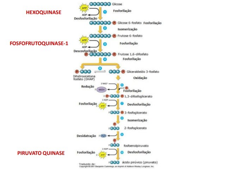 Glicólise> Quebra da glicose para gerar energia Glicose sofrendo oxidação em piruvato e atp Enzima reguladora: regula a velocidade de uma via metabólica - São irreversíveis · Se duas enzimas que fazem reações contrárias, reguladoras e que não ficam ativas ao mesmo tempo, isso quer dizer que quando a glicólise é desativada, tem a gliconeogênese · Se já tem muita energia o processo para Dividida em 2 fases 1ª Fase: preparatória (1-5) (fase das hexoses) Maioria dos açúcares são de 6 carbonos -Prepara o açúcar para ser quebrado -Gasta ATP 2ª fase: Pagamento (6-10) (fase das trioses) -3 Carbonos - Gera ATP 1ª Reação- Reguladora e irreversível Enzima: Hexoquinase Substrato: Glicose Reação: Glicose -> Glicose 6-fosfato Produto: Glicose 6-fosfato (que é substrato da 2ª reação) Descrição: A glicose sofre fosforilação, ou seja, ganha um fosfato (P) que se liga no 6º carbono e vira glicose 6-fosfato. -Fosfato veio do ATP (ATP->ADP + P) Custo: 1 ATP GLUT transporta glicose a favor do gradiente de concentração -acabou de comer> glut leva pra dentro>se ela não for quebrada a glut transporta de volta. Glicose> g6p (Depois da conversão não pode mais ser carregada pelo GLUT) -ATP>ADP 2ª Reação Substrato: Glicose 6-fosfato Reação: Glicose 6-P > Frutose-6-P Produto: Frutose-6-fosfato Descrição: A G6P sofre isomerização e se transforma em Frutose-6-P 3ª Reação -Reguladora e irreversível Substrato: Frutose 6-fosfato Reação: Frutose 6-fosfato > Frutose 1,6-bifosfato Produto: Frutose 1,6-bifosfato Descrição: A Frutose 6-P sofre fosforilação, ou seja, ganha um fosfato (P) que se liga no 1º carbono da F-6P que se torna frutose 1,6-bifosfato -Fosfato veio do ATP Custo: 1 ATP Enzima: Fosfofrutoquinase-1 (PFK1) -Quinase: fosforila Fosforila quem? A fosfofrutose (uma frutose que já tinha fosfato) -Fosforila onde? No Carbono 1 4ª Reação Substrato: Frutose 1,6-bifosfato Produto: Gliceraldeído 3-fosfato e dihidroxicetona fosfato (DHAP) Reação: Frutose 1,6-bifosfato < Gliceraldeido 3-fosfato e dihidroxicetona fosfato (DHAP) Descrição: Uma hexose (F-1,6P) formando duas Trioses, cada uma com um fosfato. A Frutose 1,6-bifosfato é quebrada no meio, formando Gliceraldeído 3-fosfato e dihidroxicetona fosfato (DHAP) - Substrato é uma cetose 5ª Reação Substrato: dihidroxicetona fosfato (DHAP) Produto: Gliceraldeído 3-fosfato Reação: dihidroxicetona fosfato (DHAP) > Gliceraldeído 3-fosfato Descrição: A isomerização do DHAP em gliceraldeído 3-fosfato Produto final da 1ª fase: 2 Gliceraldeído 3-fosfato e 2 ATPS gastos FASE DE PAGAMENTO 6ª Reação Substrato: Gliceraldeído 3-fosfato Produto: 1,3 bifosfoglicerato Reação: Gliceraldeído 3-fosfato > 1,3 bifosfoglicerato Descrição: A enzima usa fosfato livre (inorgânico) e fosforila o gliceraldeído 3-P em 1,3 bifosfoglicerato, ligando no carbono 1, os Hidrogenios que saem se ligam no NAD formando NADH + H+ Obs: NAD é um transportador de elétrons e precisa estar oxidado, na forma de NAD para receber o H+z NAD> Oxidado NADH> Reduzido 7ª Reação Substrato: 1,3 bifosfoglicerato Produto: 3-fosfoglicerato Reação: 1,3 bifosfoglicerato> 3-fosfoglicerato Descrição: Desfosforilação da 1,3 -BFG em 3-Pglicerato, onde o fosfato do carbono 1 vai para ADP que ao ganhar um fosfato se transforma em ATP 8ª Reação Substrato: 3-fosfoglicerato Produto: 2-fosfoglicerato Reação: 3 Fosfoglicerato> 3-fosfoglicerato Descrição: isomerização 3-fosfoglicerato em 2-fosfoglicerato 9ª Reação Substrato: 2-fosfoglicerato Produto: Reação: 2-fosfoglicerato > fosfoenolpiruvato Descrição: Desidratação 10ª Reação - Reguladora Enzima: Hexoquinase Substrato: fosfoenolpiruvato Produto: 2 ATPS 2 H2O 2 PIRUVATOS 2 NADH Reação: Descrição: Em que local acontece a glicólise? citosol função da glicólise Gerar energia Quantos ATPS no total produzimos na glicólise? Qual o saldo positivo? 4. 2 Enzimas: 10 Reguladoras: 3 -Hexoquinase -Fosfofrutoquinase-1 -Piruvato quinase Importância da fosforilação A glicose entra na celular e é fosforilada, até o final da reação todos os intermediários tinham fosfato, até a última reação. Quando ela foi desfosforilada ela gerou ATP (o fosfato que saiu dela se liga a um ADP gerando um ATP). Várias enzimas da glicólise dependem do Mg+², magnésio tem carga positivo e o substrato da enzima, tem fosfato, que por sua vez tem carga negativa, que é atraída pela carga positiva do mg e facilita a ligação do substrato ao sitio ativo da enzima cofator: Mg+² Logo a importância é: -prende a glicose na célula -quando tira o fosfato gera ATP -permite a ligação da enzima com seu substrato pq o substrato que tem fosfato é atraído pelo Mg+² que se encontra no sitio ativo da enzima. Regulação da glicólise: HEXOQUINASE > Catalisa a primeira reação: glicose-p -isoenzimas: Catalisam a mesma reação de formas diferentes 2 isoformas: Hexoquinase (I, II e III) (músculo) – KM baixo -Alta afinidade pela glicose -Inibida por glicose 6-fosfato, que é seu produto (Regulação alostérica) – A G6P se liga no sitio alostérico para inibir, a concentração tem que estar alta Hexoquinase D ou Glicoquinase (IV) (fígado) – KM alto -Baixa afinidade pela glicose -Inibida por frutose 6-fosfato (interação irreversível com uma proteína reguladora específica do fígado FOSFOFRUTOQUINASE-1 (PFK-1) -Função: gerar energia, quando a [ ] de ATP estiver baixa, a glicólise aumenta. AMP-> monofosfato, inversamente proporcional ao ATP, junto com ADP, logo um aumento de ADP E AMP esta relacionado a diminuição de ATP (faltando energia>aumenta a glicólise) Resumo: 1 glicose > fase preparatória > fase de pagamento (x2) Produto da glicólise: 2 ATPS 2 PIRUVATOS 2 NADH E 2 H20 NADH precisa ser convertido em NAD na fermentação para continuar o ciclo: FERMENTAÇÃO EX: hemácia não tem mitocôndria, a única via de obtenção de ATP é a glicólise e fermentação p