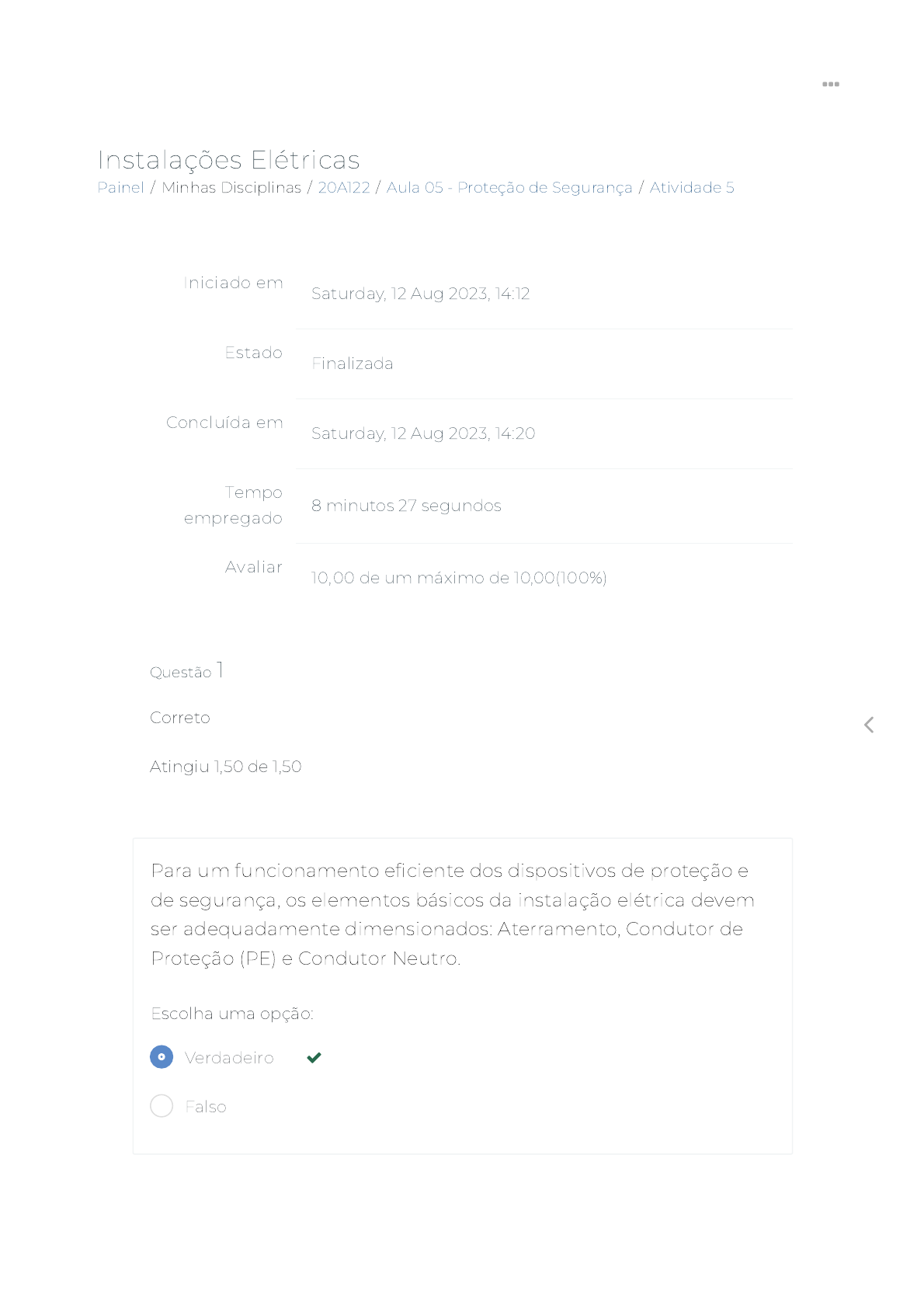 12/08/2023 Atividade 5 https://ava.politecnicabr.com.br/mod/quiz/review.php?attempt=5397936 1/6 Painel / Minhas Disciplinas / 20A122 / Aula 05 - Proteção de Segurança / Atividade 5 Instalações Elétricas Iniciado em Saturday, 12 Aug 2023, 14:12 Estado Finalizada Concluída em Saturday, 12 Aug 2023, 14:20 Tempo empregado 8 minutos 27 segundos Avaliar 10,00 de um máximo de 10,00(100%) Questão 1 Correto Atingiu 1,50 de 1,50 Para um funcionamento e�ciente dos dispositivos de proteção e de segurança, os elementos básicos da instalação elétrica devem ser adequadamente dimensionados: Aterramento, Condutor de Proteção (PE) e Condutor Neutro. Escolha uma opção: Verdadeiro Falso https://ava.politecnicabr.com.br/my/ https://ava.politecnicabr.com.br/course/view.php?id=959 https://ava.politecnicabr.com.br/course/view.php?id=959#section-6 https://ava.politecnicabr.com.br/mod/quiz/view.php?id=32489 https://ava.politecnicabr.com.br/ 12/08/2023 Atividade 5 https://ava.politecnicabr.com.br/mod/quiz/review.php?attempt=5397936 2/6 Questão 2 Correto Atingiu 1,50 de 1,50 Uma instalação elétrica interna está sujeita a defeitos e acidentes de diversas naturezas, sendo, portanto, necessária a existência de um sistema de proteção e segurança adequados, a �m de evitar maiores danos. Escolha uma opção: Verdadeiro Falso https://ava.politecnicabr.com.br/ 12/08/2023 Atividade 5 https://ava.politecnicabr.com.br/mod/quiz/review.php?attempt=5397936 3/6 Questão 3 Correto Atingiu 1,00 de 1,00 Uma pessoa com uma parte metálica de uma instalação ou de um componente, normalmente sem tensão elétrica, mas que pode �car energizada devido a falhas no isolamento ou por uma falha interna (curto-circuito). Exemplo: encostar-se à carcaça de uma máquina de lavar, que está com defeitos no isolamento. Estamos falando de: Escolha uma opção: a. Falha elétrica b. Contato Indireto c. Contato Direto d. Choque ocasional https://ava.politecnicabr.com.br/ 12/08/2023 Atividade 5 https://ava.politecnicabr.com.br/mod/quiz/review.php?attempt=5397936 4/6 Questão 4 Correto Atingiu 1,50 de 1,50 Isolação Dupla: é a isolação composta por duas Isolações Básica. Escolha uma opção: Questão 5 Correto Atingiu 1,50 de 1,50 Choque elétrico é a perturbação, de natureza e efeitos diversos, que se manifesta no organismo humano (ou de animais) quando este é percorrido por uma corrente elétrica (Contato Direto e/ou Contato Indireto). Escolha uma opção: Verdadeiro Falso Verdadeiro Falso https://ava.politecnicabr.com.br/ 12/08/2023 Atividade 5 https://ava.politecnicabr.com.br/mod/quiz/review.php?attempt=5397936 5/6 Questão 6 Correto Atingiu 1,50 de 1,50 Isolação Básica: é a isolação aplicada a partes vivas para assegurar a proteção contra choques elétricos. Escolha uma opção: Questão 7 Correto Atingiu 1,50 de 1,50 É muito frequente e de consequência imprevisível. Um exemplo é uma pessoa em contato com um �o energizado e desencapado. Estamos falando de: Escolha uma opção: Verdadeiro Falso a. Contato direto b. Contato térmico c. Contato ocasional d. Contato Indireto https://ava.politecnicabr.com.br/ 12/08/2023 Atividade 5 https://ava.politecnicabr.com.br/mod/quiz/review.php?attempt=5397936 6/6 © 2022 - Escola Politécnica Brasileira Entre em Contato https://www.politecnicabr.com.br 0800 084 2627 0800 084 2627 Links Úteis Dicas da nossa Diretora Acadêmica Planner de Estudos Declaração de Matrícula Orientações do AVA Abertura de Ticket Fale com o Tutor Cronograma de Estudos Manual de Estágio Manual de Competência Siga-nos nas redes sociais https://ava.politecnicabr.com.br/mod/quiz/0 https://www.politecnicabr.com.br/ https://soundcloud.com/user-501638417/sets/escola-politecnica-brasileira https://storage.googleapis.com/sirius-pubstore/semestre_plannerdeestudo%20poli.pdf https://storage.googleapis.com/sirius-pubstore/declaracao_matricula.pdf https://storage.googleapis.com/sirius-pubstore/orientacoes_ava.pdf https://storage.googleapis.com/sirius-pubstore/abertura_ticket.pdf https://storage.googleapis.com/sirius-pubstore/fale_com_tutor.pdf https://storage.googleapis.com/sirius-pubstore/cronograma_estudos.pdf https://storage.googleapis.com/sirius-pubstore/manual_estagio.pdf https://storage.googleapis.com/sirius-pubstore/manual_competencia.pdf https://www.facebook.com/politecnicabr https://www.instagram.com/politecnicabr_oficial https://ava.politecnicabr.com.br/
