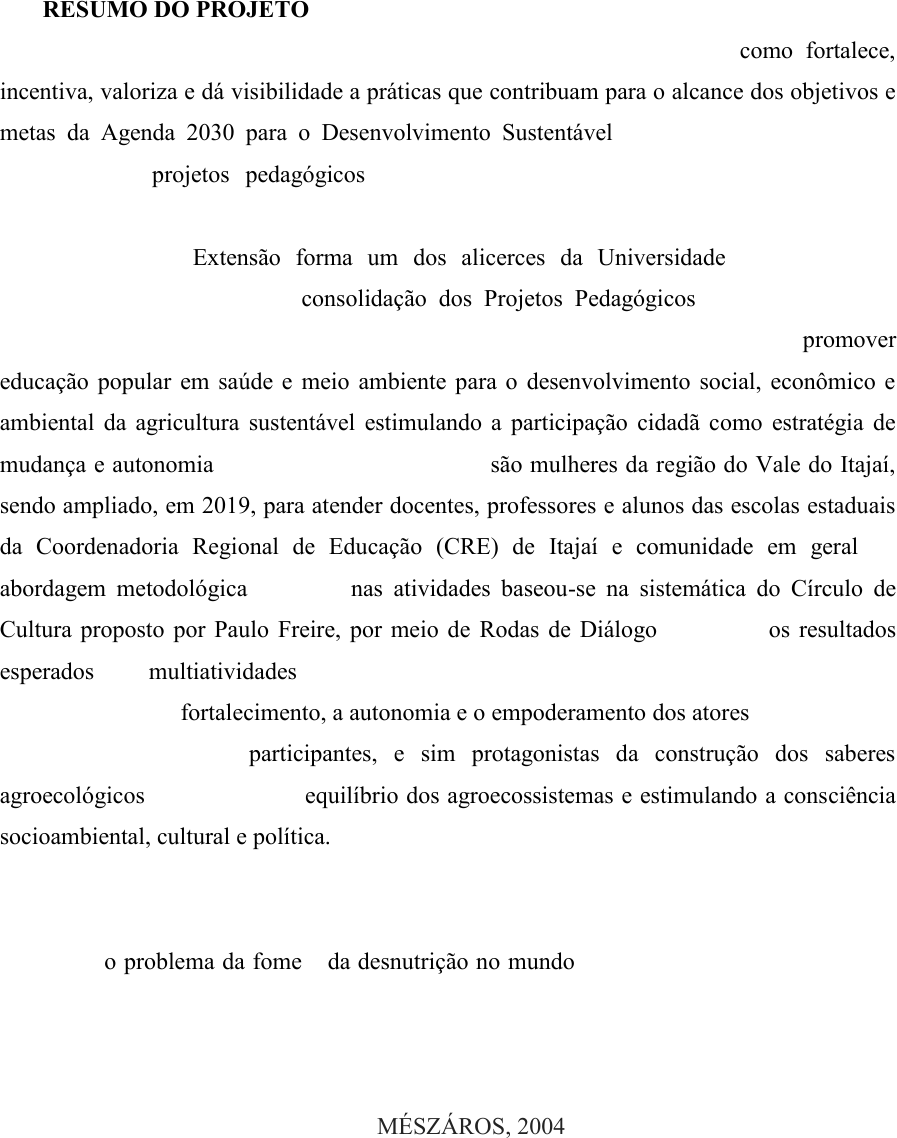 UNIVERSIDADE DO VALE DO ITAJAÍ VICE-REITORIA DE EXTENSÃO E ASSUNTOS COMUNITÁRIOS COORDENAÇÃO DE PROJETOS E PROGRAMAS DE EXTENSÃO 1. ESCOLA DO CONHECIMENTO (X) Escola do Mar, Ciência e Tecnologia 2. TÍTULO DO PROJETO DE TRABALHO: Educação para Transformação: Meio Ambiente e Saúde. 3. RESUMO DO PROJETO O projeto desenvolve o trabalho multicêntrico e interdisciplinar, assim como fortalece, incentiva, valoriza e dá visibilidade a práticas que contribuam para o alcance dos objetivos e metas da Agenda 2030 para o Desenvolvimento Sustentável. Desta maneira, permitindo consolidar os projetos pedagógicos, a partir do desenvolvimento de competências e habilidades constantes nas diretrizes curriculares para profissionais das diversas Escolas do Conhecimento. A Extensão forma um dos alicerces da Universidade e se torna um instrumento relevante para a consolidação dos Projetos Pedagógicos. Nesse contexto, o projeto de extensão “Educação para transformação: meio ambiente e saúde”, visa promover educação popular em saúde e meio ambiente para o desenvolvimento social, econômico e ambiental da agricultura sustentável estimulando a participação cidadã como estratégia de mudança e autonomia. O público-alvo do Projeto são mulheres da região do Vale do Itajaí, sendo ampliado, em 2019, para atender docentes, professores e alunos das escolas estaduais da Coordenadoria Regional de Educação (CRE) de Itajaí e comunidade em geral. A abordagem metodológica utilizada nas atividades baseou-se na sistemática do Círculo de Cultura proposto por Paulo Freire, por meio de Rodas de Diálogo. Portanto, os resultados esperados das multiatividades serão possíveis qualificar as variadas estratégias, as quais contribuem para o fortalecimento, a autonomia e o empoderamento dos atores, que se tornam mais do que somente participantes, e sim protagonistas da construção dos saberes agroecológicos, favorecendo o equilíbrio dos agroecossistemas e estimulando a consciência socioambiental, cultural e política. 4. JUSTIFICATIVA As promessas da “revolução verde” na agricultura deveriam ter resolvido de uma vez por todas o problema da fome e da desnutrição no mundo. Ao contrário, criou corporações- monstro, como a Monsanto, que estabeleceram de tal forma seu poder em todo o mundo, que será necessária uma grande ação popular voltada às raízes do problema para erradicá-lo. Contudo, a ideologia das soluções estritamente tecnológicas continua a ser propagandeada até hoje, apesar de todos os fracassos (MÉSZÁROS, 2004). x Realce x Realce x Realce x Realce x Realce x Realce x Realce x Realce x Realce x Realce x Realce x Realce x Realce x Realce x Realce x Realce x Realce x Realce O Brasil vem expandindo de forma exacerbada seu mercado de agroquímicos, sendo o maior consumidor do mundo desde 2008 (ABRASCO, 2015). Os agrotóxicos, que vêm sendo promovidos de forma agressiva, constituem uma preocupação global em relação aos direitos humanos, e seu uso pode trazer consequências seriamente prejudiciais, esses são responsáveis por aproximadamente 200 mil mortes por envenenamento agudo a cada ano, das quais 99% ocorrem em países em desenvolvimento (BÚRIGO, 2019). A exposição crônica tem sido associada ao câncer, às doenças de Alzheimer e Parkinson, a distúrbios hormonais, problemas de desenvolvimento, esterilidade, problemas neurológicos, como perda de memória, perda de coordenação, capacidade visual reduzida e habilidades motoras reduzidas (KOHLER; TRIEBSKORN, 2013). Práticas mais seguras existem e podem ser desenvolvidas ainda mais para minimizar os impactos do uso excessivo e, em alguns casos, desnecessário de agrotóxicos que violam uma série de direitos humanos. Estudos indicam que a agroecologia é capaz de produzir o suficiente para alimentar toda a população mundial e garantir que ela seja nutrida adequadamente. Essa promove práticas agrícolas adaptadas aos ambientes locais e estimula interações biológicas benéficas entre diferentes plantas e espécies para aumentar a fertilidade e a saúde do solo em longo prazo, garantir meios de subsistência para pequenos agricultores e aqueles que vivem na pobreza, incluindo as mulheres (BÚRIGO, 2019). É importante destacar que para o fortalecimento dessa proposta existem Leis e Projetos de Lei que são Nacionais, Estaduais e Municipais que visam promover a agroecologia e a produção de alimentos orgânicos, criando alternativas que visam a redução do uso de agrotóxicos e o incentivo à alimentação saudável, como: A Lei federal nº 10.831 que dispõe sobre a agricultura orgânica no Brasil, Política Nacional de Agroecologia de Produção Orgânica (PNAPO), Política Estadual de Agroecologia e Produção Orgânica (PEAPO), Política Municipal de Agroecologia e Produção Orgânica de Florianópolis. Esse projeto de extensão tem importante função de trazer reflexões e transformações nesse território e sensibilizar a população sobre os impactos toxicológicos gerados pelos agrotóxicos e fomentar o processo de transição agroecológica. Levando-se em consideração as questões apresentadas justifica-se a continuidade e o fortalecimento, uma vez que esse possibilitará a implementação de estratégias que permitam a consolidação institucional do projeto Educação para Transformação que vem sendo desenvolvido ao longo dos últimos anos e enquanto espaço acadêmico estratégico no desenvolvimento de pesquisas e atividades de ensino e extensão. x Realce x Realce x Realce x Realce x Realce x Realce x Realce x Realce x Realce x Realce x Realce x Realce x Realce x Realce x Realce x Realce x Realce x Realce x Realce x Realce x Realce x Realce Em relação aos Objetivos de Desenvolvimento Sustentável o Projeto busca contribuir com multiatividades, podem ser citados os seguintes objetivos: 2 - Fome Zero e Agricultura Sustentável, 3 - Saúde e Bem-estar, 4 - Educação de q