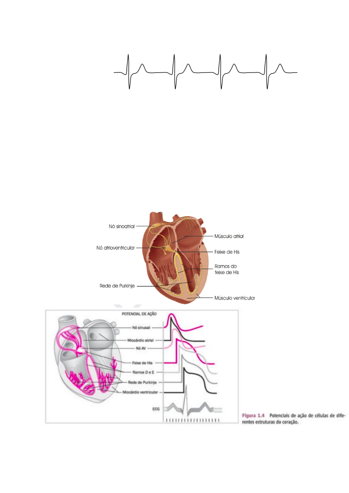 AD LA C OS TA Adla Larine Costa 1 eletrocardiogram� - registro em papel milimetrado da atividade elétrica do coração, ou seja, registra as variações de potencial elétrico do músculo cardíaco - ondas elétricas são a representação do fenômeno de despolarização e repolarização de células do cardíacas sistem� d� conduçã� - nó sinusal (junção da veia cava superior com o átrio direito) ⇛ feixes internodais (átrio esquerdo e nó atrioventricular) ⇛ nó atrioventricular (causa retardo na condução do impulso para coordenar a contração) ⇛ feixe de His (ramo direito é fino, frágil e descontínuo, passa pelo septo interventricular até o ventrículo direito | ramo esquerdo passa pelo septo interventricular e no septo aórtico se divide em: ântero superior, póstero inferior e póstero medial) AD LA C OS TA Adla Larine Costa 2 base� eletrofisiológica� - células especializadas em: ➢ contração: células musculares, papel de bomba ➢ marcapasso: automatismo, se despolarizam independente de estímulos de outras células, em condições de injúrias outras células podem realizar ➢ condução: são rápidas e eficazes - a corrente elétrica é mais rapidamente nos átrios nos tratos internodais e nos ventrículos no feixe de His e fibras de Purkinje - no nó atrioventricular as células retardam a velocidade de condução do impulso elétrico para que os átrios possam esvaziar completamente antes da contração ventricular DESPOLARIZAÇÃO E REPOLARIZAÇÃO - é ativação da célula quando recebe um estímulo elétrico - ao atingir a membrana celular, diminui a resistência elétrica e aumenta a permeabilidade ao Na - abrem canais rápidos Na (entra e lentos de Ca (sai) - ocorre inversão da carga elétrica da membrana celular - um eletrodo colocado à frente da célula registra uma onda positiva - repolarização é o inverso, a célula volta a ficar polarizada e vetor é registrado como onda negativa POTENCIAL DE AÇÃO - célula é estimulada, a polaridade elétrica da membrana inverte-se e o potencial varia - potencial é o gráfico da variação do potencial elétrico da membrana celular durante o ciclo cardíaco - fase 0: despolarização pela entrada rápida de Na AD LA C OS TA Adla Larine Costa 3 - fases 1, 2 e 3: repolarização onde ocorre entrada de Ca e saída de K - fase 4: repouso, a célula é polarizada, ou seja, está em equilíbrio elétrico, mas com concentração de íons invertida - restabelecimento do equilíbrio iônico é feito pela bomba de sódio e potássio (usa ATP) derivaçõe� - é a linha que une dois pontos registrados pelo eletrocardiógrafo (detecta as diferenças de potencial), e apresenta uma orientação espacial determinada. - bipolares: D1, D2 e D3, colocados no braço esquerdo (L), no braço direito (R) e na perna esquerda (F), constituindo teoricamente um triângulo equilátero - o triângulo de Einthoven - unipolares: conecta os 3 membros a uma central terminal, são eletrodos indiferentes ou de referência. aVR, aVL e aVF, são as unipolares aumentadas que detectam a diferença de potencial entre o eletrodo explorador e a central terminal - precordiais: plano horizontal, V1-V6 AD LA C OS TA Adla Larine Costa 4 SISTEMA HEXA AXIAL - consiste na superposição das derivações bipolares com as unipolares, é utilizado para determinar a orientação dos vetores no plano frontal - sendo que o vetor considerado normal é QIE entre 0 - 90 onda�, complex�, interval�� � segment�� ONDA P - despolarização atrial - pequena e arredondada - duração normal é em torno de 0.1 s (até 0,11 s) - orientação espacial varia de 0° a +90º no plano frontal, e plano horizontal, é mais ou menos paralela ao plano frontal, geralmente é bifásica em V1 COMPLEXO QRS - a despolarização ventricular - maior voltagem devido ao miocárdio ventricular mais espesso - dura 0,1s até 0,11 s - complexo polifásico (inicia no septo, paredes,as porções basais) - predomina QRS sempre para a esquerda (entre -30° e +90°) e para trás, direcionada para o VE - progressão normal das ondas R nas derivações precordiais, que aumenta progressivamente de V1 - V6 em relação a onda s - onda R é a primeira onda positiva,Q onda negativa que precede R, e onda S onda negativa que sucede R - nas derivações esquerdas como D1, D2, V5 e V6 registram-se comumente complexos do tipo qRs e em V1 a morfologia normal é rS - repolarização atrial também ocorre nessa fase (não é possível visualizar) ONDA T - repolarização ventricular AD LA C OS TA Adla Larine Costa 5 - onda de maior duração e menor voltagem, com porção ascendente mais lenta que a descendente - normalmente é positiva e paralela ao complexo QRS na maioria das derivações do ECG - V1 e V2, o QRS normal é negativo e a onda T normal pode ser também negativa ou positiva INTERVALO PR - tempo que o estímulo elétrico leva no nó sinusal aos ventrículos, decorre do atraso fisiológico da condução no nó AV - intervalo de tempo medido do início da onda P ao início do QRS - varia de 0,12 a 0.20 s - sofre influência do tônus simpático e do parassimpático, variando inversamente com a frequência cardíaca e apresentando uma nítida diminuição nas frequências elevadas - tende a aumentar com a idade ONDA U - onda arredondada e menor que ocorre raramente - representa potenciais tardios e pode ocorrer em corações normais - observar intervalos PR e QT INTERVALO QT - sístole ventricular, tempo total de despolarização e repolarização - início do QRS ao término da onda T - varia com a FC, utiliza-se também o QTc, que é o intervalo QT corrigido para a FC SEGMENTOS PR - entre o fim da onda P e o início do QRS SEGMENTO ST - entre o fim do QRS e o início da onda T - observar desnivelamento para cima (supradesnivelamento) ou para baixo (infradesnivelamento) - pode sugerir doença coronariana aguda, sobrecarga ventricular padronizaçã� - amplitude,