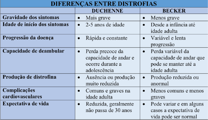 1.Quais as diferenças entre as Distrofias de Duchenne e Becker? Qual a etiologia? Qual paciente é mais acometido (qual patologia é mais severa?) Distrofia muscular de Duchenne: é uma condição fatal relacionada com o cromossomo X, o quadro inicia por volta dos 3-5 anos de idade, onde o paciente apresenta atraso na marcha independente e dificuldade para correr ou subir escadas. Além disso, com o acometimento da musculatura do quadril, há aumento da lordose e geralmente o paciente precisa escalar para levantar de uma posição sentada no chão (sinal de Gowers). Pode estar presente o sinal de Meryon, no qual a criança escorrega pelas mãos do examinador quando este levanta-a pelas axilar, isso traduz fraqueza da cintura escapular. Distrofia de Becker: também está relacionada com o cromossomo X, no entanto o seu curso é mais benigno. Inicialmente os sintomas se dão por volta dos 7 anos de idade e os pacientes conseguem ter uma sobrevida maior (30-40 anos). A deambulação é geralmente preservada até pelo menos os 15 anos, e muitos assim permanecem até a vida adulta. Sobre sua etiologia, ambas são alterações no gene DMD do cromossomo X. Na distrofia de Duchenne a anomalia no gene DMD (Xp21.2) causa ausência completa da distrofina no sarcolema. Já na distrofia de Becker, a deleção in-frame, mutação e duplicação do gene DMD (Xp21. 2) causa produção anormal ou deficiência na distrofina. Homens com mãe portadora do gene, tem cerca de 50% de chance de ter a doença. Já mulheres em mesma condição possuem 50% de chance apenas portadora do gene. Duchenne é a forma mais grave e severa, onde a sobrevida do paciente é curta. REFERÊNCIAS: JAMESON, J. L. et al. Medicina interna de Harrison. 20. ed. Porto Alegre: AMGH, 2020. 2 v. COHEN, Moisés. Tratado de Ortopedia. 1.ed. São Paulo: Roca, 2007.