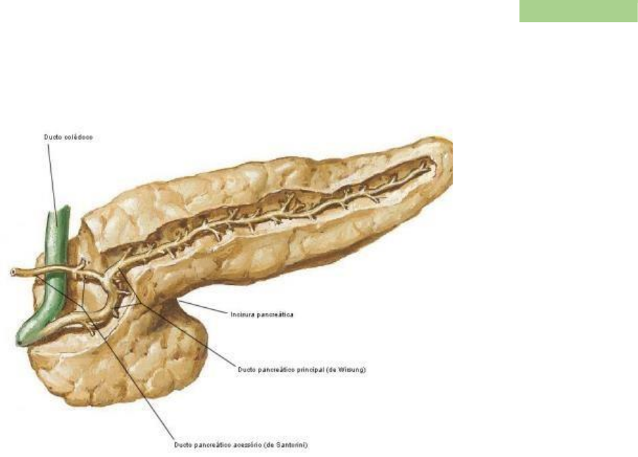 ISABELLA MEIRA BAYLÃO – MED 105 1 ANATOMIA DAS GLANDULAS ACESSORIAS DO SISTEMA DIGESTIVO PANCREAS - chama pâncreas pois do latim é pão doce, e pela sua densidade e formato assemelha-se. → É uma glândula acessória da digestão, alongada, retroperitoneal (exceto a cauda na parte do ligamento gastroesplenico que vai ao baço), situada sobrejacente e transversalmente aos corpos das vértebras L I e L II (o nível do plano transpilórico) na parede posterior do abdome. – por isso a dor do pâncreas é chamada de dor em barra, e por impacto a inersia das vertebras pode acometes as celulas pancreáticas podendo inclusive levar a diabetes. → Situa-se atrás do estômago, entre o duodeno à direita e o baço à esquerda. O mesocolo transverso está fixado à sua margem anterior. -pesa aproximadamente 100g, e tem 15cm x 4cm x 2cm → É divido em 4 partes: CABEÇA: parte expandida da glândula que é circundada pela curvatura em forma de C do duodeno à direita dos vasos mesentéricos superiores. Está firmemente fixada à face medial das partes descendente e horizontal do duodeno. O processo uncinado é uma projeção da parte inferior da cabeça do pâncreas, estende-se medialmente para a parte esquerda, posteriormente á artéria mesentérica superior. - A cabeça do pâncreas está apoiada posteriormente na veia cava inferior, artéria e verias renais direitas, e veia renal esquerda. COLO: é curto, está situado sobre os vasos mesentéricos superiores, que deixam um sulco em sua face posterior. A face anterior do colo, coberta por peritônio, está situada adjacente ao piloro do estomago. Geralmente 2 cm. Atras do colo do pâncreas há a formação da veia porta. ISABELLA MEIRA BAYLÃO – MED 105 2 CORPO: situa-se à esquerda dos vasos mesentéricos superiores, passando sobre a aorta e a vertebra L II, logo acima do plano transpilórico e posteriormente à bolsa omental. A artéria esplênica passa superiormente ao corpo do pâncreas. CAUDA: anteriormente ao rim esquerdo, onde está relacionado ao hilo esplênico e à flexura esquerda do colo. A cauda é relativamente móvel e passa entre as camadas do ligamento esplenorrenal junto com os vasos esplênicos. Ligado ao baço. → Ducto pancreático: começa na cauda do pâncreas e atravessa o parênquima da glândula até a cabeça do pâncreas: aí ele se volta inferiormente e se junta com o ducto colédoco, para formar a ampola hepatopancreática curta e dilatada, que se abre na parte descendente no duodeno, no cume da papila maior do duodeno. Possui muitas variações anatômicas. Ducto pancreático principal + ducto colédoco = ampola hepatopancreatica (de vater) que desemboca no duodeno (parte descendente, ampola maior) → Ducto pancreático acessório: abre-se no duodeno no cume da papila menor do duodeno e geralmente comunica com ducto pancreático principal. Em alguns casos, o ducto pancreático principal é menor do que o ducto pancreático acessório e pode não haver conexão entre os dois. Nesses casos, o ducto acessório conduz a maior parte do suco pancreático - O músculo esfíncter do ducto pancreático (ao redor da parte terminal do ducto pancreático), o músculo esfíncter do ducto colédoco e o músculo esfíncter da ampola hepatopancreática (de Oddi), O ducto pancreático principal vai desembocar na ampola de vater duodeno -variação anatômica que pode desembocar no ducto colédoco mas muitas das vezes nessa região já faz uma espécie de ampola ISABELLA MEIRA BAYLÃO – MED 105 3 são esfíncteres de músculo liso que controlam o fluxo de bile e de suco pancreático para a ampola e impedem o refluxo do conteúdo duodenal para a ampola hepatopancreática Irrigação: → A irrigação arterial provém dos ramos da artéria esplênica, várias artérias pancreáticas formam diversos arcos com ramos pancreáticos das artérias gastroduodenal e mesentérica superior. Ramos da Art Esplênica: vasculariza a calda e o corpo Art pancreático dorsal Art pancreático magna Ramos da Art Gastroduodenal: vasculariza a cabeça do pâncreas Vem do tronco celíaco, ramo da hepática comum Art pancreático duodenal superior anterior – vasculariza a parte anterior superior Art pancreático duodenal superior posterior – vasculariza a parte posterior superior A cirurgia de tumor de cabeça de pâncreas é difícil devido a sua relação anatômica com duodeno (tem desconectar a ampola de vater, o ducto colédoco, formar uma anastomose e depois unir tudo de novo) Ramos da Art Mesentérica Superior: vasculariza a cabeça do pâncreas Art pancreática-duodenal inferior anterior Art pancreático-duodenal inferior posterior ISABELLA MEIRA BAYLÃO – MED 105 4 → Artérias pancreaticoduodenais superiores, anterior e posterior, ramos da artéria gastroduodenal, e as art. Pancreaticoduodenais inferior e anterior e posterior, ramos da AMS, formam arcos anteriores e posteriores que irrigam a cabeça do pâncreas. → Drenagem venosa: feita por meio das veias pancreáticas correspondentes, tributárias das partes esplênica e mesentérica superior da veia porta: drenam para a veia esplênica. Inervação: Parassimpática: nervo vago x ISABELLA MEIRA BAYLÃO – MED 105 5 Simpática: nervos esplênicos maior e menor ISABELLA MEIRA BAYLÃO – MED 105 6 FIGADO: é a maior glândula do corpo e após a pele, maior órgão. Localizado no hipocôndrio direito. Faz relação anatômica com: diafragma (superiormente), parede abdominal (anteriormente), estomago e duodeno (inferiormente), vesícula posteriormente) • Tem duas fases: a face diafragmática convexa (anterior, superior, e algo posterior) e uma face visceral. ➢ O que separa a face diafragmática da face visceral, anteriormente, é a margem inferior. Posteriormente, é a área nua do fígado. • Possui 2 lobos: o lobo esquerdo (menor) e lobo direito (maior) ➢ O que separa o lobo direito do lobo esquerdo, na face diafragmática, é o ligamento falciforme (reflexão de 