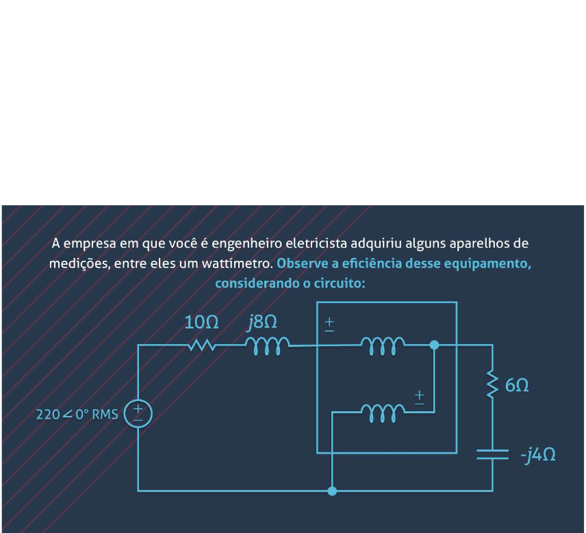 O wattímetro possibilita medir a potência elétrica fornecida ou dissipada por um elemento. Esse aparelho implementa o produto das grandezas, tensão e corrente elétrica no elemento, e é por esse motivo que a sua ligação ao circuito é realizada simultaneamente em série e em paralelo. Desta maneira, dois dos terminais são ligados em paralelo com o elemento, realizando a medição de tensão, e os dois restantes são interpostos no caminho da corrente. Assim, o wattímetro ideal mede a tensão sem desvio de qualquer fluxo de corrente, e também mede a corrente sem introduzir queda de tensão aos seus terminais. Considerando o circuito apresentando, determine a leitura realizada pelo wattímetro. O Wattímetro apresenta a leitura da potência média absorvida pela impedância 6 − 𝑗𝑗4 Ω , uma vez que a bobina de corrente está em série com a impedância, por outro lado, a bobina de corrente encontra-se em série com a impedância, e a bobina de tensão está em paralelo com ela. Assim a corrente através do circuito e a tensão na impedância é: Assim a corrente através do circuito e a tensão na impedância é: : 𝐼𝐼𝑅𝑅𝑅𝑅𝑅𝑅 = 220∠0° (10 + 𝑗𝑗8) + (6 − 𝑗𝑗4) = 200 16 + 4𝑗𝑗 𝐴𝐴 A tensão na impedância é dada por: 𝑉𝑉𝑅𝑅𝑅𝑅𝑅𝑅 = 𝐼𝐼𝑅𝑅𝑅𝑅𝑅𝑅(6 − 𝑗𝑗4) = 200(6 − 4𝑗𝑗) 10 + 𝑗𝑗8 𝑉𝑉 A potência complexa é dada por: 𝑺𝑺 = 𝑽𝑽𝑅𝑅𝑅𝑅𝑅𝑅𝑰𝑰𝑅𝑅𝑅𝑅𝑅𝑅∗ 𝑺𝑺 = 200(6 − 4𝑗𝑗) 10 + 𝑗𝑗8 × 200 10 − 𝑗𝑗8 𝑺𝑺 = 200²(6 − 𝑗𝑗4) 10² + 8² 𝑺𝑺 = 1463,4 − 𝑗𝑗975,6 Logo a leitura no wattímetro será de: 𝑃𝑃 = 𝑅𝑅𝑅𝑅(𝑺𝑺) = 1463,4 𝑾𝑾