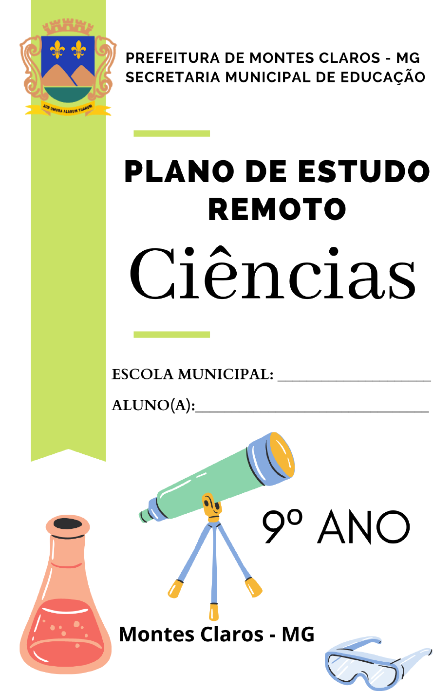 MAIO/2021 PREFEITURA MUNICIPAL DE MONTES CLAROS - MG SECRETARIA MUNICIPAL DE EDUCAÇÃO Rua Francisco Coutinho, 457. Bairro Augusta Mota – CEP: 39.403.219 2 Humberto Guimarães Souto Prefeito Guilherme Augusto Guimarães Oliveira Vice-Prefeito Rejane Veloso Rodrigues Secretária Municipal de Educação Elisângela Mesquita Silva Diretora Técnico-Pedagógica Sidnéia Sales Gerente Pedagógica Rômulo Ferreira da Silva Coordenador de Ensino Fundamental – Anos Finais Equipe Técnica: Claudia Soares da Silva Braga – Analista Curricular de Língua Portuguesa Cleiton Soares Oliveira – PEB II/Matemática Helen Patrícia Vieira Maia – Analista Curricular de Geografia Marcos Filipe Soares Oliveira – Analista Curricular de Educação Física Patrícia Lopes da Silva – PEB II/Matemática Rômulo Ferreira da Silva – Analista Curricular de História Sérgio Renato Oliveira – Analista Curricular de Ciências Tânia Cléia de Oliveira – PEB II/Matemática Valdiva Coimbra Oliveira – Analista Curricular de Ensino Religioso Vivian Orneles de Freitas – Analista Curricular de Arte Viviane Ramos Ribeiro – Analista Curricular de Língua Inglesa PREFEITURA MUNICIPAL DE MONTES CLAROS - MG SECRETARIA MUNICIPAL DE EDUCAÇÃO Rua Francisco Coutinho, 457. Bairro Augusta Mota – CEP: 39.403.219 3 Prezado responsável, Devido à permanência da COVID-19, as aulas presenciais no Sistema Municipal de Ensino continuam suspensas, por isso, o ensino remoto que foi realizado em 2020 terá continuidade em 2021. Diante desse cenário, a Secretaria Municipal de Educação elaborou o “Plano de Estudo Remoto” para que as práticas de estudo dos alunos sejam feitas de maneira gradual e o aprendizado seja efetivado. Esse plano contempla o componente curricular Ciências e está dividido em blocos com o conteúdo e a atividade a ser realizada pelo(a) aluno(a). Sendo assim, é necessário que você auxilie e incentive o(a) seu(sua) filho(a) no cumprimento de todas as atividades propostas. Contamos com a sua colaboração! Caro(a) estudante, Para auxiliar os seus estudos neste ano, preparamos o “Plano de Estudo Remoto” com atividades que deverão ser realizadas por você, na sua casa. Esse plano contempla todas as disciplinas referentes ao seu ano de escolaridade e está dividido em blocos com o conteúdo e a atividade a ser realizada por você. Além desse plano, você contará com as orientações do seu professor que poderão ser com vídeos, uso de sala classroom, whatsapp, livro didático, orientações em áudio etc. Contamos com a sua dedicação com os estudos! Equipe Anos Finais PREFEITURA MUNICIPAL DE MONTES CLAROS - MG SECRETARIA MUNICIPAL DE EDUCAÇÃO Rua Francisco Coutinho, 457. Bairro Augusta Mota – CEP: 39.403.219 4 As atividades presentes neste plano são conteúdos retirados dos livros Araribá Mais: Ciências – 9º ANO (Editora Moderna/Carnevalle, M. R) 2018 e Ciências Naturais - 9º ANO (Editora Moderna/Eduardo Leite do Canto & Laura Celloto Canto) 2018 e do site https://educacaobasica.editorasaraiva.com.br HABILIDADES EM FOCO NESTA UNIDADE: Planejar e executar experimentos que evidenciem que todas as cores de luz podem ser formadas pela composição das três cores primárias da luz e que a cor de um objeto está relacionada também à cor da luz que o ilumina. LINK PARA VIDEOAULA https://www.youtube.com/watch?v=7kgIbTY4HXM https://www.youtube.com/watch?v=EuCQ7YdqHjE PREFEITURA MUNICIPAL DE MONTES CLAROS - MG SECRETARIA MUNICIPAL DE EDUCAÇÃO Rua Francisco Coutinho, 457. Bairro Augusta Mota – CEP: 39.403.219 5 ÓPTICA CONCEITOS INTRODUTÓRIOS À ÓPTICA Raios de luz e fontes luminosas A luz e as manifestações associadas a ela — tais como as sombras, as cores dos objetos e as imagens produzidas pelos espelhos e pelas lentes — são estudadas por uma área da Física denominada Óptica. O Sol, a chama de uma vela e uma lâmpada acesa são exemplos de fontes luminosas, ou seja, são corpos que emitem luz. As fontes luminosas são vistas quando a luz emitida por elas atinge os olhos de alguém. Na figura ao lado estão representados os raios de luz emitidos por uma lâmpada acesa. Esses raios são emitidos em todas as direções, e é por isso que conseguimos ver uma mesma lâmpada acesa de qualquer lugar em que estejamos na sala. Os raios de luz se propagam em linha reta, fato que pode ser demonstrado por meio de um experimento como o ilustrado a seguir. RAIOS DE LUZ E CORPOS ILUMINADOS Na escuridão total não é possível enxergar objetos que não emitem luz, como um lápis, uma lâmpada apagada ou uma folha de papel. Só podemos vê-los se forem atingidos pelos raios de luz provenientes de uma fonte luminosa, ou seja, se eles estiverem iluminados. Quando os raios de luz de uma fonte luminosa atingem um objeto, iluminando-o, alguns desses raios podem ser refletidos. O objeto é enxergado porque esses raios refletidos chegam aos olhos de alguém, como ilustra o desenho ao lado. CORES PRIMÁRIAS DE LUZ Para se ter a sensação visual de branco, não é necessário que todas as cores do arco-íris atinjam nossos olhos. Se luzes de cores vermelha, azul e verde os atingirem simultaneamente, isso já será suficiente para causar a sensação visual de luz branca. Quando duas dessas três luzes coloridas — vermelha, azul e verde — atingem simultaneamente o olho humano, elas causam sensações visuais que, curiosamente, não são iguais àquelas provocadas pelas luzes em separado CORES PRIMÁRIAS DE LUZ E VISÃO A cor dos objetos Quando a luz branca do Sol atinge um objeto branco, todas as componentes coloridas são refletidas, chegam aos olhos da pessoa e, portanto, o objeto é visto como branco. Porém, se um objeto refletir apenas uma das cores ou apenas algumas das cores presentes na luz branca, ele será visto com a cor que reflete ou com a cor resultante da mistura das cores que reflete. Um objeto parecerá vermelho se refletir apenas a luz vermelha. Parecerá az