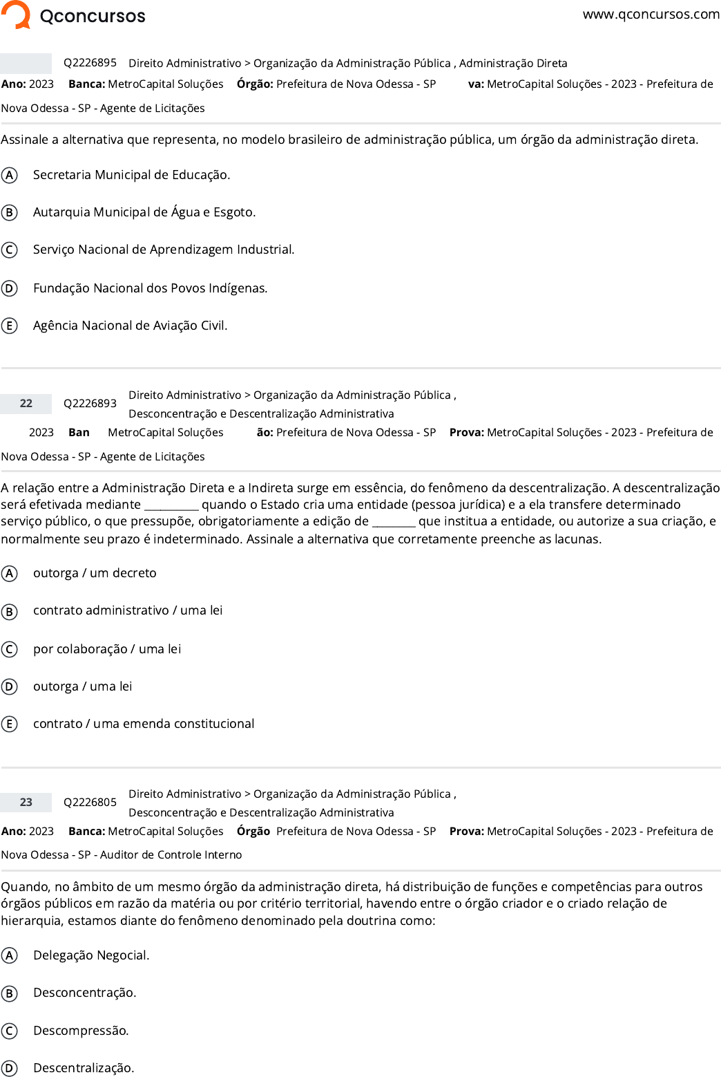 www.qconcursos.com Ano: 2023 Banca: MetroCapital Soluções Órgão: Prefeitura de Nova Odessa - SP Assinale a alternativa que representa, no modelo brasileiro de administração pública, um órgão da administração direta. A Secretaria Municipal de Educação. B Autarquia Municipal de Água e Esgoto. C Serviço Nacional de Aprendizagem Industrial. D Fundação Nacional dos Povos Indígenas. E Agência Nacional de Aviação Civil. Ano: 2023 Banca: MetroCapital Soluções Órgão: Prefeitura de Nova Odessa - SP A relação entre a Administração Direta e a Indireta surge em essência, do fenômeno da descentralização. A descentralização será efetivada mediante __________ quando o Estado cria uma entidade (pessoa jurídica) e a ela transfere determinado serviço público, o que pressupõe, obrigatoriamente a edição de ________ que institua a entidade, ou autorize a sua criação, e normalmente seu prazo é indeterminado. Assinale a alternativa que corretamente preenche as lacunas. A outorga / um decreto B contrato administrativo / uma lei C por colaboração / uma lei D outorga / uma lei E contrato / uma emenda constitucional Ano: 2023 Banca: MetroCapital Soluções Órgão: Prefeitura de Nova Odessa - SP Quando, no âmbito de um mesmo órgão da administração direta, há distribuição de funções e competências para outros órgãos públicos em razão da matéria ou por critério territorial, havendo entre o órgão criador e o criado relação de hierarquia, estamos diante do fenômeno denominado pela doutrina como: A Delegação Negocial. B Desconcentração. C Descompressão. D Descentralização. 21 Q2226895 >Direito Administrativo Organização da Administração Pública , Administração Direta Prova: MetroCapital Soluções - 2023 - Prefeitura de Nova Odessa - SP - Agente de Licitações 22 Q2226893 >Direito Administrativo Organização da Administração Pública , Desconcentração e Descentralização Administrativa Prova: MetroCapital Soluções - 2023 - Prefeitura de Nova Odessa - SP - Agente de Licitações 23 Q2226805 >Direito Administrativo Organização da Administração Pública , Desconcentração e Descentralização Administrativa Prova: MetroCapital Soluções - 2023 - Prefeitura de Nova Odessa - SP - Auditor de Controle Interno https://www.qconcursos.com/ https://www.qconcursos.com/questoes-de-concursos/bancas/metrocapital-solucoes https://www.qconcursos.com/questoes-de-concursos/institutos/prefeitura-de-nova-odessa-sp https://www.qconcursos.com/questoes-de-concursos/bancas/metrocapital-solucoes https://www.qconcursos.com/questoes-de-concursos/institutos/prefeitura-de-nova-odessa-sp https://www.qconcursos.com/questoes-de-concursos/bancas/metrocapital-solucoes https://www.qconcursos.com/questoes-de-concursos/institutos/prefeitura-de-nova-odessa-sp https://www.qconcursos.com/questoes-de-concursos/questoes/6031b155-2e https://www.qconcursos.com/questoes-de-concursos/disciplinas/direito-direito-administrativo https://www.qconcursos.com/questoes-de-concursos/disciplinas/direito-direito-administrativo/organizacao-da-administracao-publica https://www.qconcursos.com/questoes-de-concursos/disciplinas/direito-direito-administrativo/administracao-direta https://www.qconcursos.com/questoes-de-concursos/provas/metrocapital-solucoes-2023-prefeitura-de-nova-odessa-sp-agente-de-licitacoes https://www.qconcursos.com/questoes-de-concursos/questoes/602acf62-2e https://www.qconcursos.com/questoes-de-concursos/disciplinas/direito-direito-administrativo https://www.qconcursos.com/questoes-de-concursos/disciplinas/direito-direito-administrativo/organizacao-da-administracao-publica https://www.qconcursos.com/questoes-de-concursos/disciplinas/direito-direito-administrativo/desconcentracao-e-descentralizacao-administrativa https://www.qconcursos.com/questoes-de-concursos/provas/metrocapital-solucoes-2023-prefeitura-de-nova-odessa-sp-agente-de-licitacoes https://www.qconcursos.com/questoes-de-concursos/questoes/63f8f4a5-2e https://www.qconcursos.com/questoes-de-concursos/disciplinas/direito-direito-administrativo https://www.qconcursos.com/questoes-de-concursos/disciplinas/direito-direito-administrativo/organizacao-da-administracao-publica https://www.qconcursos.com/questoes-de-concursos/disciplinas/direito-direito-administrativo/desconcentracao-e-descentralizacao-administrativa https://www.qconcursos.com/questoes-de-concursos/provas/metrocapital-solucoes-2023-prefeitura-de-nova-odessa-sp-auditor-de-controle-interno E Desconstrução. Ano: 2023 Banca: FGV Órgão: Prefeitura de Niterói - RJ O Prefeito do Município Alfa solicitou que sua assessoria esclarecesse como poderia ser criada uma empresa pública municipal. A assessoria respondeu, corretamente, que A a ordem constitucional proíbe que os municípios criem entes dessa natureza. B deve ser criada por ato do Poder Executivo, independentemente de lei. C a lei deve autorizar a sua instituição. D deve ser criada por decisão judicial. E deve ser instituída por lei. Ano: 2023 Banca: FGV Órgão: Prefeitura de Niterói - RJ Leia o trecho a seguir. “O governo anunciou medidas para tentar dar vazão aos pedidos de benefícios previdenciários como aposentadoria, salário-maternidade e auxílio-doença, que estão represados à espera de análise do Instituto Nacional do Seguro Social (INSS). Parte delas engloba a contratação de pessoal para auxiliar na redução da �la de pedidos.” Globo.com, 30/01/2020. O INSS, uma autarquia vinculada ao Ministério da Economia, é responsável por arrecadar as contribuições para a manutenção do Regime Geral da Previdência. As autarquias são entidades que devem ser criadas por meio de A registro dos atos constitutivos. B contrato de gestão. C convênio. D resolução. E lei. Ano: 2023 Banca: FGV Órgão: Prefeitura de Niterói - RJ A Administração Indireta representa o conjunto de pessoas jurídicas, com autonomia administrativa e �nanceira, que recebe atribuições do 