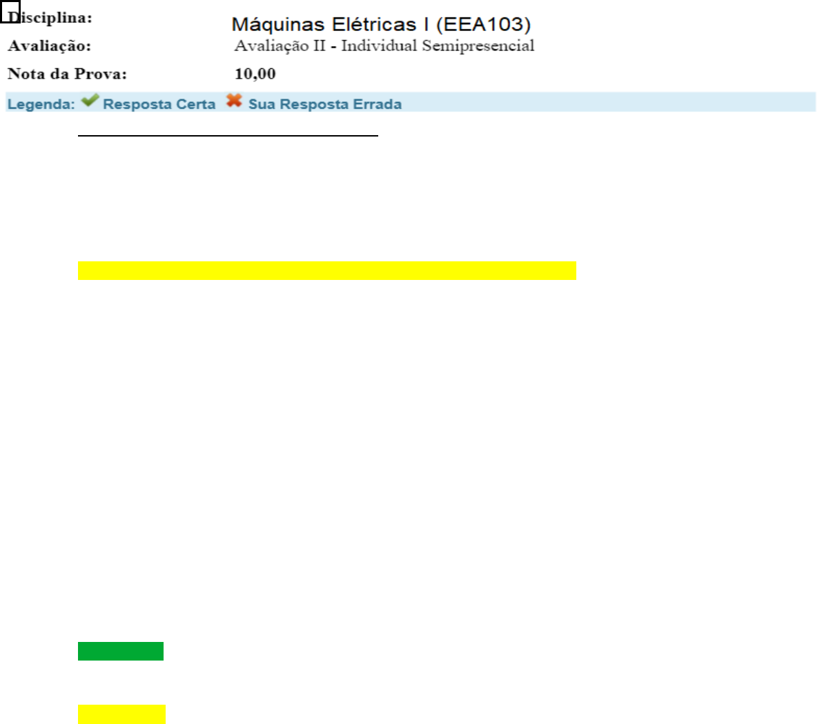 Avaliação Final (Objetiva) - Individual 1) 1-A relação de espiras do transformador é o número de espiras do enrolamento primário dividido pelo número de espiras da bobina secundária. A relação de espiras do transformador fornece a operação esperada do transformador e a tensão correspondente exigida no enrolamento secundário. Sobre a relação de espiras dos transformadores, assinale a alternativa CORRETA: A) O enrolamento de alta tensão de um transformador possui mais espiras. B) O enrolamento secundário de um transformador possui mais espiras. C) O enrolamento primário de um transformador possui mais espiras. D) O enrolamento de baixa tensão de um transformador possui mais espiras. 2-O número relativo de voltas do lado primário e secundário do transformador define se o nível de tensão aumenta ou diminui. Se houver mais voltas na bobina primária do que na bobina secundária, a tensão diminuirá; caso contrário, a tensão aumentará. Sobre a teoria dos transformadores, classifique V para as sentenças verdadeiras e F para as falsas: ( ) Um transformador converte tensão ou corrente CA para CC. ( ) Em um transformador a corrente permanece constante, pois a frequência é constante. ( ) O enrolamento de alta tensão de um transformador possui menor área transversal. Assinale a alternativa que apresenta a sequência CORRETA: A) F - F - V. B) F - V - F. C) V - F - V. D) V - V - F. 3 - O transformador é basicamente um dispositivo de controle de tensão que é amplamente utilizado na distribuição e transmissão de energia em corrente alternada. Em um transformador elevador, a tensão de saída é aumentada; e em um transformador abaixador, a tensão de saída é diminuída. O transformador elevador diminuirá a corrente de saída; enquanto o transformador abaixador aumentará a corrente de saída para manter a entrada e a potência de saída do sistema iguais. Sobre os princípios e funcionamento dos transformadores, classifique V para as sentenças verdadeiras e F para as falsas: ( ) A eficiência de um transformador é da ordem de 50%. ( ) Um transformador não pode aumentar ou diminuir a tensão de uma fonte CC, pois as leis de indução eletromagnética de Faraday não são válidas. ( ) O enrolamento de alta tensão tem mais área de seção transversal. Assinale a alternativa que apresenta a sequência CORRETA: A) F - V - V. B) V - F - F. C) F - V - F. D) V - F – V. 4- Um transformador ideal possui algumas características que incluem: os dois enrolamentos deste tipo de transformador, que possuem pequena resistência; e o fluxo total gerado nesse tipo de transformador, que se restringe ao núcleo e se conecta com os enrolamentos. Portanto, seu fluxo e vazamento de indutância é zero. Considere que 30 W de potência são aplicados ao primário de um transformador ideal com razão de espiras de 10.Com relação ao valor da potência fornecida à carga secundária, assinale a alternativa CORRETA: A) 30 W. B) 25 W. C) 300 W. D) 0,3 W.