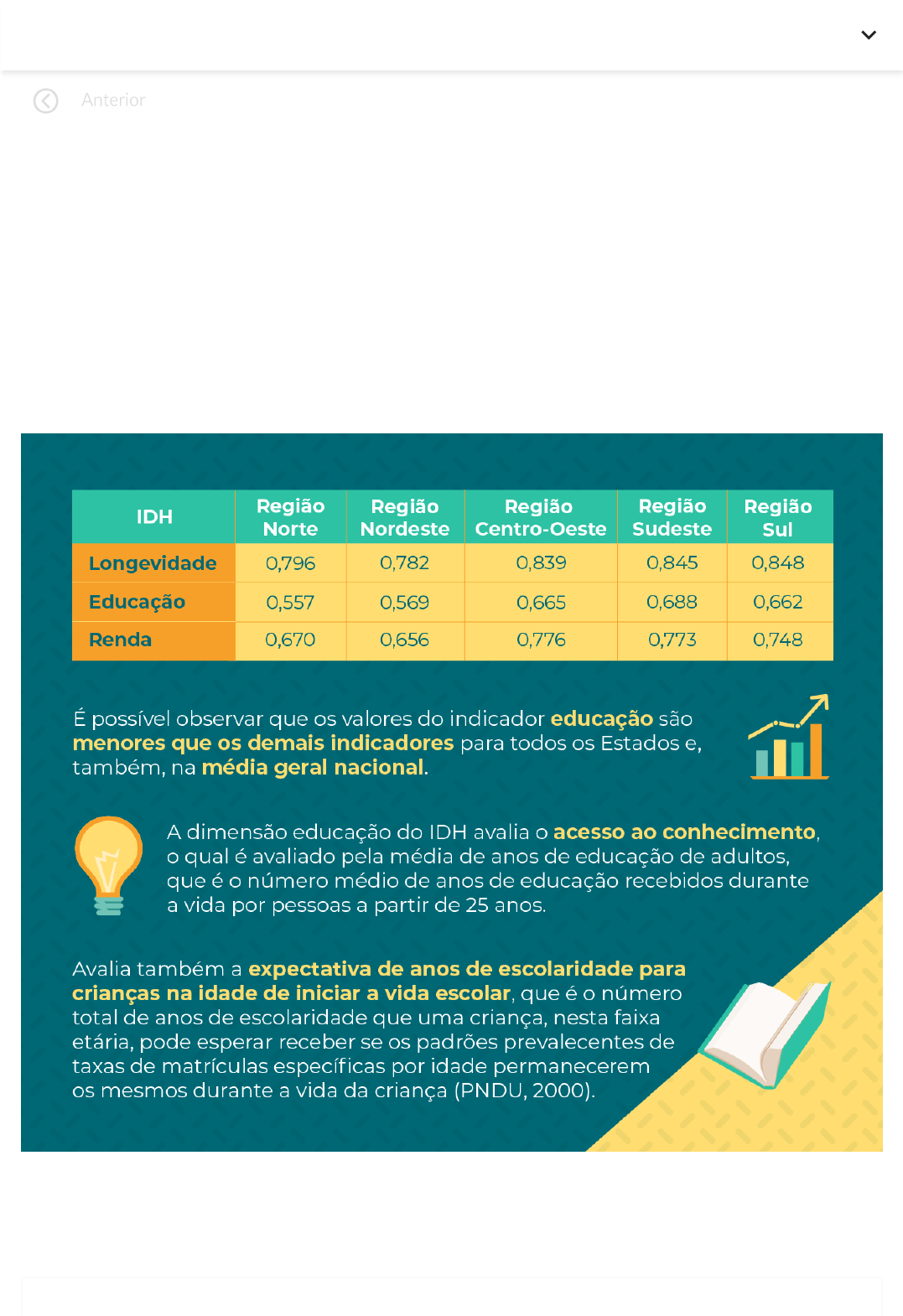 16/08/2023, 10:07 Dinâmica populacional brasileira :: Plataforma A https://metropolitanasp.grupoa.education/sagah/object/default/55207368 1/2 Desafio O Índice de Desenvolvimento Humano (IDH) é um indicador que analisa as dimensões da saúde, da educação e da renda, com o intuito de avaliar a qualidade de vida e o desenvolvimento humano de uma população. Muitas vezes, os índices não refletem, por exemplo, as especificidades e as desigualdades regionais, já que esses indicadores são ob�dos pela média dos municípios de cada estado e, posteriormente, são calculadas as médias das regiões brasileiras. Suponha que você é um gestor de polí�cas públicas e recebeu a seguinte tabela, apresentando os valores do IDH referentes à saúde, à educação e à renda de cada região do Brasil: Considerando essas informações, explique esses valores, considerando a história socioeconômica e o que é avaliado pelo IDH a uma en�dade internacional que lhe ques�onou sobre os possíveis mo�vos pelos quais o IDH da educação é o menor de todos os indicadores. Próximo RR 16/08/2023, 10:08 Dinâmica populacional brasileira :: Plataforma A https://metropolitanasp.grupoa.education/sagah/object/default/55207368 2/2 Sua resposta No Brasil as tenta�vas e buscar de se ampliar a educação é constantemente sabotada, as desigualdades pressionam para o abandono escolar e os inves�mentos são ínfimos frente a real necessidade e demanda. Enviado em: 16/08/2023 09:59 Padrão de resposta esperado Ao analisar os valores do IDH para a educação, percebe-se que eles apresentam os menores valores quando comparados às dimensões de renda e de saúde. Considerando os elementos que são avaliados pelo IDH no quesito educação, pode-se supor que os valores são mais baixos em decorrência da deficiência no sistema educacional brasileiro. No caso das pessoas acima de 25 anos, isso demonstra que boa parte da população que está na parcela economicamente a�va e apresenta baixo grau de conhecimento, o que promove baixa qualificação e, assim, menor geração de renda. No caso dos indivíduos que estão em idade de iniciar a vida escolar, apesar de a expecta�va de anos ser adequada, existem muitos problemas estruturais relacionadas tanto à oferta de ensino como à quan�dade de vagas, à localização geográfica dessas vagas e, ainda, às condições econômicas da população. A quan�dade de vagas nem sempre é suficiente em determinada localização, o que obriga as crianças e os jovens a se deslocarem, por transporte público escolar ou por recursos próprios. Nem todas as famílias têm recursos para arcar com o transporte, e as crianças acabam impedidas de ir à escola. No ensino superior, as vagas nas universidades públicas também não são suficientes para atender a todos, além da questão do próprio ensino deficitário na educação básica, que dificulta o ingresso dos estudantes mais pobres na universidade pública, reduzindo suas chances de ampliar o seu nível escolar. Próximo RR