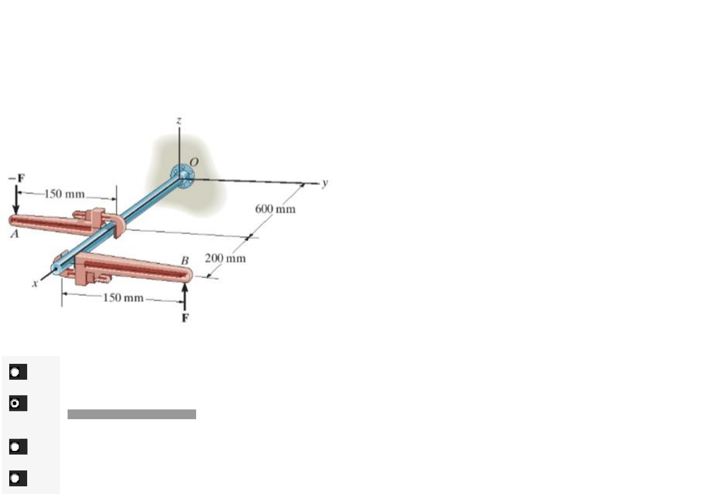 Se o momento de binário atuando nos tubos tem intensidade de 400Nm, determine a intensidade da força F vertical aplicada em cada