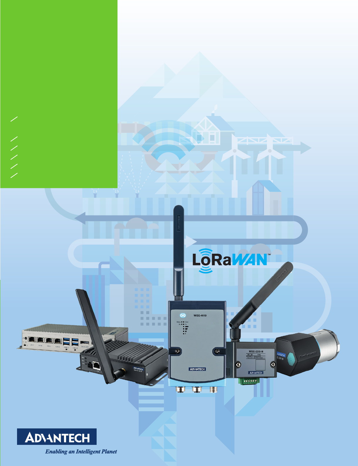www.advantech.com IIoT LoRaWAN Sensors, I/O Modules and Gateways Cloud Integration Architecture of LoRaWAN Factory Industrial IoT Smart Agriculture Oil & Gas Energy Management Selection Guide Advantech Industrial LoRaWAN Solution Cloud Integration Architecture of LoRaWAN WISE-2410 Vibration Sensor WISE-2410X Explosion Proof Vibration Sensor Advantech LoRaWAN solutions provide a device-to-cloud solution by simply sending collected data through the LoRa gateway to the cloud. With Edgelink inside the gateway, users simply plug-and-play without worrying about data parsing processes. LoRaWANAbout WISE-2410 WISE-2410X LoRaWAN 3rd Party GW WISE-2410 series is LoRaWAN wireless vibration sensor integrated with an ARM Cortex-M4 processor, LoRa transceiver, 3-axis accelerometer, and temperature sensor. Built-in 3-axis accelerometer and temperature sensor Total 8 vibration characteristic values on board Compliant with ISO 10816 IP66 with battery-powered, no wiring installation needed Easy setting with user friendly interfaces on WISE Studio Supports wide temperature -20 ~ 85oC IECEx Zone 2, Zone 21, ATEX2 certified Built-in 3-axis accelerometer and temperature sensor Total 8 vibration characteristic values on board Compliant with ISO 10816 IP65 with battery-powered, no wiring installation needed Easy setting with user friendly interfaces on WISE Studio Supports wide temperature 0 ~ 70oC Explosion Proof Vibration Sensor ESRP-ACT-UNO2484 Intelligent Platform with ThingPark Enterprise WISE-4610 WISE-2200-M ESRP-ACT-UNO2484 LoRaWAN 3rd Party GW LoRaWAN WISE-6610 Advantech LoRaWAN I/O modules not only support long-range wireless communication, but also have a long battery life due to the low power consumption of the LoRa network. WISE-4610 features a wireless sensor node targeting outdoor applications with LoRa network technologies. WISE-2200-M supports maximum 128 address and a 30 rule setting which can easily connect to modbus sensors and meters. Supports LoRaWAN wireless frequency with external detachable antenna Application-ready I/O communication with optional M12 connectors, IP65 Wide voltage power input with 10 ~ 50 VDC Better penetration through concrete and steel Less interference with high penetration capability Supports Modbus/RTU communication protocol Supports max. 128 address and 30 rule settings Compact design, suitable for plug and play applications Industrial design concept for different kinds of environments Supports 2000 LoRaWAN device connections Build a multi-gateway, geo-redundant, high-availability LoRaWAN® network with a user-friendly interface and real-time monitoring Extend cloud intelligence and analytics to edge devices, with end-to-end infrastructure security, trusted by major telecommunication operators Enjoy carrier-grade support and maintenance including 24/7 monitoring of smart IoT platforms Seamless inter-operability among smart things WISE-6610 LoRaWAN Gateway LoRaWAN protocol for private and public system applications Enhanced memory and build-in Node-Red for hosting custom software applications Ethernet and I/O connections for wide array of field assets Support Modbus/TCP and MQTT protocol WISE-4610 I/O Module WISE-2200-M I/O Module ESRP-ACT-UNO2484 Higher Penetration Lower Power Consumption No Wiring Needed Increased Productivity Enhances Factory Safety The purpose of IIoT is to deploy many types of sensors in a factory to collect vast quantities of information and send it to a control center for analysis and utility. Users can not only set the thresholds for the system but can also get in-time alerts to ensure safety and maximize productivity. Advantech WISE-4610 outdoor LoRa/LoRaWAN I/O node and WISE-2410 vibration sensors used in a factory offers strong signal penetration without tangled and complex wiring. Using vibration, humidity and temperature sensors to monitor warehouses and storage environments through a control center offers an efficient alternative to traditional one-by-one inspections. With WISE-2410 vibration sensor and other sensors paired with a WISE-4610 analog input I/O board, alerts can be triggered when pressure levels (water pressure, oil pressure, gas pressures etc.) are abnormal. This increases safety and improves production quality by controlling resources in the manu- facturing process. Control Factory Resources Automatic Alerts Advantech LoRaWAN solution used in smart agriculture connects WISE-2410 vibration sensor and other sensors with the WISE-4610 outdoor LoRa/LoRaWAN I/O node. Together they send data through a WISE-610 LoRaWAN gateway to the cloud. In this case, the application collects temperature, humidity, vibration and soil PH data to better understand the environmental situation. WISE-4610 is designed with an IP65 enclosure and M12 connectors to offer an optimal fit for outdoor applications. WISE-2410 is a LoRaWAN wireless vibration sensor integrated with ARM Cortex-M4 Processor, LoRa transceiver, 3-axis accelerome- ter and temperature sensor. The WISE-6610 is a high-performance LoRaWAN gateway with reliable connectivity options for industrial environments and LoRaWAN protocol support for building LoRaWAN private and public networks. Smart Agriculture Factory Industrial IoT Flexibility of deployment without worrying about signal coverage No monthly payment by using LoRa network Solar powered or solar rechargeable battery to make the device more independent Allows farmers to minimize resources such as water and fertilizers Upgraded data collection process helps with wireless monitoring and control Cost effective Plug-and-play applications Less interference with high penetration Network can be quickly deployed with fewer gateways No wiring required Save energy costs Advantech LoRaWAN solution enables smart campus energy management, which collects energy data and monitors power consumption in real time. The LoRaWAN technology not only provides long-range wireless communication, but also provides deep indoor coverage to easily cover 