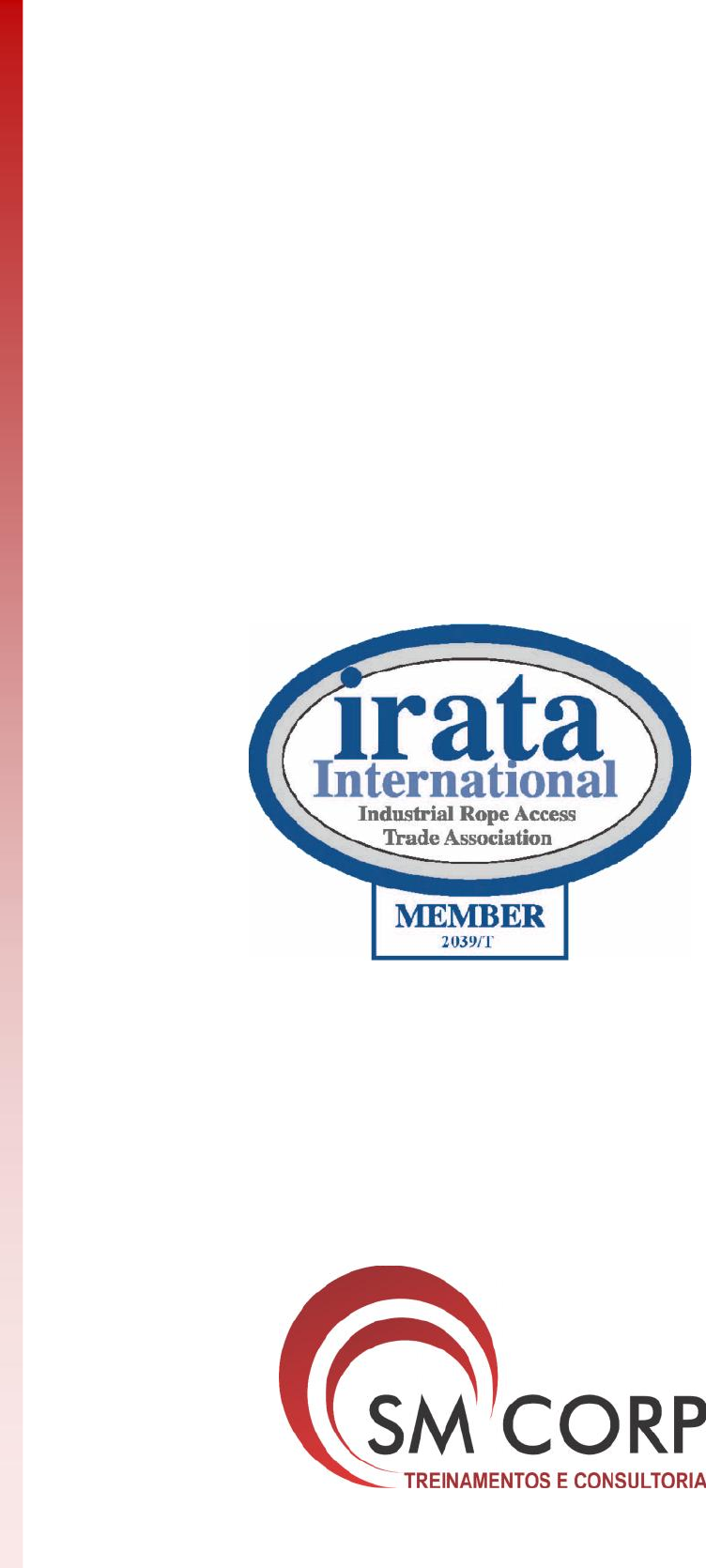 ACESSO POR CORDAS IRATA 2 O seu futuro mais seguro ÍNDICE TEORIA 1. Histórico de Acesso por Corda 2. Introdução 3. Princípios fundamentais de um sistema de acesso por corda 4. Pessoal e Treinamento (Plano de estudo e instruções) 4.1 Técnico de Nível 1 em acesso por corda da IRATA 4.2 Técnico de Nível 2 em acesso por corda da IRATA 4.3 Técnico de Nível 3 em acesso por corda da IRATA 5. Equipamentos, inspeção e manutenção 6. Análise específica de perigo e avaliação de risco 7. Zona livre de queda 8. Fatores de queda e energia de choque 9. Ancoragens e ângulo de carga 10. Trauma de suspensão 11. Sistema de redução / vantagem mecânica ou sistema de polias 12. Nós 13. Legislação de Normas Regulamentadoras 14. Conhecimentos básicos de primeiros socorros 15. Glossário de Termos Descrição da última revisão Data Revisão Versão Inicial 25/10/2016 Rev. 1 Elaborado por: Aprovado por: Marianna da Silva Bins Carlos Antônio Pinheiro da Cunha 3 O seu futuro mais seguro TEORIA 1. Histórico de Acesso por Corda 4 O seu futuro mais seguro 2. Introdução Este manual esboça as exigências gerais do treinamento de especialistas em métodos de acesso por cordas para trabalho realizado em locais altos e também de difícil acesso. Este manual aplica-se somente ao treinamento de técnicas de acesso por cordas para o trabalho na área industrial; ele se refere, mas não abrange as tarefas que ocorrem no local de trabalho. Encontra-se nele também um resumo dos critérios para treinar pessoal envolvido em métodos de acesso por corda. A segurança, a aplicação e a eficácia dos métodos industriais de acesso dependem da capacidade do pessoal responsável que os executará. A descrição das técnicas neste manual não é a única forma de executar trabalho com cordas com segurança, e o presente manual envida esforços para não ser prescritivo com relação ao seu conteúdo. Sempre que ocorrerem descrições, também existem as formas alternativas que podem ser empregadas se os Técnicos aderirem aos princípios gerais delineados. Instrutores/Treinadores – As técnicas descritas serão ensinadas por uma combinação de demonstração, explicação da teoria e das aplicações práticas. A participação do aluno é exigida em todas as áreas do plano de estudos. Treinandos – Os candidatos devem buscar orientação de seu instrutor/treinador a respeito de quais seções deste manual eles precisam ler e compreender, de acordo com o nível de treinamento pertinente. O seu instrutor explicará qualquer parte do manual que não esteja totalmente clara. Este manual é projetado para uso em conjunto com as diretrizes da IRATA ICOP – (International Code of Practice) Código de Pratica Internacional no uso de métodos de acesso por corda para propósitos industriais e a TACS da IRATA (Training, Assessment and Certification Scheme) Esquema de Certificação, Avaliação e Treinamento para certificação de pessoal engajado em métodos de acesso por corda industrial. Sobre a IRATA A associação foi fundada em 1988 (há vinte e oito anos), após uma iniciativa de grandes empresas de acesso por cordas com total apoio da HSE e hoje é reconhecida como autoridade mundial em acesso por corda para fins industriais. Inicialmente registrada como Industrial Rope Access Trade Association (Irata), com um relativo aumento do seu quadro de membros em todos os continentes conduziu a mudança do nome IRATA Internacional. No Brasil, atendendo exigências das normas nacionais foi criada a IRATA Brasil para atuar em território nacional auxiliando e direcionando as empresas associadas e associados, na aplicabilidade e regularização das normas e procedimentos de certificação no mercado de acesso por corda. A IRATA Brasil é acreditada segundo os requisitos estabelecidos na ABNT NBR ISO/IEC 17024, estando em conformidade com as normas pertinentes à atuação no acesso por corda. O objetivo da IRATA é: Garantir que qualquer trabalho de acesso por cordas feito pelos seus membros seja executado de uma maneira segura e eficiente. 5 O seu futuro mais seguro A missão da IRATA é: • Alcançar um índice de erros e acidentes zero em Segurança e Qualidade do Trabalho. • Fornecer representantes da Associação aptos para emitir opiniões e recomendações baseadas em seu conhecimento a entidades externas. • Preparar submissão aos departamentos do governo tratando de assuntos como saúde, segurança e treinamento; por exemplo, Departamento de Comércio e Indústria, Departamento Executivo de Energia, Saúde e Segurança. • Auxiliar as partes funcionais encarregadas de comentar e discutir as diretivas legislativas existentes e sob a forma de minutas. • Indicar áreas de pesquisa e desenvolvimento onde forem necessárias iniciativas para solucionar problemas com os quais a indústria se depara. • Auxiliar no fornecimento de treinamento educacional apropriado e oportunidades de certificação para emprego de pessoal no Acesso Industrial por Cordas. • Fornecer um fórum para a troca livre e informal de experiências e opiniões. • Fornecer orientação sobre treinamento e certificação de pessoal envolvido em Acesso Industrial por Cordas e orientação sobre boas práticas de trabalho. Os membros devem respeitar o Código de Ética e estão sujeitos a uma auditoria rígida por inspetores independentes, qualificados para garantir que todas as exigências da Associação quanto à garantia de Qualidade, Segurança, Treinamento e Práticas de Trabalho estejam sendo observados. 3. Princípios Fundamentais de um Sistema de Acesso por Cordas Acesso por Cordas: Técnica que usa cordas, normalmente incorporando dois sistemas separadamente seguros, um como um meio de acesso e o outro como reserva (back up) de segurança, usada com um cinto em combinação com outros dispositivos, para chegar e sair do local de trabalho e para se posicionar no trabalho. Posicionamento no Trabalho: Técnica que 
