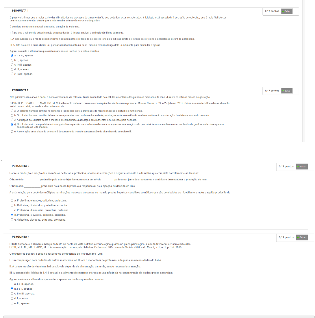 As4 AS5 Fazer teste: AS – Unidade V P E R G U N T A 1 1. Muitas vezes, a percepção da mãe de que tem pouco leite para amamentar seu filho é o reflexo da insegurança quanto à sua capacidade de nutrir plenamente o seu bebê. Essa insegurança, com frequência reforçada por pessoas próximas, faz com que o choro do bebê e as mamadas frequentes (que fazem parte do comportamento normal em bebês pequenos) sejam interpretados como sinais de fome (GIUGLIANI, 2004). Considerando o fragmento acima apresentado, analise as seguintes asserções quanto à veracidade das proposições: A suplementação com outros leites pela percepção de “ter pouco leite” facilita o processo de interrupção da amamentação. PORQUE A suplementação com outros leites normalmente alivia a tensão materna e essa tranquilidade é repassada ao bebê, que passa a chorar menos, vindo a reforçar a ideia de que a criança estava passando fome. Sobre essas duas asserções, é CORRETO afirmar que: a. as duas proposições são verdadeiras e a segunda justifica a primeira. b. a primeira proposição é falsa e a segunda proposição é verdadeira. c. as duas proposições são verdadeiras, mas a segunda não justifica a primeira. d. a primeira proposição é verdadeira e a segunda proposição é falsa. e. as duas proposições são falsas. 0,17 pontos P E R G U N T A 2 1. (QUESTÃO ANULADA, PARA PONTUAR VOCÊ DEVE ASSINALAR UMA DAS ALTERNATIVAS ABAIXO): A necessidade energética do lactente é proporcionalmente muito mais alta do que a de um adulto, em decorrência da alta taxa metabólica de repouso pelo requerimento para o crescimento e desenvolvimento (VÍTOLO, 2015). Em relação à paciente Luiza 3 meses, 60cm e 4950g, calcule o Gasto Energético Total (GET) com uso das equações abaixo (IOM, 2005): Idade Sexo Equação (kcal/dia) 0 a 3 meses Masculino (89 x P) - 100 + 175 Feminino 4 a 6 meses Masculino (89 x P) - 100 + 56 Feminino 7 a 12 meses Masculino (89 x P) - 100 + 22 Assinale a alternativa que contém a quantidade de energia diária necessária para essa paciente: a. 396kcal b. 715kcal c. 515kcal d. 362kcal e. 415kcal 0,17 pontos P E R G U N T A 3 1. A Sociedade Brasileira de Pediatria (2018) recomenda que, diante da impossibilidade do aleitamento materno, as crianças menores de seis meses de vida sejam alimentadas com fórmulas infantis para lactentes (fórmulas de partida) e as de seis a doze meses com formulas de seguimento para lactentes. Na impossibilidade de o aleitamento ser realizado com fórmulas, recomenda-se a diluição do leite fluido. Considere os trechos a seguir a respeito das recomendações para o aleitamento artificial: I. Apesar de proporcionar o conteúdo nutricional necessário, as fórmulas não são estéreis e é extremamente imporante o cuidado para a esterilização da água e dos utensílios envolvidos. II. Em relação à quantidade de leite (fórmulas ou leite de vaca diluído), a criança entre 2 e 3 meses deve mamar entre 60 a 120mL, divididos em 6 a 8 alimentações. III. Para crianças em aleitamento com leite de vaca fluido, é recomendado até completar quatro meses de idade que o leite diluído seja acrescido de óleo, (1 colher de chá de óleo para cada 100 ml). Agora assinale a alternativa que contém apenas as os trechos que estão corretos: a. I e II, apenas. b. II e III, apenas. c. I, apenas. d. I e III, apenas. e. III, apenas. 0,17 pontos P E R G U N T A 4 1. Alguns problemas enfrentados pelas mães durante o aleitamento materno precisam ser precocemente identificados e tratados, para que não se tornem causas de interrupção da amamentação (BRASIL, 2015). Leia atentamente as informações contidas nas colunas “A” e “B” sobre as complicações da lactação para, em seguida, assinalar a alternativa que reúne as correspondências CORRETAS entre as informações nessas contidas. Coluna A A. Mastite B. Abcesso mamário C. Candidíase D. Mamilos doloridos/trauma mamilar Coluna B 1. A infecção pode ser superficial ou atingir os ductos lactíferos, e costuma ocorrer na presença de mamilos úmidos e com lesão. 2. É um processo inflamatório que pode ocorrer pela complicação do ingurgitamento mamário, rachaduras no mamilo ou obstrução de ductos incorretamente tratados. 3. As causas mais comuns são pega ou posicionamento inadequado do bebê, mamilos curtos, planos ou invertidos, disfunções orais na criança, uso impróprio de bombas de extração de leite, e exposição prolongada a forros úmidos. 4. Normalmente, é causado por mastite não tratada. Exige intervenção imediata por drenagem cirúrgica, seguida de antibioticoterapia e o esvaziamento regular da mama afetada. A sequência CORRETA dessa associação é: a. A-1; B-4; C-2; D-3 b. A-4; B-3; C-2; D-1 c. A-3; B-2; C-1; D-4 d. A-2; B-1; C-4; D-3 e. A-2; B-4; C-1; D-3