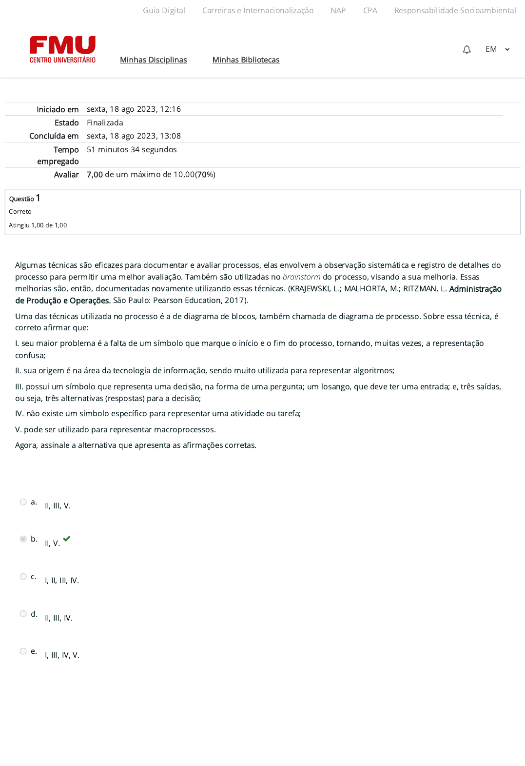 18/08/2023 13:09 Atividade 3 (A3): Revisão da tentativa https://ambienteacademico.com.br/mod/quiz/review.php?attempt=2749786&cmid=1071806 1/7 Iniciado em sexta, 18 ago 2023, 12:16 Estado Finalizada Concluída em sexta, 18 ago 2023, 13:08 Tempo empregado 51 minutos 34 segundos Avaliar 7,00 de um máximo de 10,00(70%) Questão 1 Correto Atingiu 1,00 de 1,00 Algumas técnicas são e�cazes para documentar e avaliar processos, elas envolvem a observação sistemática e registro de detalhes do processo para permitir uma melhor avaliação. Também são utilizadas no brainstorm do processo, visando a sua melhoria. Essas melhorias são, então, documentadas novamente utilizando essas técnicas. (KRAJEWSKI, L.; MALHORTA, M.; RITZMAN, L. Administração de Produção e Operações. São Paulo: Pearson Education, 2017). Uma das técnicas utilizada no processo é a de diagrama de blocos, também chamada de diagrama de processo. Sobre essa técnica, é correto a�rmar que: I. seu maior problema é a falta de um símbolo que marque o início e o �m do processo, tornando, muitas vezes, a representação confusa; II. sua origem é na área da tecnologia de informação, sendo muito utilizada para representar algoritmos; III. possui um símbolo que representa uma decisão, na forma de uma pergunta; um losango, que deve ter uma entrada; e, três saídas, ou seja, três alternativas (respostas) para a decisão; IV. não existe um símbolo especí�co para representar uma atividade ou tarefa; V. pode ser utilizado para representar macroprocessos. Agora, assinale a alternativa que apresenta as a�rmações corretas. a. II, III, V. b. II, V. c. I, II, III, IV. d. II, III, IV. e. I, III, IV, V. Guia Digital Carreiras e Internacionalização NAP CPA Responsabilidade Socioambiental Minhas Disciplinas Minhas Bibliotecas EM https://codely-fmu-content.s3.amazonaws.com/Moodle/GuiaDigital/Guia+digital/index.html https://carreiras.fmu.br/ https://codely-fmu-content.s3.amazonaws.com/Moodle/NAP/inicial/nap/fmu/index.html https://codely-fmu-content.s3.amazonaws.com/Moodle/CPA/landing_CPA/index.html https://portal.fmu.br/sustentabilidade https://ambienteacademico.com.br/ https://ambienteacademico.com.br/ https://ambienteacademico.com.br/course/view.php?id=236 18/08/2023 13:09 Atividade 3 (A3): Revisão da tentativa https://ambienteacademico.com.br/mod/quiz/review.php?attempt=2749786&cmid=1071806 2/7 Questão 2 Correto Atingiu 1,00 de 1,00 “Processo é um conjunto �nito, sequencial e ordenado de passos que devem ser executados para transformar um insumo (uma entrada) em algo útil (uma saída), válido, que atenda a especi�cações prede�nidas (parâmetros, dimensões, prazos etc).” (WILDAUER, E. Mapeamento de processos: conceitos, técnicas e ferramentas. Curitiba: Intersaberes, 2015, p. 21) No trecho acima há uma de�nição de processo. Considerando essa de�nição, e os seus conhecimentos sobre processos e mapeamento de processo, marque a alternativa correta. “Processo é um conjunto �nito, sequencial e ordenado de passos que devem ser executados para transformar um insumo (uma entrada) em algo útil (uma saída), válido, que atenda a especi�cações prede�nidas (parâmetros, dimensões, prazos etc).” (WILDAUER, E. Mapeamento de processos: conceitos, técnicas e ferramentas. Curitiba: Intersaberes, 2015, p. 21) No trecho acima há uma de�nição de processo. Considerando essa de�nição, e os seus conhecimentos sobre processos e mapeamento de processo, marque a alternativa correta. a. Em uma reunião, quando há muita discussão sobre um mapa de processo, passa-se a chamá-lo de “processo crítico”. b. Subprocesso é a menor unidade de análise de um processo, e representa o passo a passo de uma atividade. c. O mapa de processos é utilizado para saber o caminho seguro para andar em uma planta industrial. d. Mapas de processo não podem ser aplicados para processos de serviços. e. O mapa de processos é uma representação abstrata que busca descrever, da melhor forma possível, o processo real. Guia Digital Carreiras e Internacionalização NAP CPA Responsabilidade Socioambiental Minhas Disciplinas Minhas Bibliotecas EM https://codely-fmu-content.s3.amazonaws.com/Moodle/GuiaDigital/Guia+digital/index.html https://carreiras.fmu.br/ https://codely-fmu-content.s3.amazonaws.com/Moodle/NAP/inicial/nap/fmu/index.html https://codely-fmu-content.s3.amazonaws.com/Moodle/CPA/landing_CPA/index.html https://portal.fmu.br/sustentabilidade https://ambienteacademico.com.br/ https://ambienteacademico.com.br/ https://ambienteacademico.com.br/course/view.php?id=236 18/08/2023 13:09 Atividade 3 (A3): Revisão da tentativa https://ambienteacademico.com.br/mod/quiz/review.php?attempt=2749786&cmid=1071806 3/7 Questão 3 Correto Atingiu 1,00 de 1,00 “Conta-se que Frank Gilbreth (fundador do estudo do método) participou de uma conferência cientí�ca com um artigo intitulado “A melhor maneira de vestir-se de manhã”. Em sua apresentação, ele deixou a audiência cientí�ca perplexa ao analisar a “melhor” maneira de abotoar o colete de manhã. Entre suas conclusões, o colete devia ser abotoado de baixo para cima (para tornar mais fácil arrumar a gravata no mesmo movimento; abotoar de cima para baixo requer que as mãos sejam novamente levantadas)”. Frank Gilbreth, contemporâneo de Taylor, é um dos expoentes da Administração Cientí�ca, seu trabalho, juntamente com o trabalho de sua mulher, ainda é referência no estudo dos métodos e dos movimentos. Ele foi um dos primeiros a utilizar símbolos para o estudo dos movimentos. (SLACK, N.; BRANDON-JONES, A.; JOHNSTON, R. Administração da produção. São Paulo: Atlas, 2018, p. 215). Considerando a importância dos símbolos, e do que você aprendeu sobre o uso dos símbolos em um �uxograma, relacione os símbolos com a descrição correspondente. Fonte: Elaborado pelo autor, 2019. ( ) Operação. ( ) Espera. ( ) Armazenagem