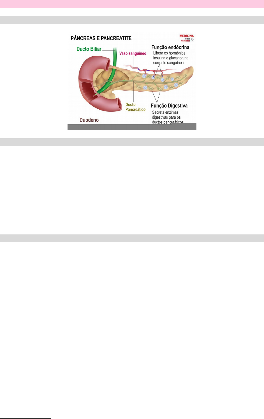PANCREATITE AGUDA Anatomia Definição - Consiste em um processo inflamatório agudo do pâncreas que pode envolver os tecidos peripancreáticos e/ou órgãos à distância, podendo variar de formas leves a graves - A sua fisiopatologia engloba a formação de edema intersticial, infiltração de células inflamatórias e diversos graus de apoptose celular, hemorragias e necrose - Um dos distúrbio abdominal mais comuns, responsável por internações - Amplo espectro de gravidade clínica, variando desde um distúrbio leve, autolimitado e transitório até um processo catastrófico e fulminante - Mortalidade geral de 10% - No Brasil a incidência é de 15,9:100.00 h/a Etiopatogenia e Fisiopatologia - A fisiopatologia baseia-se na autodigestão enzimática do parênquima pancreático, causado pelo extravasamento ou ativação excessiva das enzimas - O extravasamento está relacionado à obstrução dos ductos pancreáticos, principalmente por cálculos biliares na papila de Vater, que promovem acúmulo de secreção e consequente aumento da pressão intraductal - Comprometimento do fluxo sanguíneo e isquemia capaz de lesar células do parênquima - Com a destruição de células acinares ocorre extravasamento de enzimas, as quais provocam lesões parenquimatosas e iniciam o processo inflamatório - Agressão às células acinares também pode iniciar a pancreatite. Tal agressão é causada sobretudo pelo álcool, mas também por agentes infecciosos, medicamentos, traumatismos e isquemia. · Álcool - 30% das pancreatites agudas - Afeta principalmente homens jovens, com historia de consumo alcoolico abusivo - Etanol e seus metabolitos tem ação lesiva direta sobre as células acinares - Essa lesão celular libera citocinas e induz a inflamação. Alem disso, o álcool estimula a secreção pancreática e promove a contração do esfíncter de Oddi, que aumenta a pressão intraductal - O álcool e seus metabolitos podem ativar a tripsina dentro de células acinares - Com a tripsina ativada, ocorrerá autodigestão do parênquima, ativação de outras pró-enzimas, como elastase e fosfolipase, que resulta em lesão vascular, hemorragia e esteatonecrose · Cálculos Biliares - 40% das pancreatites agudas - O mecanismo provável envolve aumento da pressão no ducto pancreático causado pela obstrução da ampola secundária a um calculo ou edema causado pela passagem de um cálculo - A hipertensão ductal resulta na ativação anormal das enzimas digestivas das células acinares - Os efeitos tóxicos do próprio acido biliar nas células acinares também pode ser um mecanismo · Outras causas - Hiperlipidemia - Traumatismo - Drogas - Infecções virais - Vasculite insuficiência vascular Tipos de Pancreatite - A pancreatite intersticial caracteriza-se pelo aumento do pâncreas no exame de imagem. O borramento peripancreático pode ser visto e constitui sinal de inflamação. A maioria dos pacientes apresenta este tipo de pancreatite, geralmente é autolimitada. - Pancreatite necrosante pela existência de necrose pancreática e/ou peripancreática. É mais bem visualizada nos cortes transversais de exames de imagem com contraste. Ocorre em 5 a 10% das pancreatites agudas e está associada a um curso prolongado e mais grave da doença Gravidade da Pancreatite · Pancreatite Aguda LEVE - Inflamação se limita ao pâncreas e regiões adjacentes. - Não apresentam falência de órgãos ou complicações sistêmicas ou locais - Taxa mortalidade <5% · Pancreatite Aguda MODERADAMENTE GRAVE - Complicações locais ou sistêmicas, mas não apresentam insuficiência do órgão ou apenas insuficiência transitória (resolução em 48 horas) · Pancreatite Aguda GRAVE - Há falha persistente de um ou múltiplos órgãos (>48 horas). - A maioria dos pacientes tem uma ou mais complicações locais - Taxa mortalidade > 30% Determinação da gravidade: Critérios de Ranson Juntamente com uma abordagem diagnostica completa, mostra-se como um método eficaz e aplicável a fim de avaliar a evolução do quadro clinico e prognostico do paciente para formas mais graves dessa patologia - Idade: Quanto mais avançada, mais se torna suscetível as complicações graves - Glóbulos brancos (GB): se houver leucocitose, pode indicar infecção concomitante à inflamação - Desidrogenase láctica (LDH): se elevada, indica dano tecidual, porem de forma inespecífica - Aspartato aminotransferase (AST): se elevada indica lesão orgânica, principalmente hepática - Glicemia: se elevada pode indicar um processo inicial de insuficiência pancreática - Queda do hematócrito: após 48 h, pois irá avaliar o valor real, já que na admissão pode estar mascarado - Aumento de BUN (ureia nitrogenada no sangue): indica um processo de dano renal - Cálcio sérico: se diminuído, indica intenso processo de necrose gordurosa no pâncreas - pO2 arterial: se diminuída, indica um estado de hipoxemia - Déficit de base: indicativo de um processo de acidose - Perda de fluidos: perda de liquido para o 3º espaço pelo aumento da permeabilidade capilar - 0-2 critérios: 2% - 3 a 4 critérios: 15% - 5 a 6 critérios: 40% - > 7 critérios: >90% Sinais e Sintomas - Classica dor persistente de cólica no andar superior do abdome, suficientemente forte para que precise de analgesia com opioides por via parenteral - Irradia pelas costas em 50% - Dor geralmente se desenvolve subitamente na pancreatite por cálculo biliar e na pancreatite alcoolica se desenvolve ao longo de alguns dias. - Pode ser reduzida em posição sentada ou de prece maometana, mas tosse, movimentos súbitos e respiração profunda podem acentua-la - Nauseas e vômitos são comuns - Sudorese - FC 100-140 bpm - FR rápida e curta - PA pode alternar entre alta e baixa, com hipotensão postural significativa - Tax pode ser normal ou subnormal no inicio, mas pode chegar em 37,7º a 38,3º em poucas horas - Sensório rebaixado podendo evoluir para semicoma - Icterícia vista 