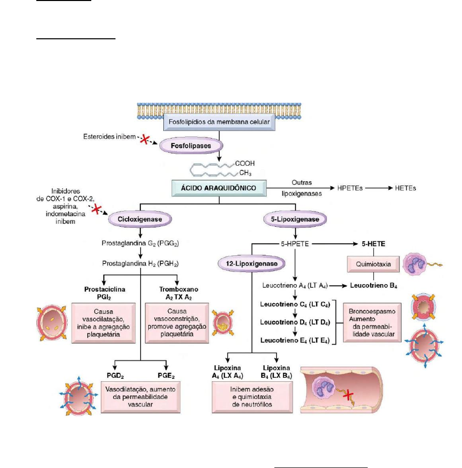 Clínica Médica Larissa Stephanie Ferreira TXXX A N T I – I N F L A M A T Ó R I O S Podem ser divididos em 2 grupos: Esteroidais (Glicocorticoides) – todos eles possuem estrutura semelhante ao cortisol. - Do ponto de vista fisiológico, o glicocorticoide endógeno é o cortisol. Não Esteroidais (não hormonais) – existem vários subgrupos e, por isso, suas estruturas são diferentes um dos outros. Mecanismo de ação dos AINES (Anti-inflamatórios não esteroidais): inibição da COX (ciclo-oxigenase) O ácido araquidônico está presente na membrana celular, em condições normais ficam ligados aos fosfolipídios. Enquanto ele está ligado aos fosfolipídios, não acontece nada com ele. Na presença de uma lesão, é ativada a enzima FOSFOLIPASE A2, que quebra a ligação do ácido araquidônico com os fosfolipídios. Para haver formação dos derivados do ácido araquidônico, é necessário desligar o ácido araquidônico dos fosfolipídios de membrana, feito pela fosfolipase A2. Uma vez que o ácido araquidônico está “livre”, desligado dos fosfolipídios, pode sofrer ação de 2 enzimas: Cicloxigenase Lipoxigenase OBS: Na realidade, são 4 vias. São citadas apenas 2 pois são as que interessa do ponto de vista farmacológico. Mas, o ácido araquidônico pode sofrer ação, inclusive, do citocromo P450. A mesma substância pode dar origem a vários mediadores diferentes. O que determina qual mediador vai ser formado é a célula. Por exemplo, nas plaquetas a primeira enzima Clínica Médica Larissa Stephanie Ferreira TXXX é a cicloxigenase. Em alguns leucócitos, são é só a cicloxigenase, tem-se a lipoxigenase. Então, dependendo da célula, a síntese é direcionada para um ou mais mediadores. Quando olha-se para a via da cicloxigenase, o mesmo ácido araquidônico sofre ação da mesma cicloxigenase produz 3 mediadores inflamatórios diferentes. É porque, quando se descreve o metabolismo do ácido araquidônico, se descreve de uma maneira resumida. Quando o ácido araquidônico sofre ação da cicloxigênase, ele produz uma prostaglandina intermediária (prostaglandina H2); a partir daqui, existem enzimas na células que direcionam a produção de um metabólito ou de outro. Por exemplo, nas plaquetas, além da cicloxigenase, tem-se a TROMBOXANO SINTETASE, que pega a prostaglandina intermediária e converte em TROMBOXANO. Em neutrófilos, tem-se a PROSTAGLANDINA SINTETASE, que converte a prostaglandina intermediaria em PROSTAGLANDINA E. Nas células do endotélio vascular, tem-se a PROSTACICLINA SINTETASE, que converte a prostaglandina intermediária em PROSTACICLINA. Então, a sínteses desses mediadores e a determinação de qual mediador vai se majoritário numa célula depende da enzima (ou das enzimas) que estarão presentes. Os derivados do ácido araquidônico também são chamados EICOSANÓIDES ou PROSTANÓIDES. Os eicosanoides são importante pois produzem uma série de efeitos fisiológicos quanto patológicos. Os eicosanoides, na vigência de um processo inflamatório, começam a aumentar e causar todas as características da inflamação (rubor, edema, dor, calor, prurido, etc). PRINCIPAIS EFEITOS DOS DERIVADOS DO ÁCIDO ARAQUIDÔNICO OBS: os efeitos escritos em vermelho são os efeitos predominantes Sistema vascular: Vasocontricção: tromboxano Vasodilação: prostaciclina (além de vasodilatador, é anti agregante plaquetário) Aumento da permeabilidade vascular: prostaciclina e prostaglandina OBS: o sangue não foi feito para coagular em condições normais. O endotélio do vaso produz substancia que inibem a coagulação e a agregação plaquetária para manter o fluxo laminar do sangue. No processo inflamatório, com aumento de prostaglandinas e prostaciclinas, a vasodilatação e aumento da permeabilidade (principalmente das vênulas pós capilares) produz edema e hiperemia. - aumento do fluxo sanguíneo aumentando a pressão hidrostática associada à retração das células endoteliais provocada pelo aumento da permeabilidade vascular Sistema respiratório: Constricção: leucotrieno O broncoespasmo é muito associado com a histamina, pois a asma, na maioria das vezes, é de causa alérgica. Entretanto, a broncocontricção provocada pelos leucotrienos é mais persistente do que a constricção causada pela histamina. Sistema digestório: Contração da musculatura lisa: prostaglandinas (provocam dor do tipo cólica) Diminuição da secreção de ácido pelas células parietais – prostaglandina E Aumento da secreção de muco Prostaglandina tem efeito gastroprotetor Clínica Médica Larissa Stephanie Ferreira TXXX Uso crônico de AINES: pode aumentar o risco em 20x de formação de ulceras, pois com a inibição da COX, não há formação de prostaglandina. Sistema Renal: Vasodilatação: prostaglandina e prostaciclinas Aumento da liberação de renina: prostaglandina e prostaciclinas O efeito da angiotensina II nos rins: vasoconstricção da arteríola EFERENTE. Na realidade, a ang II contrai a arteríola aferente e eferente, entretanto, a arteríola aferente não sofre muitos efeitos constritores da ang II devido a presença de mediadores vasodilatadores que atenuam o efeito da ang II. As prostaglandinas nos rins tem papel fundamental na manutenção do tônus adequado da arteríola aferente para não prejudicar filtração renal. Além disso, elas estimulam a produção de RENINA. O aumento da liberação de renina estimula a filtração glomerular, justamente porque leva ao aumento da produção de angiotensina II, que contrai a arteríola EFERENTE, aumentando a pressão hidrostática no capilar glomerular, induzindo maior filtração. Associado a isso, tem-se vasodilatação da eferente. As prostaglandinas são importante para manter o ritmo adequado de filtração glomerular, boa perfusão glomerular e, com isso, taxa de filtração adequada. Quimiotaxia - Leucotrienos Olho Diminuição da pressão intraocular: prostaglandina Tem ef