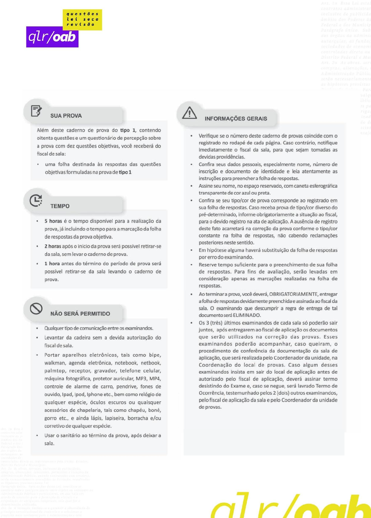 Método QLR OAB Elaborado por Ana Clara Fernandes @viciodeumaestudante Material de uso individual. Proibido o repasse! SIMULADO 05: INÉDITO 02 - - mailto:oabcronogramas@gmail.com Método QLR OAB Elaborado por Ana Clara Fernandes @viciodeumaestudante Material de uso individual. Proibido o repasse! QUESTÃO 01. Renata e Geovanna são amigas que se conheceram na graduação e, recentemente, foram aprovadas no Exame da Ordem, tornando-se, então, advogadas. Por trabalharem com muita diligência na defesa dos direitos da população, ambas são cotadas para a Câmara dos Vereadores do Município Nocaute. Após obterem êxito nas eleições, ambas tomam posse e Renata candidata-se à eleição da mesa, tornando-se presidente da referida Câmara dos Vereadores. Encerrados os citados processos eleitorais, elas questionaram-se sobre a possibilidade de continuarem exercendo a advocacia, sendo informadas que: A) Ambas poderão exercer a profissão de advogadas, não lhes sendo imputado qualquer impedimento. B) Somente Geovanna poderá continuar exercendo os atos privativos de advogado, desde que não atue a favor ou contra a Fazenda Pública que a remunere. C) Somente Geovanna poderá continuar exercendo os atos privativos de advogado, sem qualquer impedimento. D) Ambas poderão exercer a profissão de advogadas, sendo impedidas apenas de atuar a favor ou contra a Fazenda Pública que as remunere. QUESTÃO 02. Sobre o Processo Disciplinar de competência da OAB, é incorreto afirmar que: a) O processo disciplinar tramita em sigilo, até o seu término, só tendo acesso às suas informações as partes, seus defensores e a autoridade judiciária competente. b) Se o representado não for encontrado ou for revel, o Presidente do Conselho ou da Subseção não poderá designar-lhe defensor dativo. c) É permitida a revisão do processo disciplinar por erro de julgamento ou por condenação baseada em falsa prova. d) A jurisdição disciplinar não exclui a comum e, quando o fato constituir crime ou contravenção, deve ser comunicado às autoridades competentes. QUESTÃO 03. Salsicha é um estudante de direito muito interessado na carreira advocatícia, de modo que estuda bastante para conseguir se tornar um advogado renomado na região. Ocorre que, em um de seus estudos, ele verificou que os advogados possuem direito a honorários com as seguintes características: I- são recebidos após o advogado 'vencer' uma ação; II- são fixados pelo juiz; III- são pagos pela parte sucumbente (vencida); IV- inerentes ao advogado. Como são chamados os honorários com os elementos abordados? A) Honorários convencionados. B) Honorários com cláusula quota litis. C) Honorários sucumbenciais. D) Honorários por arbitramento judicial. QUESTÃO 04. Paulo Victor é um jovem advogado que decidiu abrir o próprio escritório de advocacia. Para divulgar seu trabalho, ele efetivou as seguintes condutas: I- publicou anúncio contendo os seus títulos acadêmicos a fim de demonstrar seu vasto conhecimento; e II- confeccionou um cartão de visitas com informações sobre o escritório e uma foto sua, para facilitar sua identificação. Sobre tais condutas, Paulo Victor: A) Agiu de forma regular em ambos os casos, de acordo com os ditames do Código de Ética e Disciplina da OAB. B) Errou ao publicar um anúncio fazendo menção aos seus títulos acadêmicos, visto que tal ação é proibida na publicidade do advogado. C) Errou em ambas as ações, dado que as normas relacionadas à publicidade vedam tanto a divulgação dos títulos acadêmicos quanto a inserção da fotografia do advogado no cartão de visitas. D) Ao divulgar seus títulos acadêmicos, não incorreu em infração ao Código de Ética e Disciplina, mas, ao inserir sua foto no cartão, desobedeceu a uma das vedações do Código. - - mailto:oabcronogramas@gmail.com Método QLR OAB Elaborado por Ana Clara Fernandes @viciodeumaestudante Material de uso individual. Proibido o repasse! QUESTÃO 05. O jovem advogado Harry Potter possui domicílio profissional no estado de Pernambuco, estando submetido ao conselho seccional deste. Ocorre que, por sua habilidade quase mágica no exercício da profissão, Harry é convidado para trabalhar em um grande escritório de São Paulo. Visto que precisará mudar, definitivamente, seu domicílio profissional para o estado de São Paulo, o que o advogado Harry deve fazer? A) Requerer sua inscrição por transferência. B) Requerer sua inscrição adicional. C) Continuar atuando sem a necessidade de notificar qualquer Conselho Seccional. D) Requerer sua inscrição suplementar. QUESTÃO 06. Sobre o TAC (Termo de Ajustamento de Conduta) celebrado pelo Conselho Federal e Conselhos Seccionais, assinale a alternativa que não corresponde ao disposto no Provimento nº 200\2020 (que regula o procedimento): A) É aplicado às hipóteses relativas às publicidades profissionais e às infrações disciplinares puníveis com censura. B) Pode ser realizado de ofício ou a requerimento. C) É possível a celebração do TAC por advogado ou estagiário já beneficiado com o instituto nos 03 (três) anos anteriores à conduta que será apurada. D) O advogado ou o estagiário interessado obrigar-se- á a cessar a conduta objeto do TAC, reparar o dano eventualmente causado, fazer cessar os efeitos da infração, quando for o caso, bem como a abster-se de praticar a mesma conduta no prazo fixado no instrumento correspondente. QUESTÃO 07. André e Gabriel são advogados associados, atuando com êxito na área empresarial e tributária. Ocorre que, em determinada situação, um dos clientes da sociedade proferiu, de forma injusta, palavras ofensivas contra Gabriel. André, indignado com o ocorrido, decidiu, juntamente com Gabriel, encerrar o vínculo com o cliente em razão da conduta reprovável. Para tanto, eles deverão: A) Renunciar ao mandato de forma imediata, sem necessidade de obediência a qualquer outro prazo. B) Se retirar da ca
