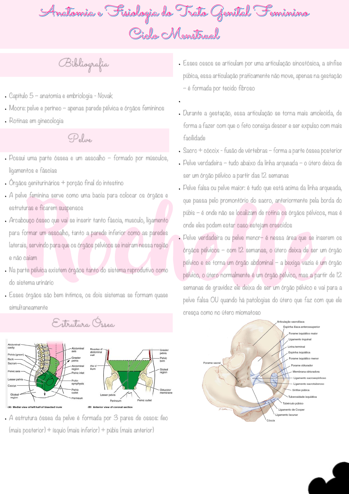 Professor Tadeu • Capítulo 5 – anatomia e embriologia - Novak • Moore: pelve e períneo – apenas parede pélvica e órgãos femininos • Rotinas em ginecologia • Possui uma parte óssea e um assoalho – formado por músculos, ligamentos e fáscias • Órgãos geniturinários + porção final do intestino • A pelve feminina serve como uma bacia para colocar os órgãos e estruturas e ficarem suspensos • Arcabouço ósseo que vai se inserir tanto fáscia, musculo, ligamento para formar um assoalho, tanto a parede inferior como as paredes laterais, servindo para que os órgãos pélvicos se insiram nessa região e não caiam • Na parte pélvica existem órgãos tanto do sistema reprodutivo como do sistema urinário • Esses órgãos são bem íntimos, os dois sistemas se formam quase simultaneamente • A estrutura óssea da pelve é formada por 3 pares de ossos: íleo (mais posterior) + ísquio (mais inferior) + púbis (mais anterior) • Esses ossos se articulam por uma articulação sinostósica, a sínfise púbica, essa articulação praticamente não move, apenas na gestação – é formada por tecido fibroso • • Durante a gestação, essa articulação se torna mais amolecida, de forma a fazer com que o feto consiga descer e ser expulso com mais facilidade • Sacro + cóccix - fusão de vértebras – forma a parte óssea posterior • Pelve verdadeira – tudo abaixo da linha arqueada – o útero deixa de ser um órgão pélvico a partir das 12 semanas • Pelve falsa ou pelve maior: é tudo que está acima da linha arqueada, que passa pelo promontório do sacro, anteriormente pela borda do púbis – é onde não se localizam de rotina os órgãos pélvicos, mas é onde eles podem estar caso estejam crescidos • Pelve verdadeira ou pelve menor– é nessa área que se inserem os órgãos pélvicos – com 12 semanas, o útero deixa de ser um órgão pélvico e se torna um órgão abdominal – a bexiga vazia é um órgão pélvico, o útero normalmente é um órgão pélvico, mas a partir de 12 semanas de gravidez ele deixa de ser um órgão pélvico e vai para a pelve falsa OU quando há patologias do útero que faz com que ele cresça como no útero miomatoso Bibliografia Estrutura Óssea Pelve Professor Tadeu Correção clínica – sling transobturatório – cirurgia de incontinência urinaria – passa-se uma faixa que trabalha como um ligamento que sustenta a uretra feminina que é muito curta, passa essa essa faixa por dentro do forame obturatório – essa passagem dessa faixa é as cegas – corta a vulva da paciente abaixo da uretra e passa a faixa de dentro para fora • Existem 4 tipos principais de pelve • Determina o tipo de pelve principal a partir das linhas que passam anteroposterior e latero-lateral 1. Androide: formato de coração 2. Antropoide: mais ovalado 3. Ginecoide: mais largo 4. Platipelóide: mais achatada • Normalmente, as mulheres desenvolvem durante o crescimento ósseo a pelve ginecoide, isso faz com que as mulheres, diferente dos homens, um quadril mais largo e comprido • Quadril masculino: mais estreito e mais achatado • Através da pelvimetria, conseguimos calcular as linhas anteroposterior e latero-lateral – se realizava esse exame quando não existia a US, biometria fetal • Linhas ou conjugatas que vamos definir através do tamanho delas, a facilidade ou não da insinuação ou descida em relação a pelve • Divide a pelve em 3 estreitos: superior (insinuação do bebê), médio da pelve (bebê passa pelas espinhas isquiáticas) e o estreito inferior da pelve (bebê passa pelo sacro-cóccix) • A primeira conjugata é do estreito superior, em que temos a conjugata obstétrica e a conjugata diagonal – a conjugata obstétrica (ou vera) passa da borda posterior do púbis e vai até o promontório sacral • A conjugata diagonal vai da borda inferior do púbis até o promontório sacral • A conjugata diagonal = conjugata obstétrica + 1,5 • Geralmente, a conjugata obstétrica, para ter um bom êxito de parto, ela tem que ser maior que 10 cm por que se ela for menor que isso, possivelmente ela tem uma pelve estreita e não vai facilitar a insinuação • No estreito médio, temos o espaço ou a distância interespinhal – essa distância interespinhal geralmente se dar por volta de 10 cm • Diâmetro biparietal: no final a gestação é por volta de 9 a 10 cm – esse diâmetro é feito na ultrassonografia • Esse diâmetro biparietal quando maior que 10 cm dificulta a insinuação fetal • Quando eu tenho pelves mais estreitas, coa. Conjugata obstétrica menor que 10 cm ou espaço/distância interespinhal das espinhas Correlação Clínica com a Obstetrícia bstetricia Professor Tadeu isquiáticas menor que 10 cm vai existir alguma complicação, pode existir alguma distorcia, algum comprometimento ou complicação no trabalho de parto • Parede lateral: formado pelo músculo piriforme (mais associado ao glúteo), obturador interno (perto do forame obturatório) e ileopsoas (parte posteriormente da coluna e desce como músculo psoas) • Assoalho pélvico: principal – músculo levantador do ânus + coccígeo (diafragma pélvico) • Diafragma urogenital: parte anterior - transverso perineal, bulbo esponjoso, isqueocavernoso, esfíncter da uretra e o retal à LEVANTADOR DO ÂNUS • Na parte pélvica, é um dos principais músculos, atua tanto na sustentação como na fisiologia dos órgãos pélvicos principalmente na parte intestinal • Serve como parte do sistema de continência fecal • Auxiliar na contenção dos órgãos pélvicos juntamente com o músculo coccígeo – que forma o diafragma pélvico • Sustento da parede posterior vaginal • Auxilia na continência fecal • Formado pelos músculos – puborretal, pubococcígeo, ileococcígeo 1. Do púbis ao reto e volta – como se estivesse abraçando o púbis 2. Do púbis ao cóccix lateralmente 3. Íleo ao cóccix que vai fechar