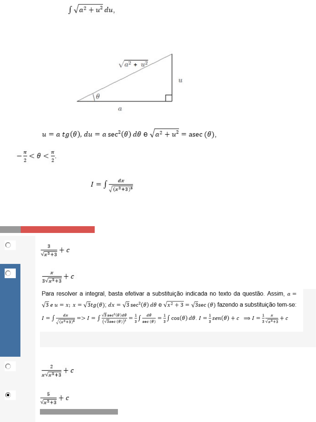 Questão 1/10 - Cálculo Integral Em integrais do tipo usa-se o método de integração por substituição trigonométrica e um dos casos considera a situação representada na figura a seguir: Nesse caso, com Considere a seguinte integral: Referência: Livro-Base, p. 170. A integral I, mostrada acima, é igual: Nota: 0.0Você não pontuou essa questão A B Referência: Livro-Base, p. 170. C D Você assinalou essa alternativa (D) E Questão 2/10 - Cálculo Integral Leia o enunciado a seguir: "A função representam um grupo de funções para descrever funções potenciais na Física". Fonte: livro-base, p. 22. Considere o enunciado acima e os conteúdos do livro-base Elementos de Cálculo Diferencial e Integral, o gráfico que corresponde à função f(x) apresentada acima é: Nota: 10.0 A B Você assinalou essa alternativa (B) Você acertou! (livro-base, p. 22) C D E Questão 3/10 - Cálculo Integral Leia o texto: Considere a seguinte equação diferencial: f′(x)=6x2+x−5�′(�)=6�2+�−5 Fonte: Texto elaborado pelo autor da questão. Considerando esta informação e os conteúdos do livro-base Tópicos de cálculo I, sobre integrais, assinale a alternativa que apresenta, corretamente, a solução da equação diferencial sujeita à condição inicial f(0)=2. Nota: 10.0 A f(x) = 2x³ B f(x) = - 5x C f(x) = 2 D f(x)=2x3+x22−5x+2�(�)=2�3+�22−5�+2 Você assinalou essa alternativa (D) Você acertou! Aplicando a integração indefinida, temos: ∫f′(x)dx=∫6x2+x−5dxf(x)=2x3+x22−5x+Cf(0)=20+0−0+C=2→C=2f(x)=2x3+x22−5x+2(livro−base, p. 132)∫�′(�)��=∫6�2+�−5���(�)=2�3+�22−5�+��(0)=20+0−0+�=2→�=2�(�)=2�3+�22−5�+2(�����−����, �. 132) E f(x) = x² Questão 4/10 - Cálculo Integral Leia o fragmento de texto a seguir: "No método de integração por partes, tem-se que ∫udv=uv−∫vdu,∫���=��−∫���, sendo u� e v� funções deriváveis num intervalo aberto. Considere a seguinte integral I=∫ln(x)dx.�=∫ln(�)��." Fonte: Elementos de Cálculo Diferencial e Integral, p. 155. (LIVRO-BASE p. 155) De acordo com o fragmento acima e o livro-base Elementos de Cálculo Diferencial e Integral, a integral I� vale: Nota: 10.0 A x(ln(x)−x)+c.�(ln(�)−�)+�. B x(ln(x)+1)+c.�(ln(�)+1)+�. C x(ln(x)−x2)+c.�(ln(�)−�2)+�. D x(ln(x)−3x)+c.�(ln(�)−3�)+�. E x(ln(x)−1)+c.�(ln(�)−1)+�. Você assinalou essa alternativa (E) Você acertou! Aplica-se integração por partes da seguinte forma:u=ln(x); du=dxx; dv=dx e v=x.�=ln(�); ��=���; ��=�� e �=�. Com isso, ∫ln(x)dx=xln(x)−∫xdxx=xln(x)−∫dx=xln(x)−x+c=x(ln(x)−1)+c.∫ln(�)��=�ln(�)−∫����=�ln(�)−∫��=�ln(�)−�+�=�(ln(�)−1)+�. (LIVRO-BASE p. 155) Questão 5/10 - Cálculo Integral Leia a seguinte passagem de texto: A região R� limitada pela curva y=x2+2�=�2+2 e o eixo dos x, x=0 e x=2�=0 � �=2 e por ao ser rotacionada em torno do eixo dos x, gera um sólido de revolução dado por:V=π∫ba[f(x)]2dx�=�∫��[�(�)]2�� onde a� e b� são os limites de integração. Após a avaliação, caso queira ler o texto integralmente, ele está disponível em Faccin, Giovani Manzeppi. Elementos de Cálculo Diferencial e Integral. Curitiba: Intersaberes, 2015, p. 189 Considerando as discussões realizadas na Videoaula 01 - Volume de Sólido de Revolução da Aula 04 - Aplicações de Integrais, assinale a alternativa que apresenta o volume do sólido de revolução gerado na rotação descrita acima. Nota: 10.0 A Você assinalou essa alternativa (A) Você acertou! (Livro-Base, p. 189). B C D E Questão 6/10 - Cálculo Integral Leia o fragmento de texto acima: "Uma das consequências do Teorema Fundamental do Cálculo é que, dada uma função integrável em que admite uma primitiva em " Fonte: (LIVRO-BASE p. 142). Considerando o fragmento acima e os conteúdos do livro-base Elementos de Cálculo Diferencial e Integral, a partir do resultado acima, determine o valor de Nota: 10.0 A B C Você assinalou essa alternativa (C) Você acertou! (LIVRO-BASE p. 142). D E Questão 7/10 - Cálculo Integral A integral indefinida mostrada a seguir corresponde ao resultado do processo de otimização de um produto vendido no mercado e diz respeito à quantidade desse produto num intervalo I. Referência: Livro-Base, p. 147. A expressão matemática que representado a quantidade desse produto no intervalo considerado é: Nota: 10.0 A Você assinalou essa alternativa (A) Você acertou! Referência: Livro-Base, p. 147. B C D E Questão 8/10 - Cálculo Integral Leia o texto: Considere a seguinte integral indefinida: ∫tgxsecx dx∫������� �� Fonte: Texto elaborado pelo autor da questão. Considerando esta informação e os conteúdos do livro-base Tópicos de cálculo I, sobre integrais, assinale a alternativa que apresenta, corretamente, a solução da integral considerada. Nota: 10.0 A sen x + C B tg x + C C sec x + C D cossec x + C E - cos x + C Você assinalou essa alternativa (E) Você acertou! Escrevendo em função de seno e cosseno, temos: ∫tgxsecx dx=∫cosx.senxcosx dx=∫senx dx=−cosx+C(livro−base, p. 128)∫������� ��=∫����.�������� ��=∫���� ��=−����+�(�����−����, �. 128) Questão 9/10 - Cálculo Integral Observe o enunciado a seguir: A função senoidal descreve o relevo de uma superfície irregular de um determinado cristal. Livro-Base: p. 79. Considerando o enunciado acima e os conteúdos do livro-base Elementos de Cálculo Diferencial e Integral, a partir do processo de derivação sucessiva, a derivada de segunda ordem da função apresentada a acima é igual a Nota: 10.0 A B C D E Você assinalou essa alternativa (E) Você acertou! Livro-Base: p. 79. Qu